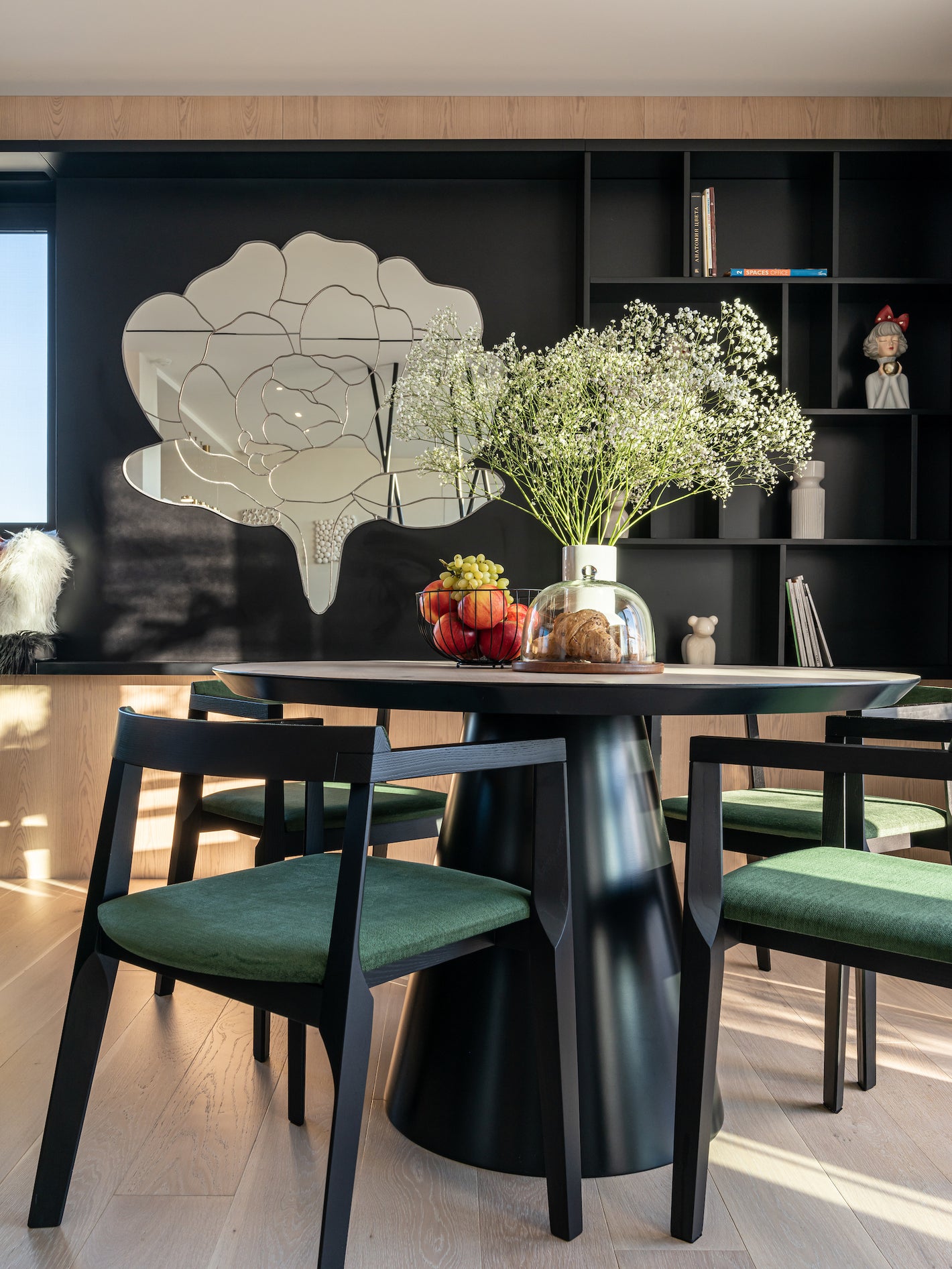 The circle appears as a prominent element that goes beyond just the tabletop; it extends to the chairs, candle holders, and repeating in the form of lighting. The circle holds deep cultural significance in various societies, representing the worship of the sun. In this sunlit interior, the circular shape finds its rightful place, harmonising with the abundant natural lighting that bathes the apartment throughout the day.