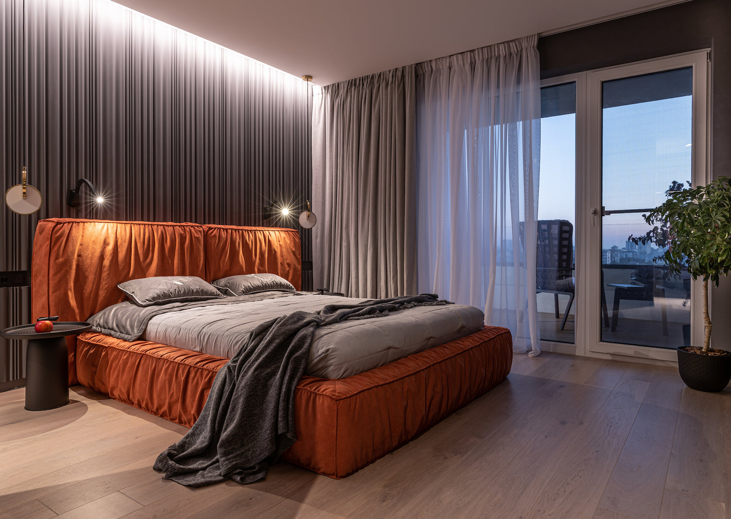 In terms of lighting, we incorporated a combination of central ceiling lighting, minimalist wall sconces, and a floor lamp. This allowed us to create a different ambiance and highlight specific areas of the room during evening hours.