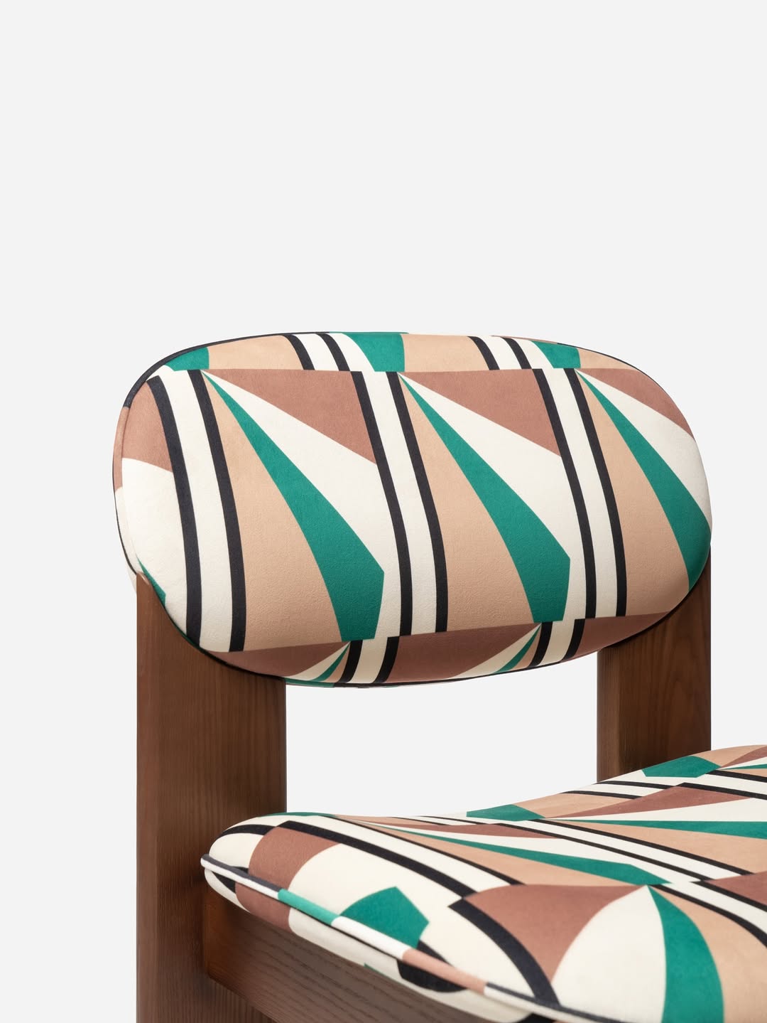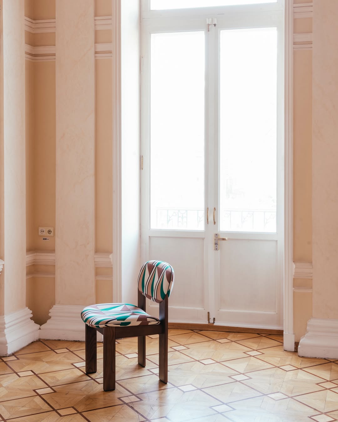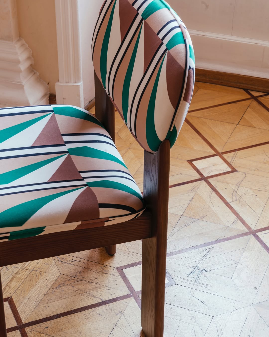 The archival fabric and wallpaper collection, developed in collaboration with the Ivan Franko Theatre and TheO Wallpapers, brings back early 20th-century abstractions, with each textile reflecting the vision of different artists of that era. Upholstered in these bold geometric patterns, the sculptural Archipen Chair becomes a gallery-worthy piece for cultural spaces, yet at the same time a refined dining chair that integrates seamlessly into a contemporary home interior.