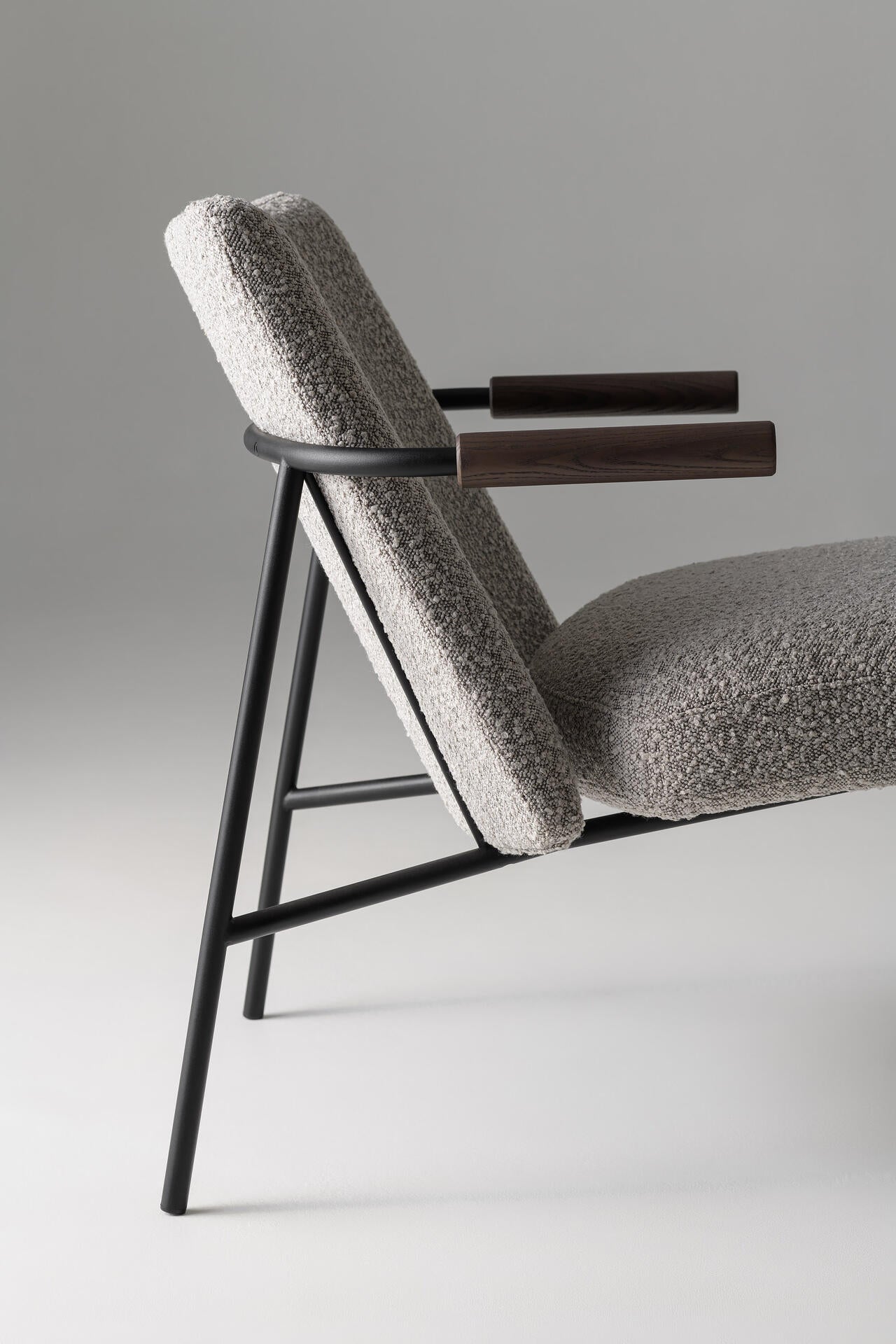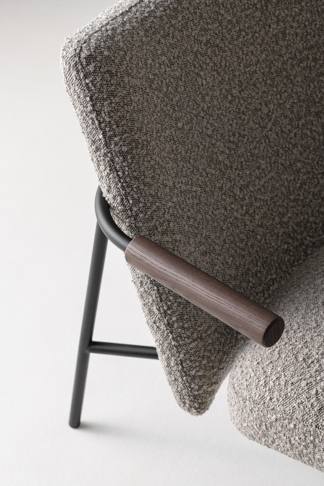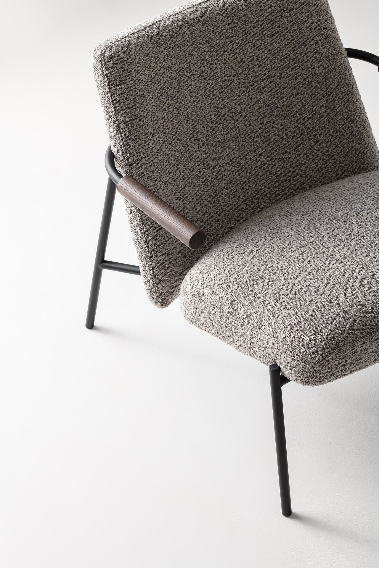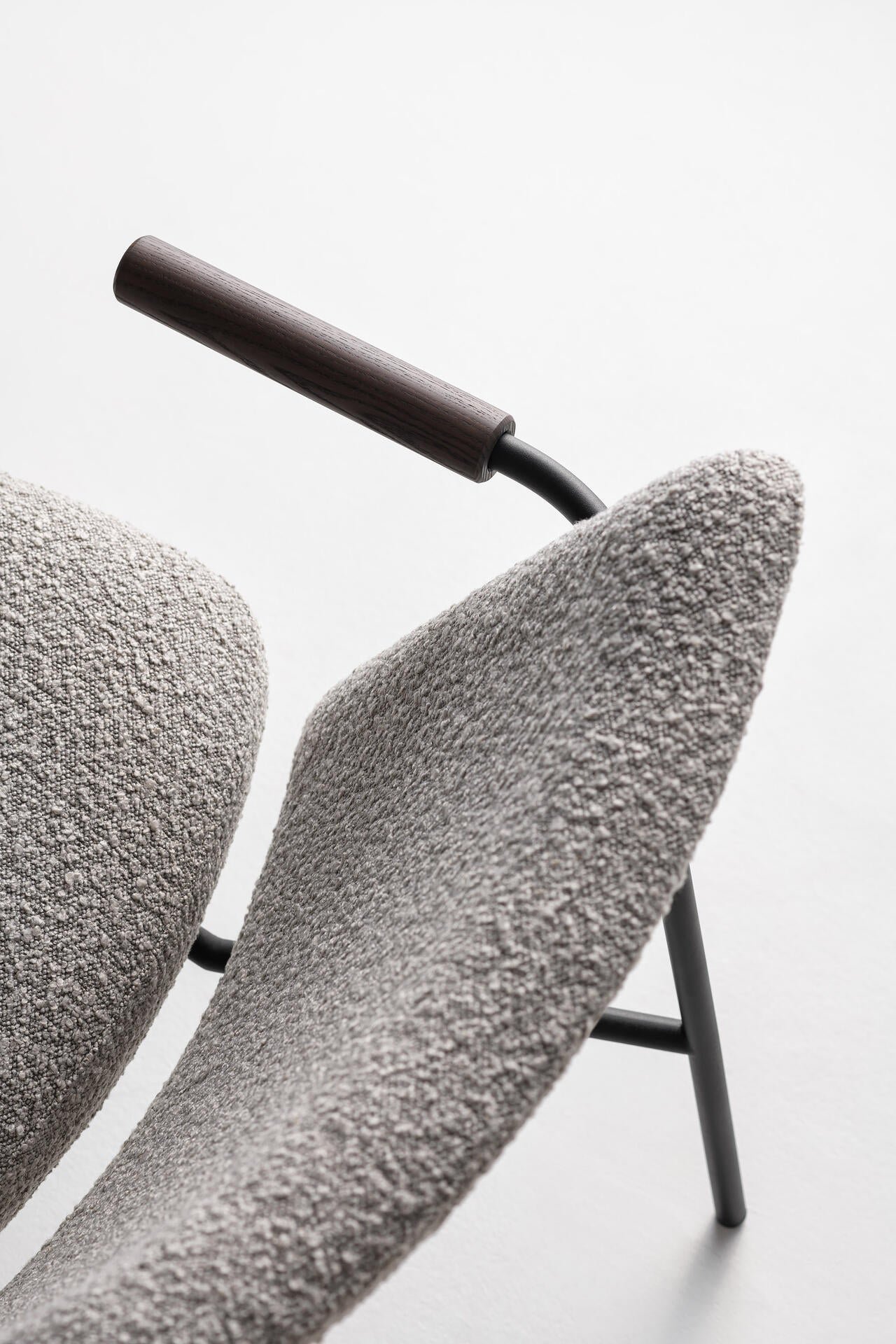 Featuring a metal frame with dynamically inclined rear legs, an upholstered seat, and back, the FRIENDLY armchair exudes modern elegance. The wooden armrests add a touch of warmth and sophistication, creating a striking visual appeal.