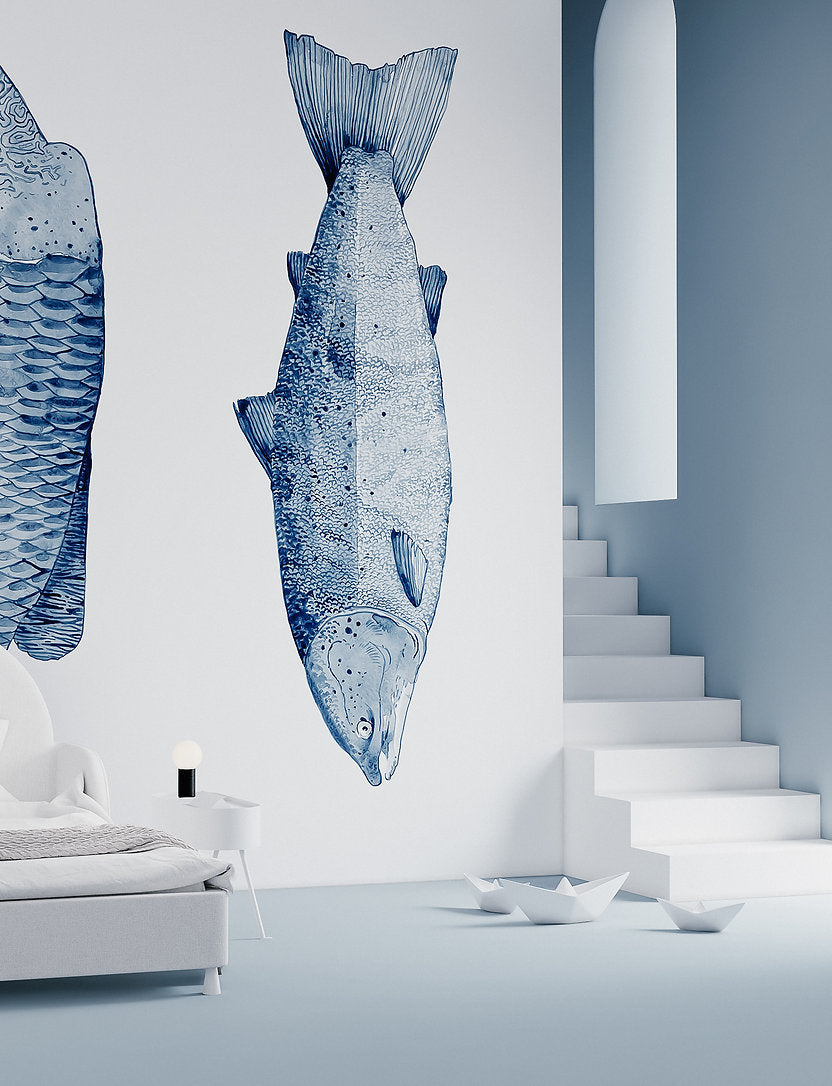 "Fishes" bathroom wallpapers by Yevhen Lytvynenko are a captivating blend of art and functionality inspired by Dutch ceramic paintings.