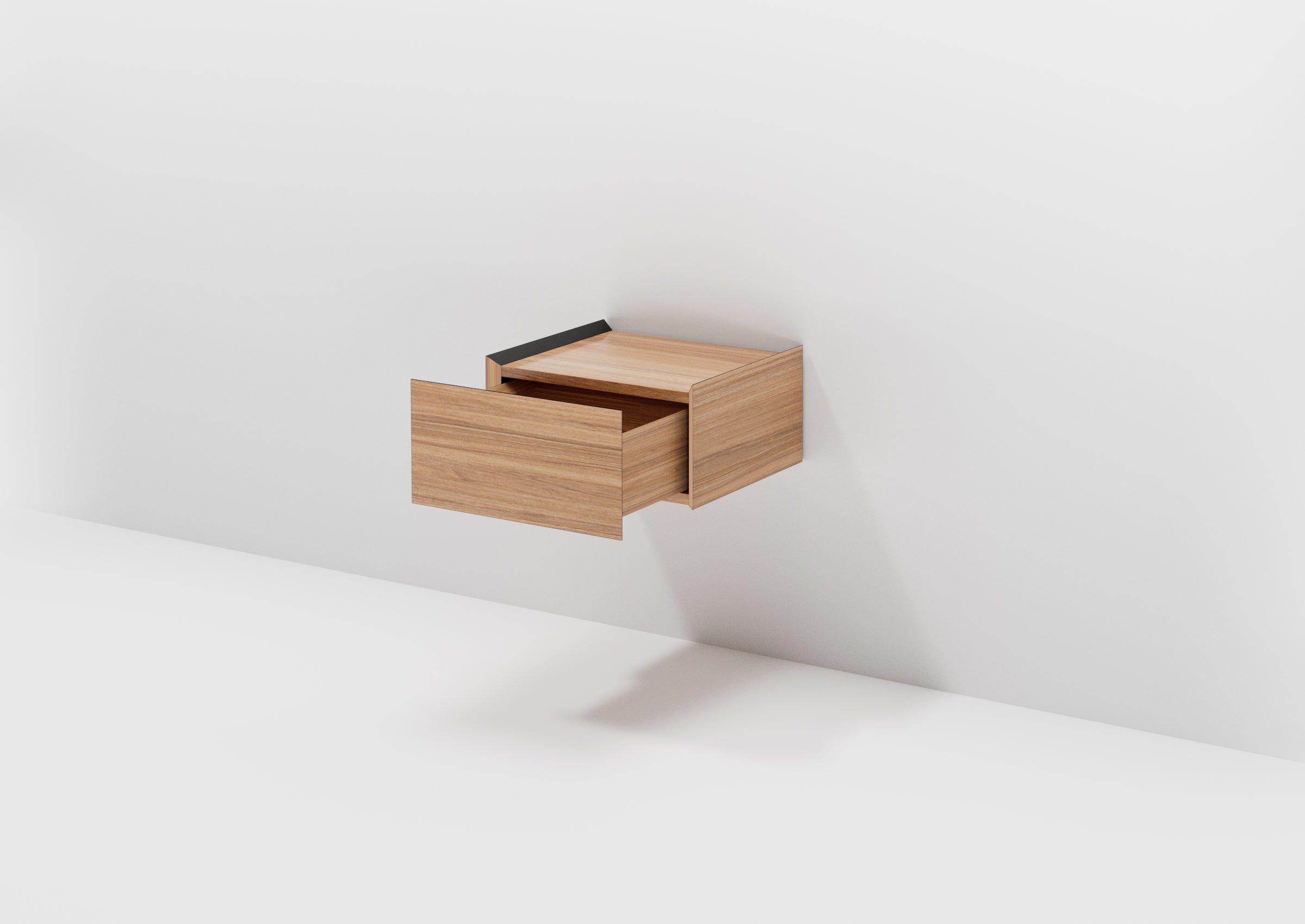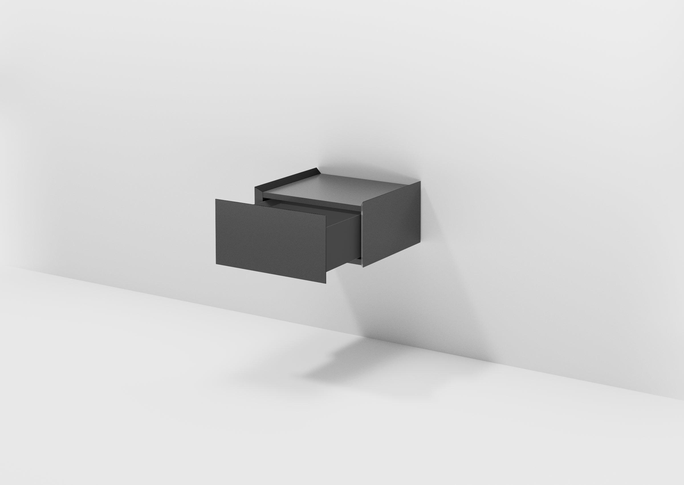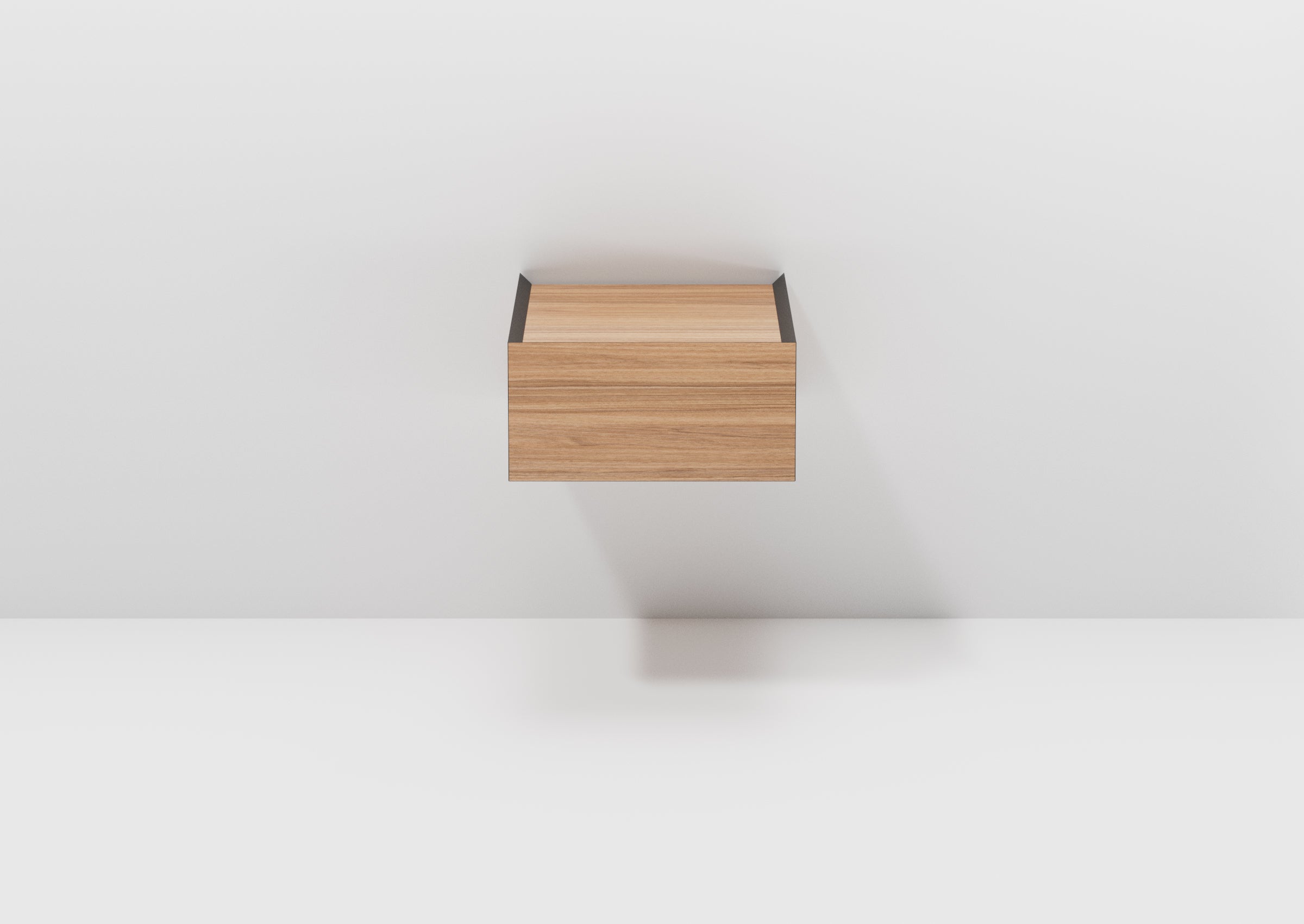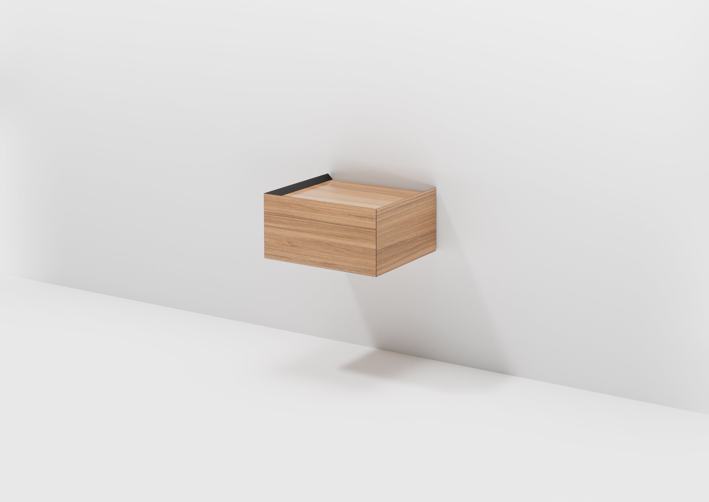 The wall-mounted bedside table Beta 1 features an elegant design, free of unnecessary decorations. The 45° edge design in the Beta series stands out, creating a raised border that gives the furniture a distinctive look. These are highly aesthetic pieces, and the tactile experience of opening them adds to the pleasure.