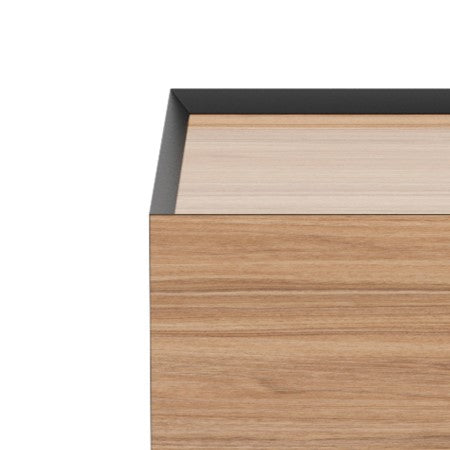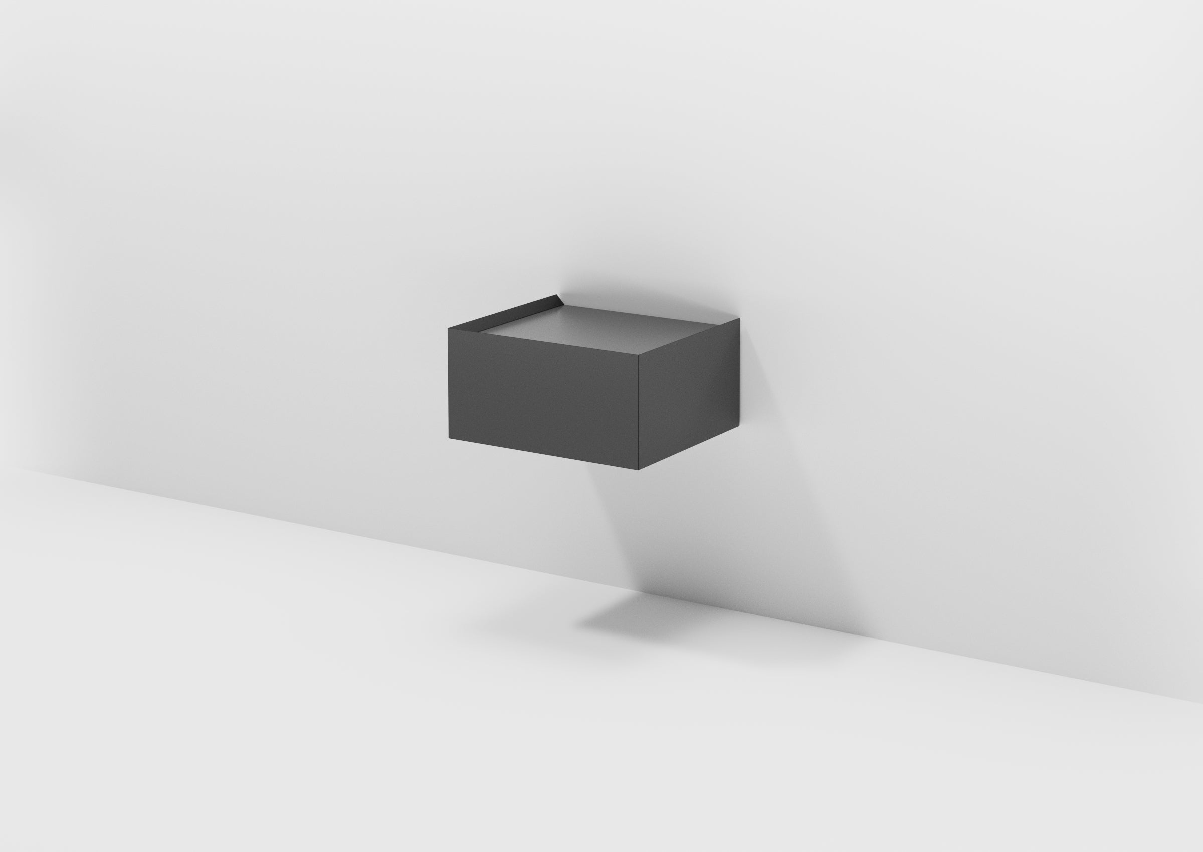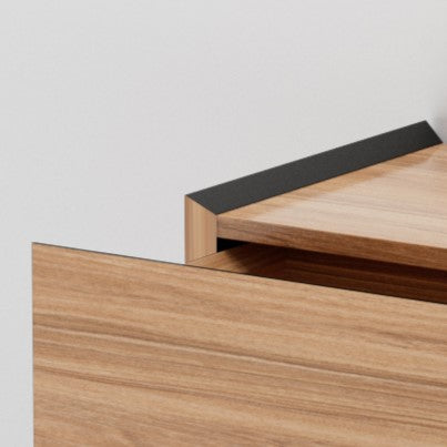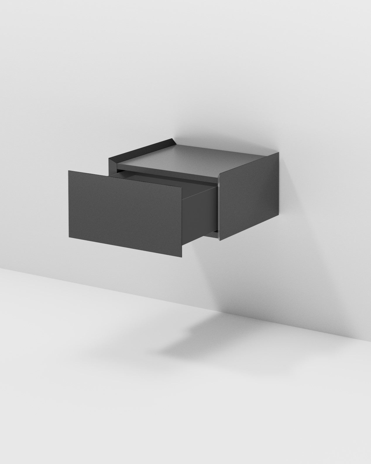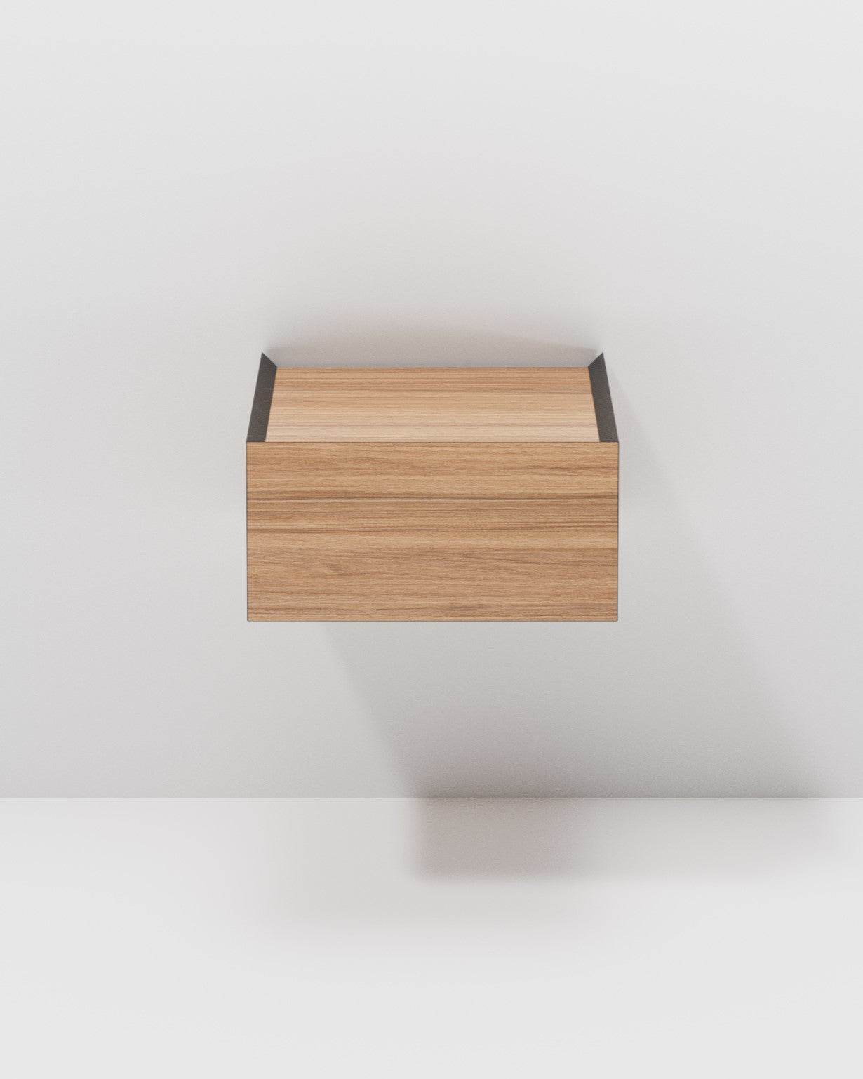 The wall-mounted bedside table Beta 1 features an elegant design, free of unnecessary decorations. The 45° edge design in the Beta series stands out, creating a raised border that gives the furniture a distinctive look. These are highly aesthetic pieces, and the tactile experience of opening them adds to the pleasure.