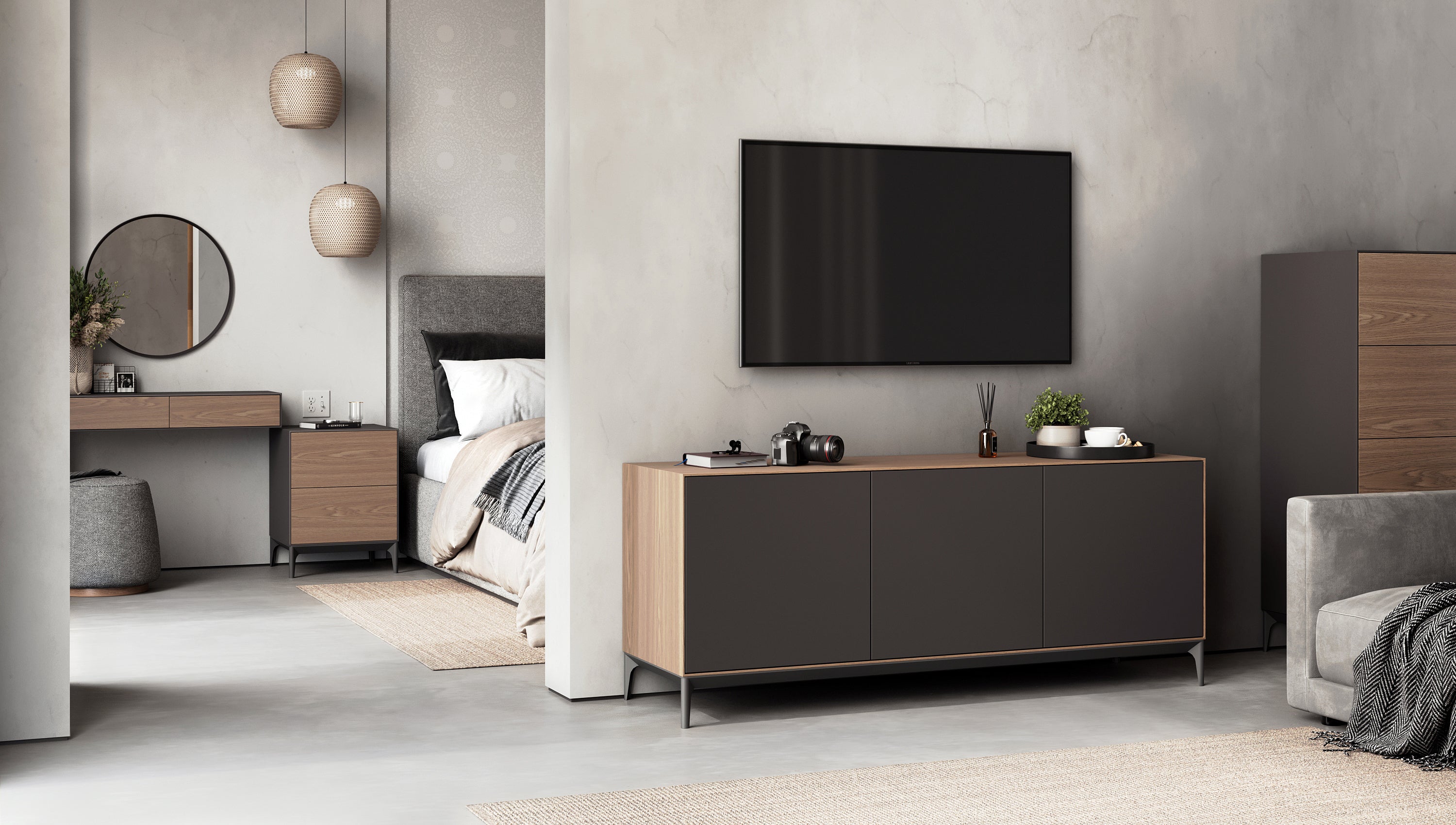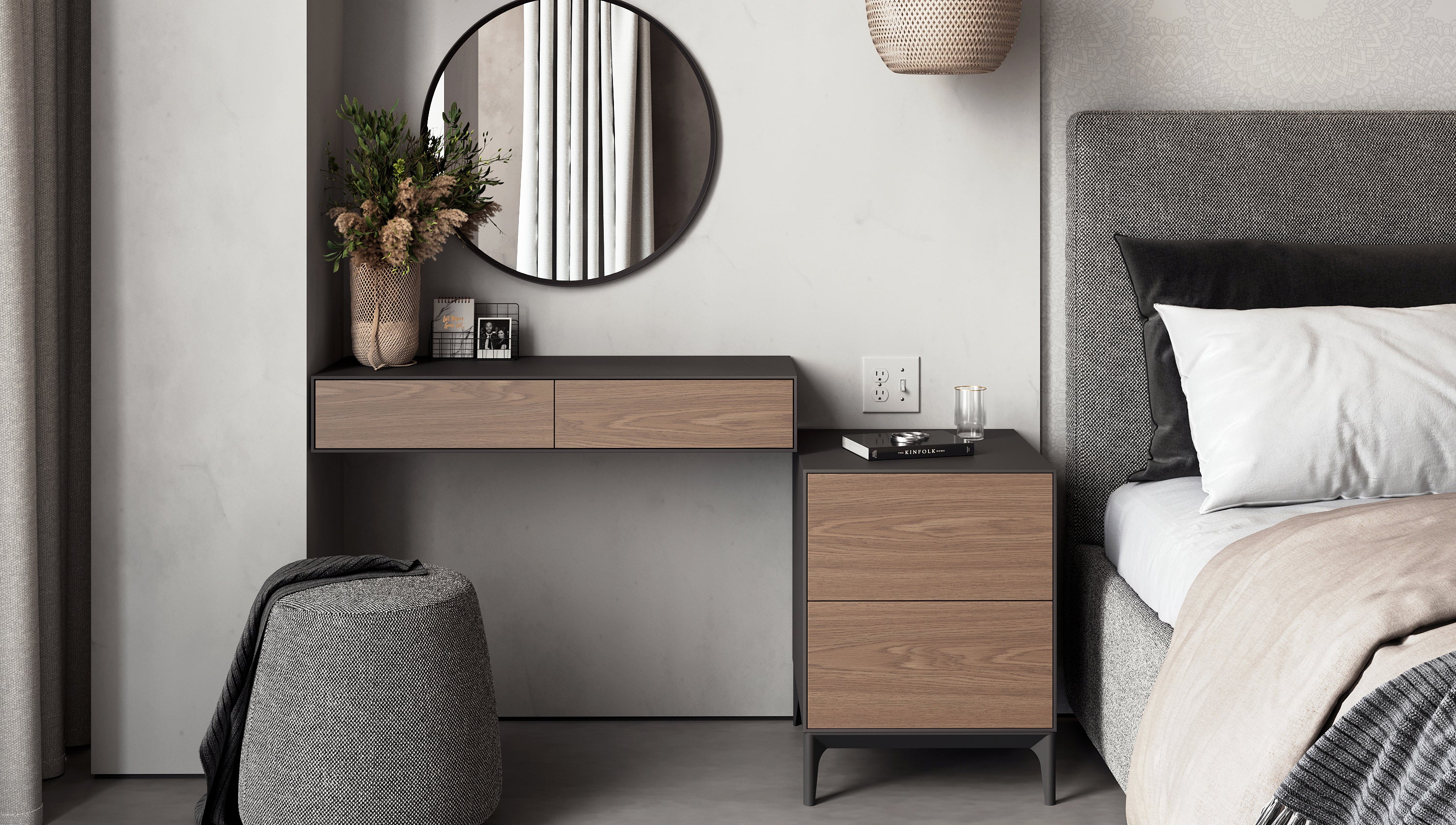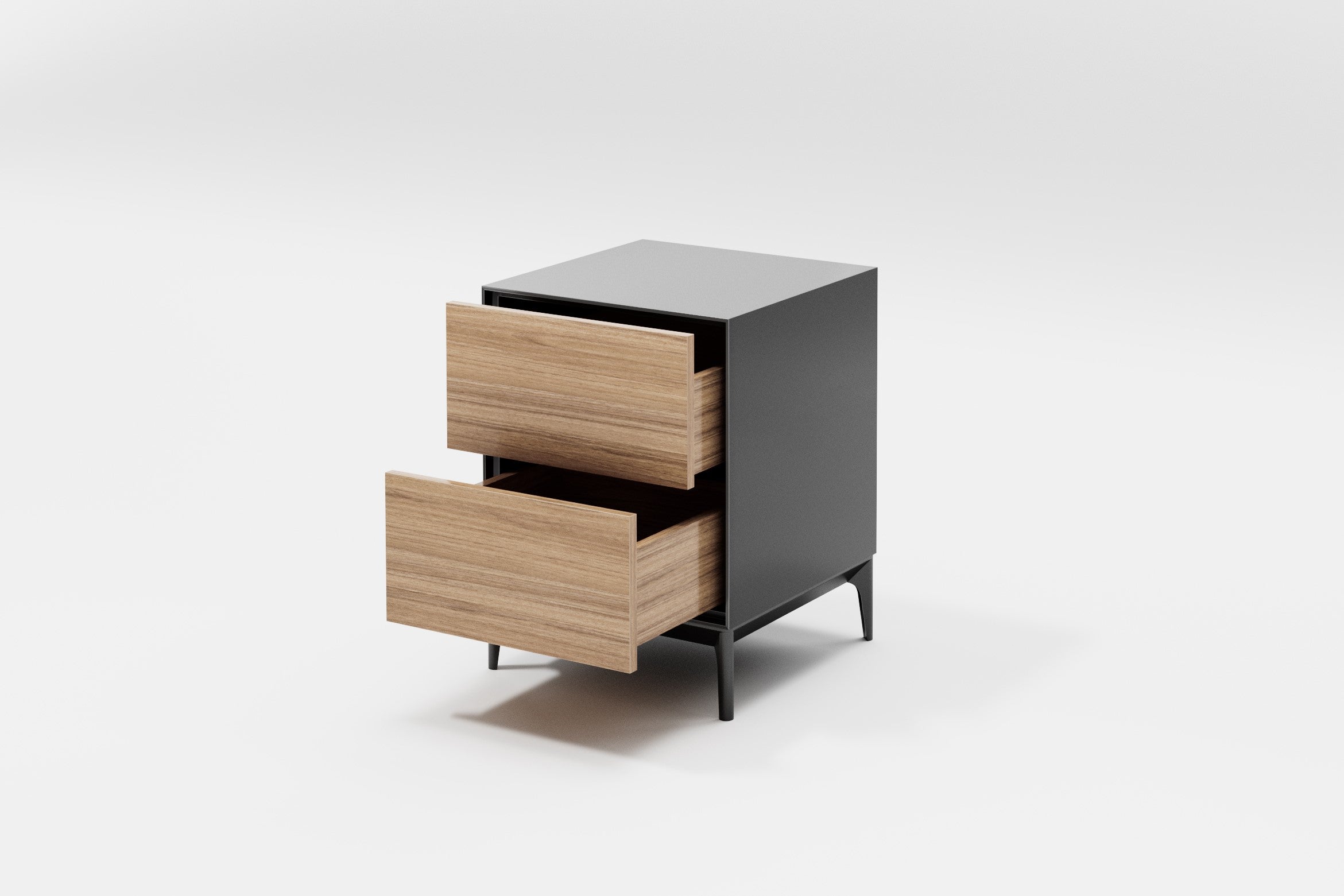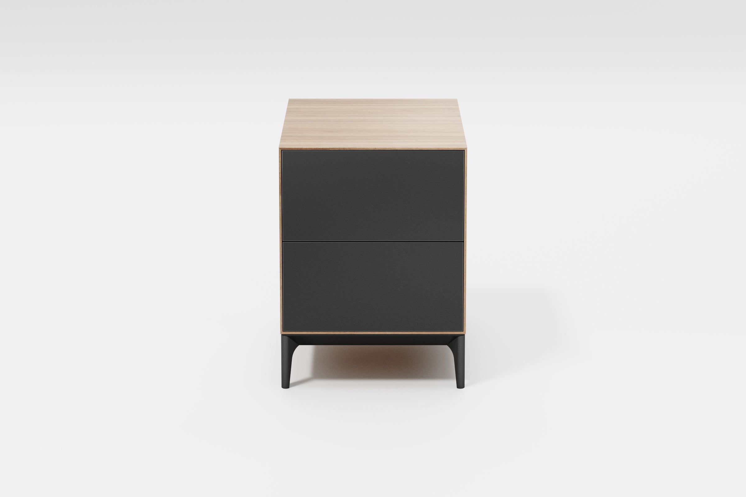The Gamma 1 bedside table, like the entire Gamma collection, has its own unique charm: the front panel is crafted in one colour – wood, while the side panels are in another – grey. And vice versa. This clever design is perfect for those who can’t decide which colour they prefer.