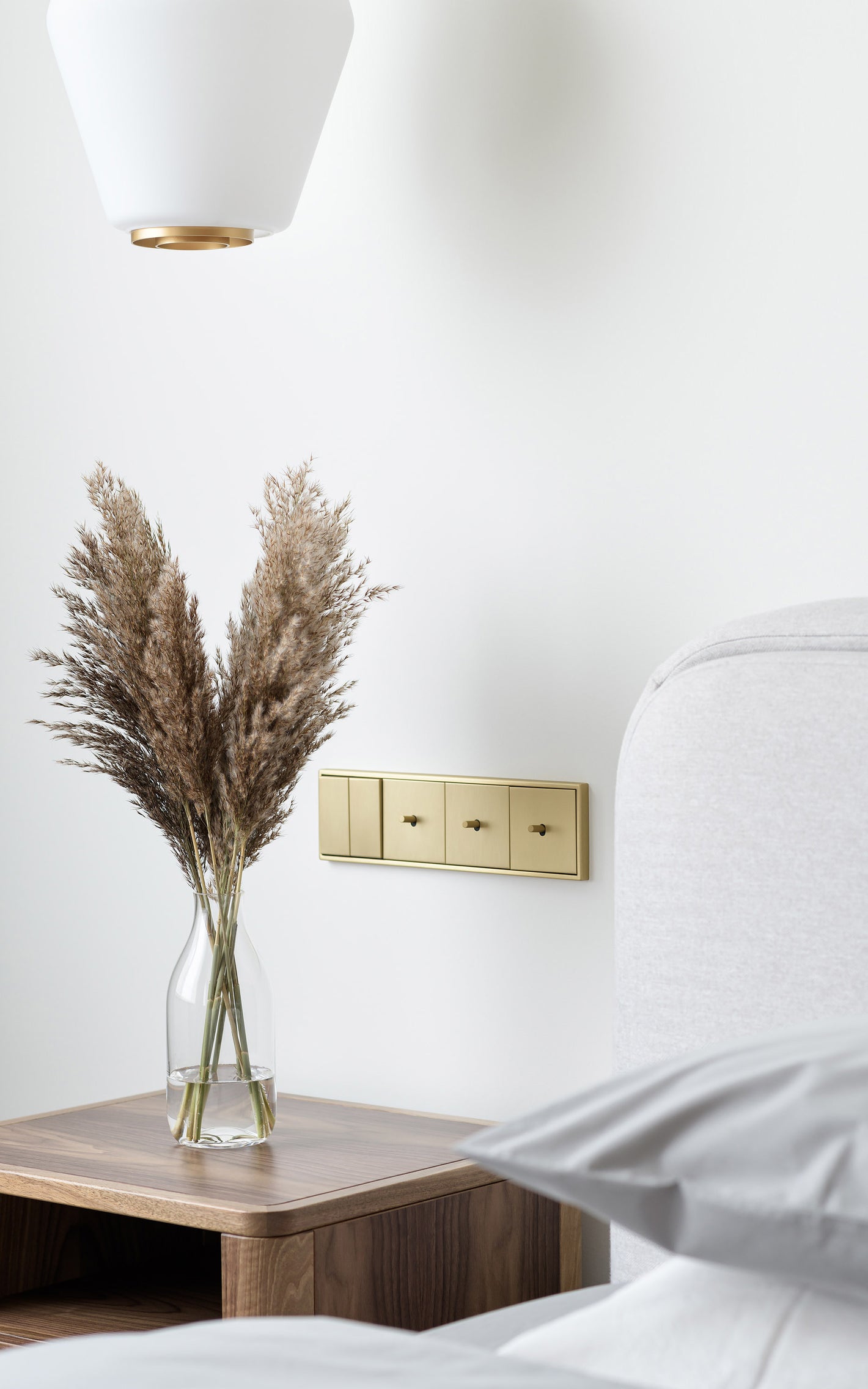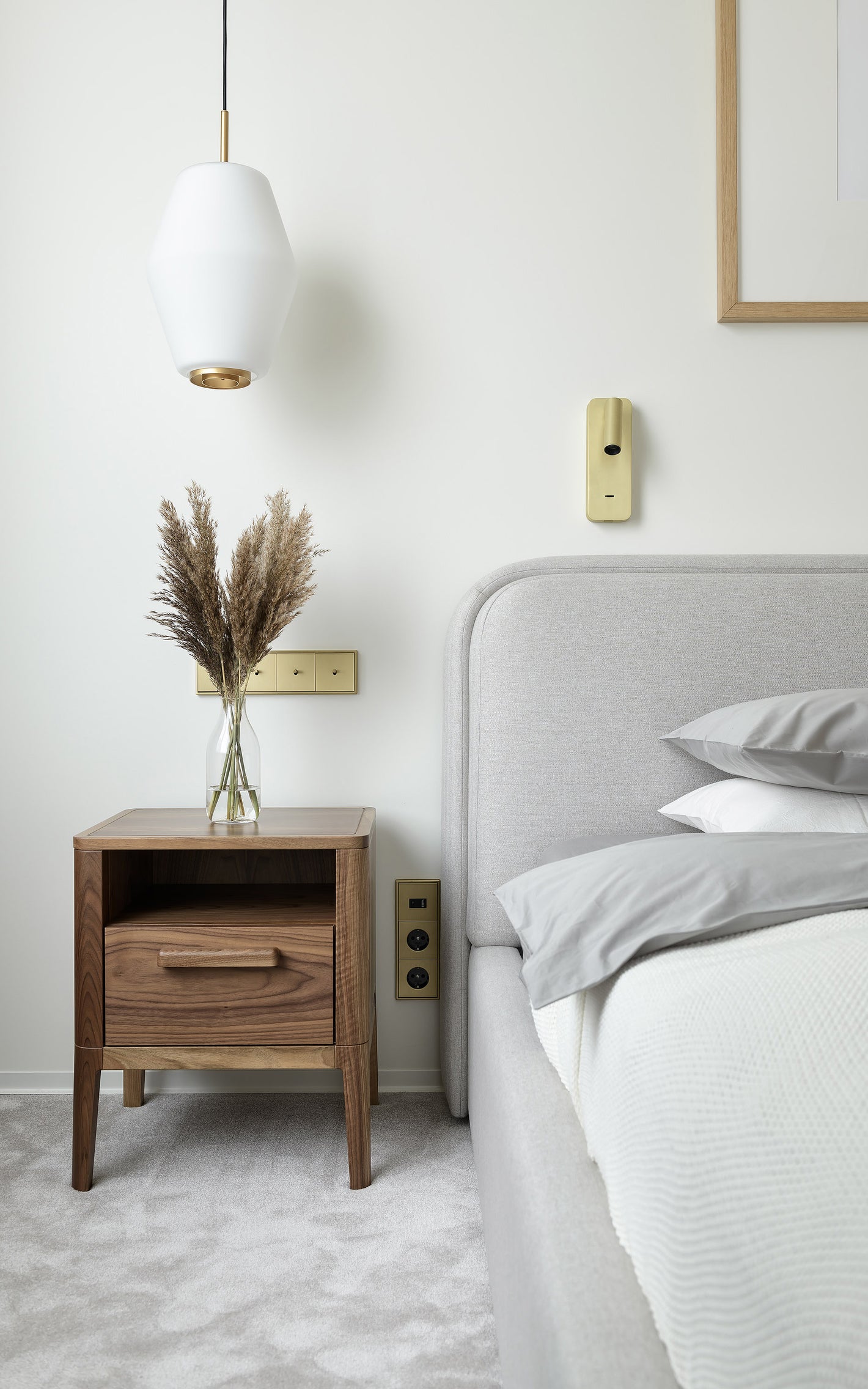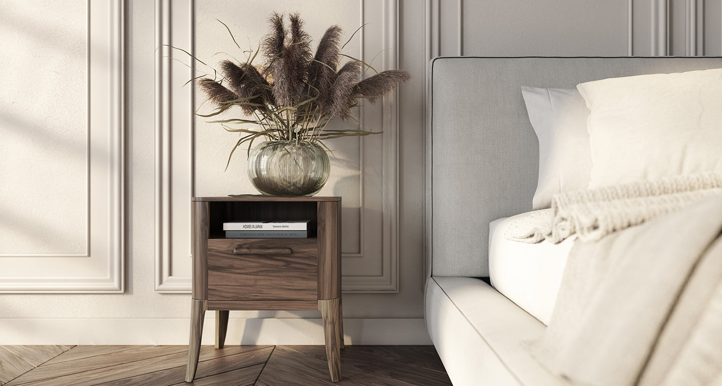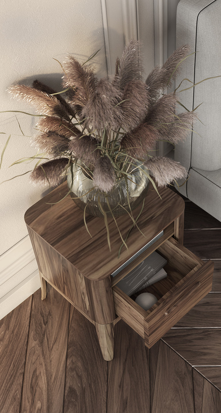 Like a brilliant sparkle in a symphony, Glare bedside table adds a touch of elegance and warmth to your interior. Crafted with walnut and adorned with warm gold accents, the bedside table shines with sophistication and beauty.