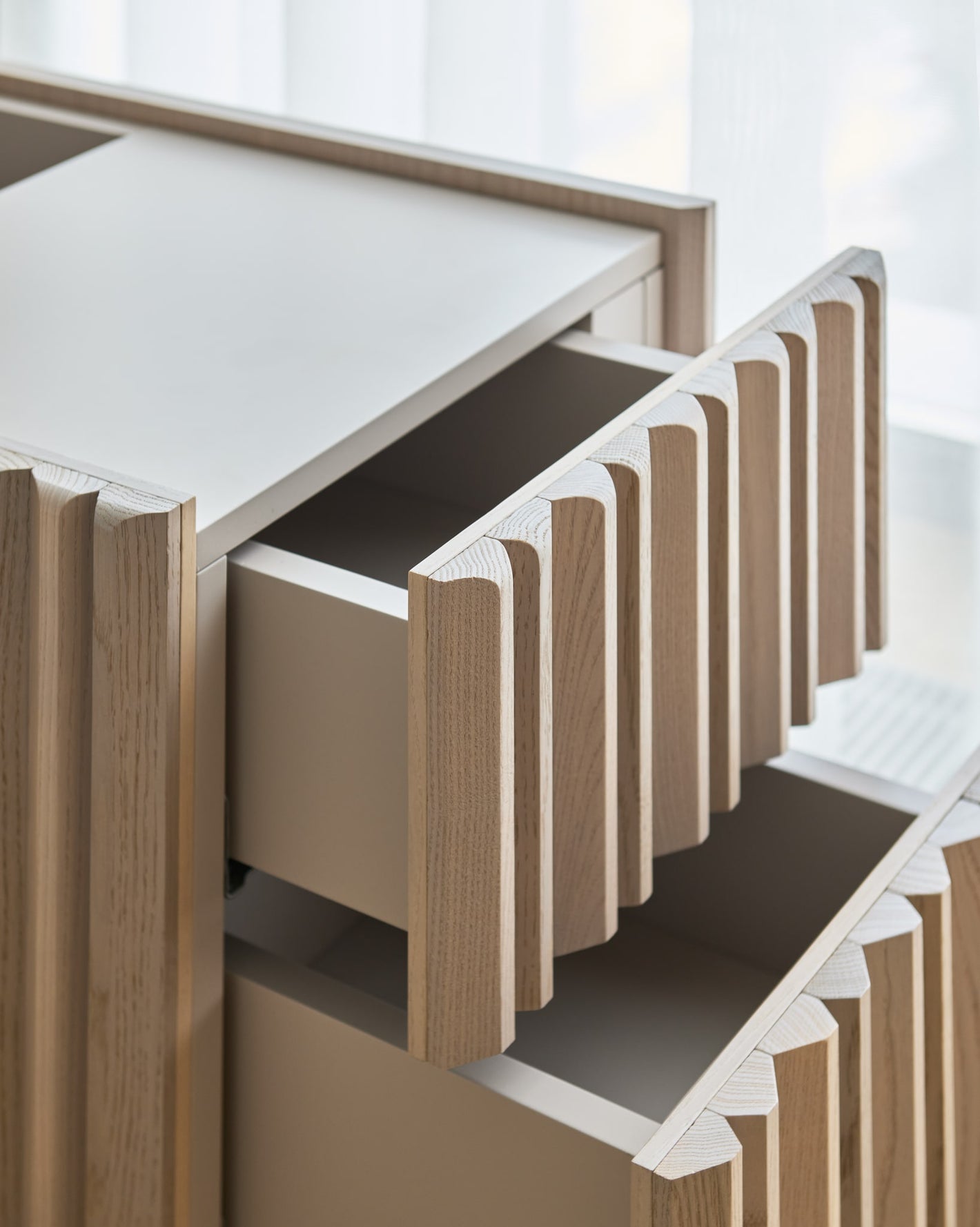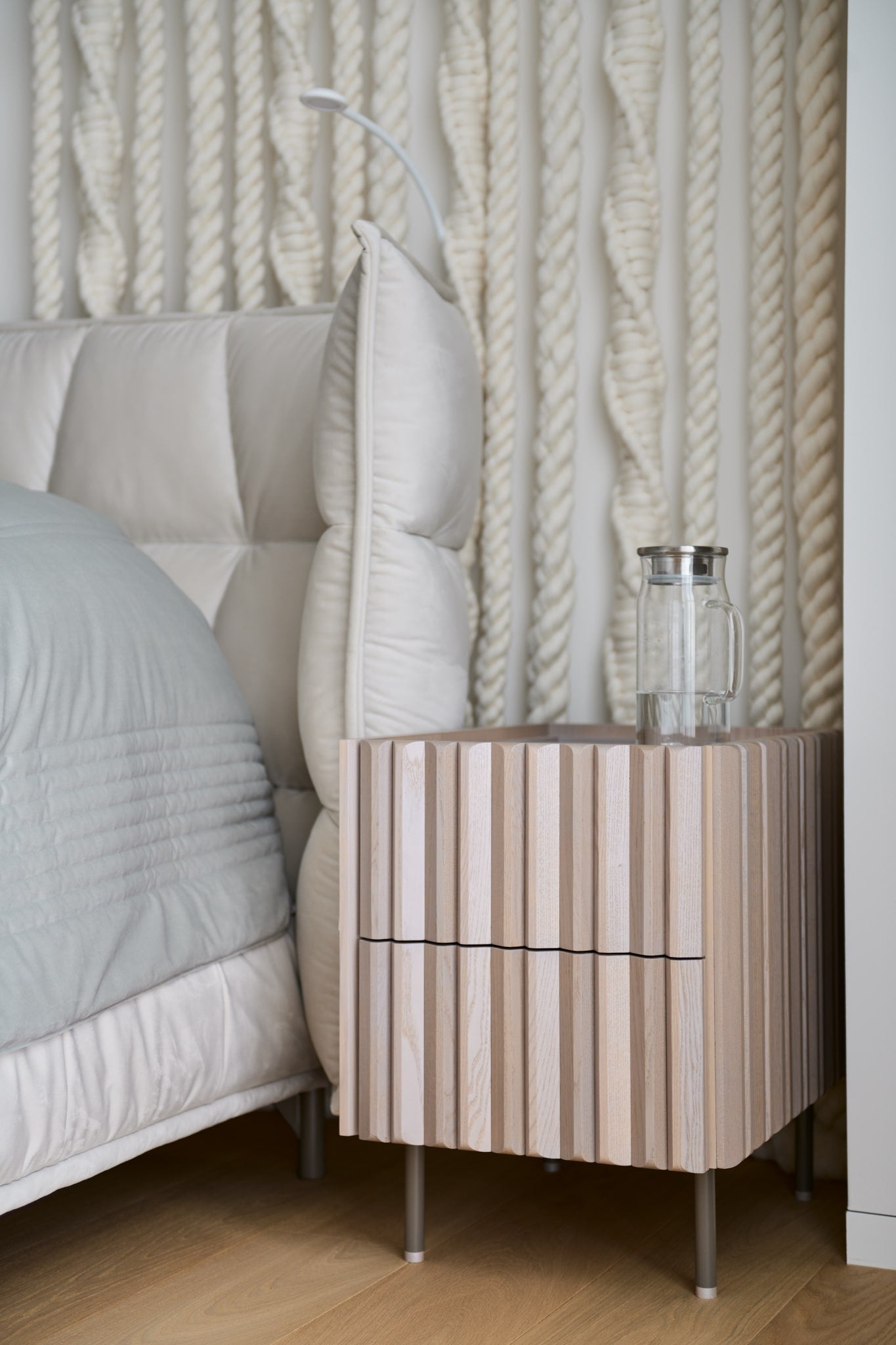 The bedside table is a logical continuation of the Pontelli furniture collection and the Pontelli wall panel that was created by Juanny Barcelo Borges based on the works of the famous artist Baccio Pontelli. Its timeless pattern has captivated interior enthusiasts with a penchant for wood aesthetics. Purposefully designed with comfort and functionality in mind, these bedside tables are a tailored addition to the bedroom domain. The meticulous design cleverly conceals light switches, sockets, and phone wallets, providing an uncluttered appearance. The front facade combines oak and ash, while the interior boasts MDF veneered with natural ash, harmonizing durability with elegance.