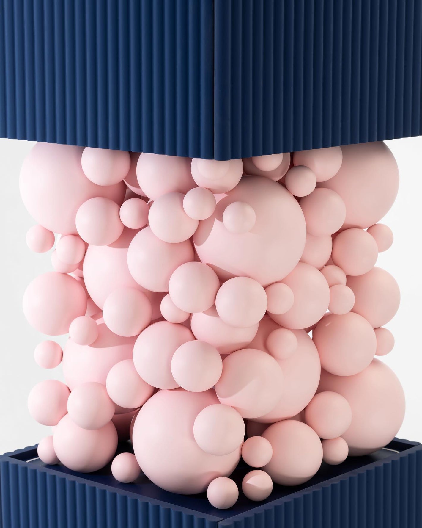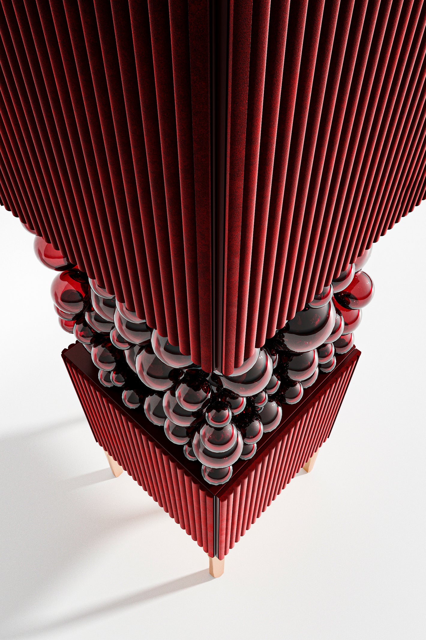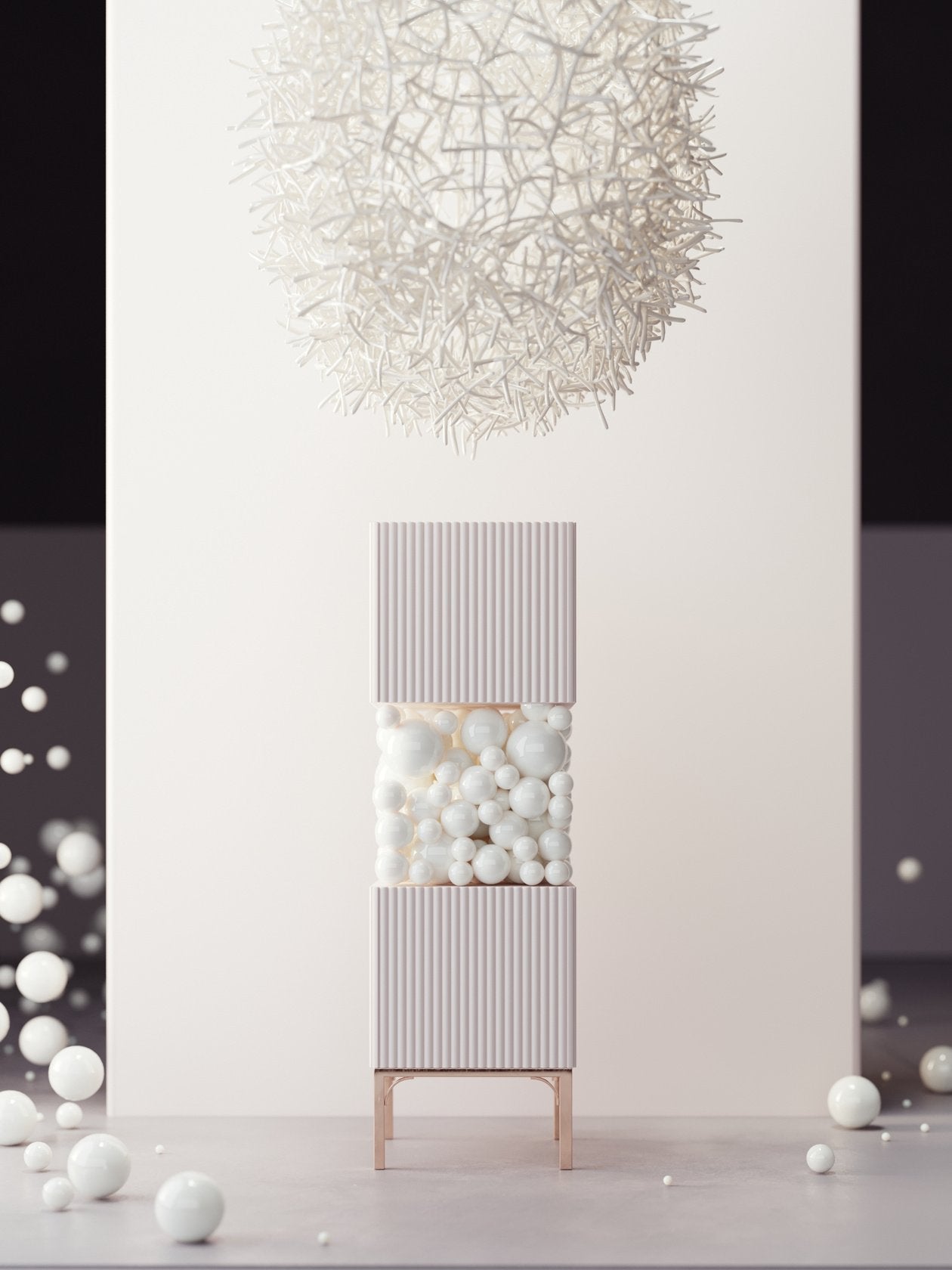 A mesmerizing arrangement of "bubbles" conceals the load-bearing console that gracefully bridges the two functional cubes of the cabinet. This dynamic interplay of shapes mirrors the whimsical layering of a delectable pastry's puffy cream.