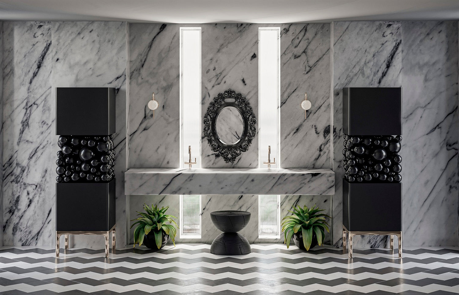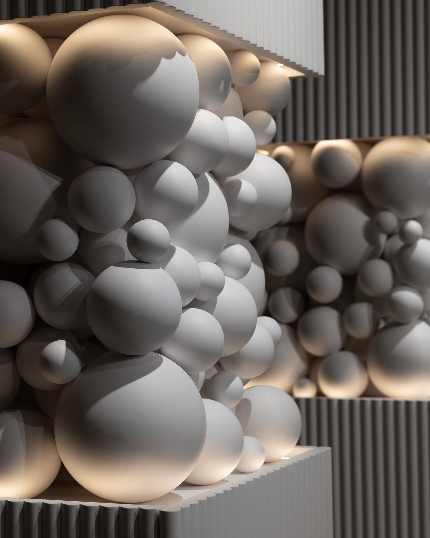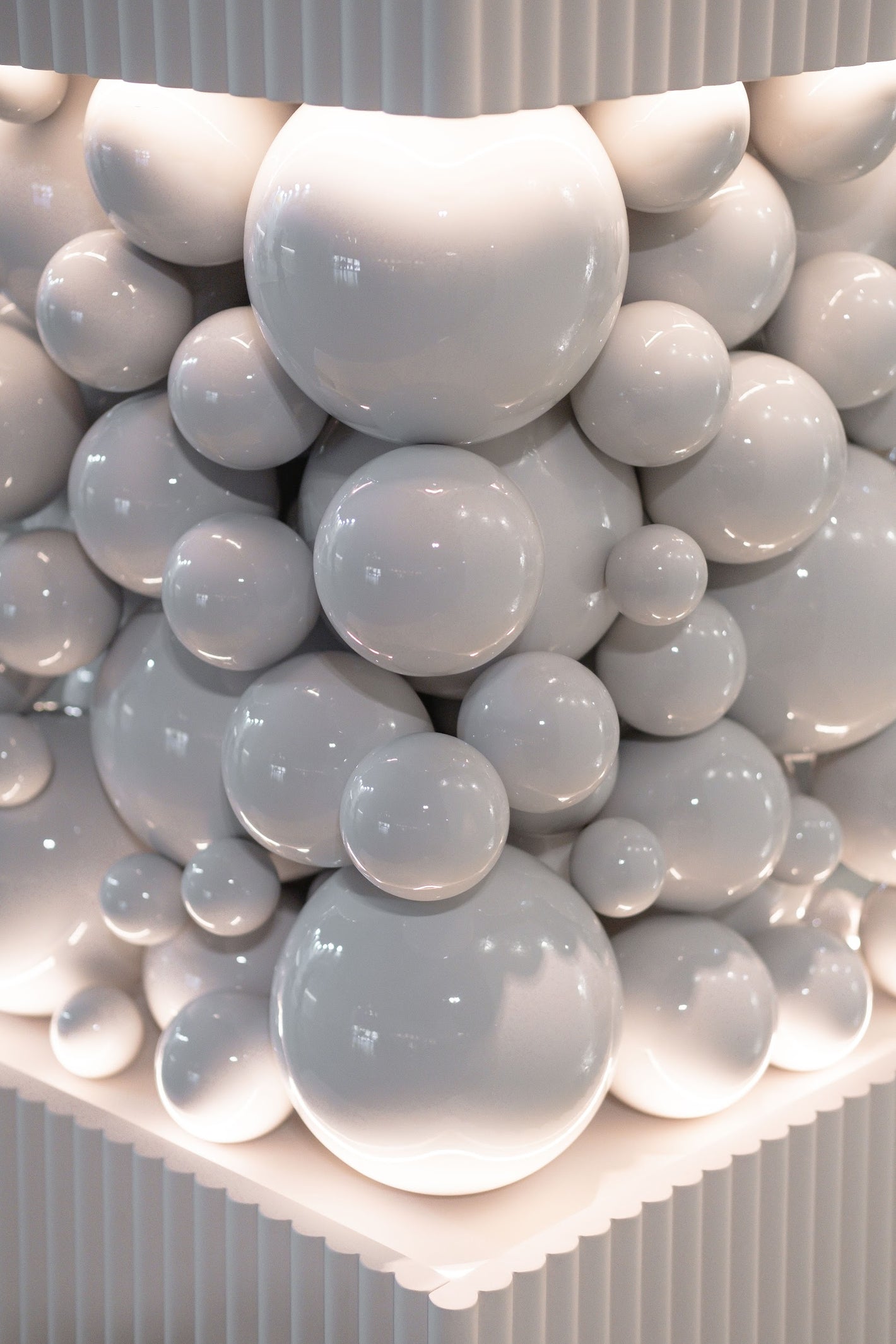 A mesmerizing arrangement of "bubbles" conceals the load-bearing console that gracefully bridges the two functional cubes of the cabinet. This dynamic interplay of shapes mirrors the whimsical layering of a delectable pastry's puffy cream.