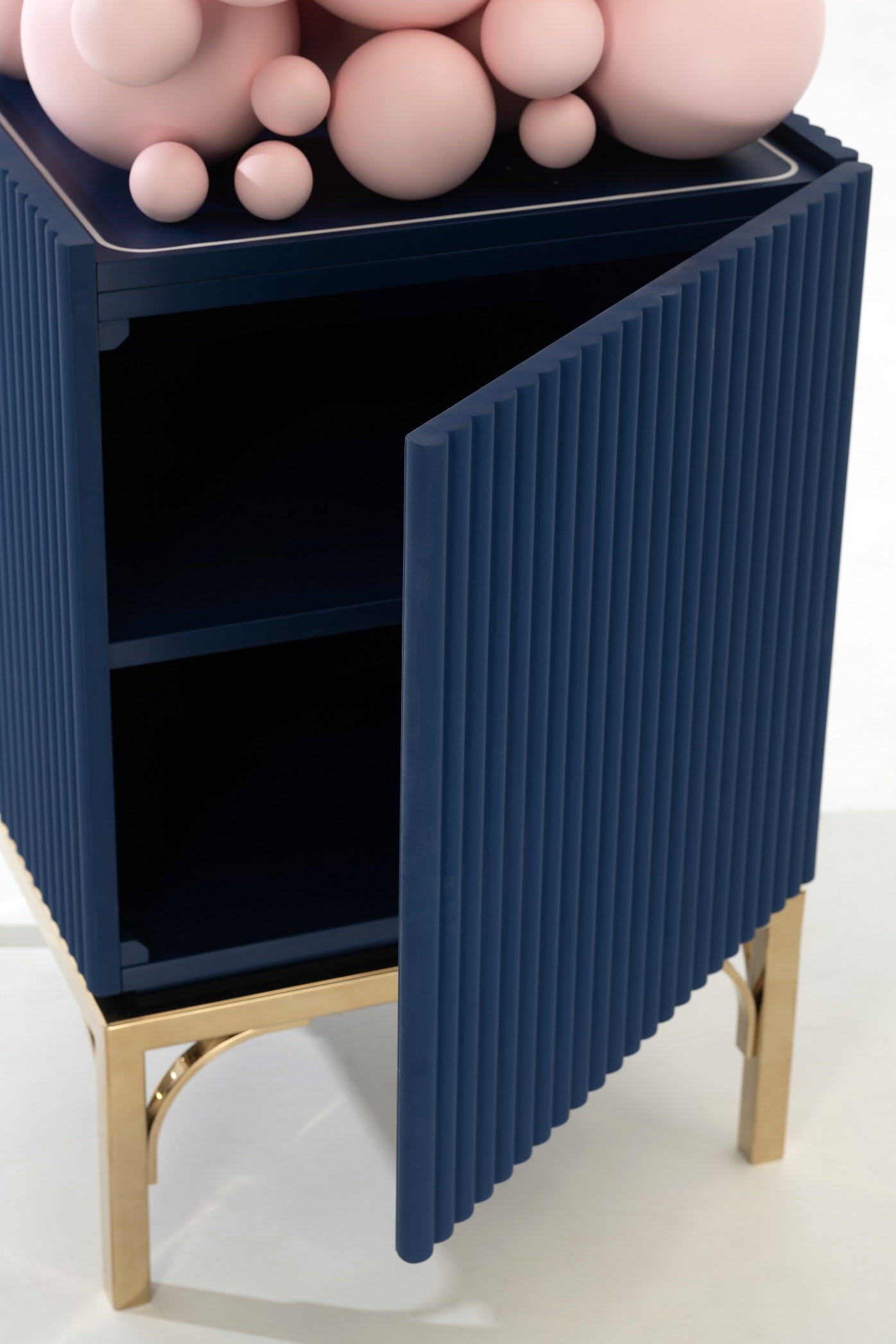 Crafted from premium materials, including MDF milled body in a stunning RAL color finish, brass accents, and elegantly painted "bubbles," this cabinet is a delightful blend of form and function. LED lighting adds a touch of magic, turning your everyday storage into an illuminating experience.