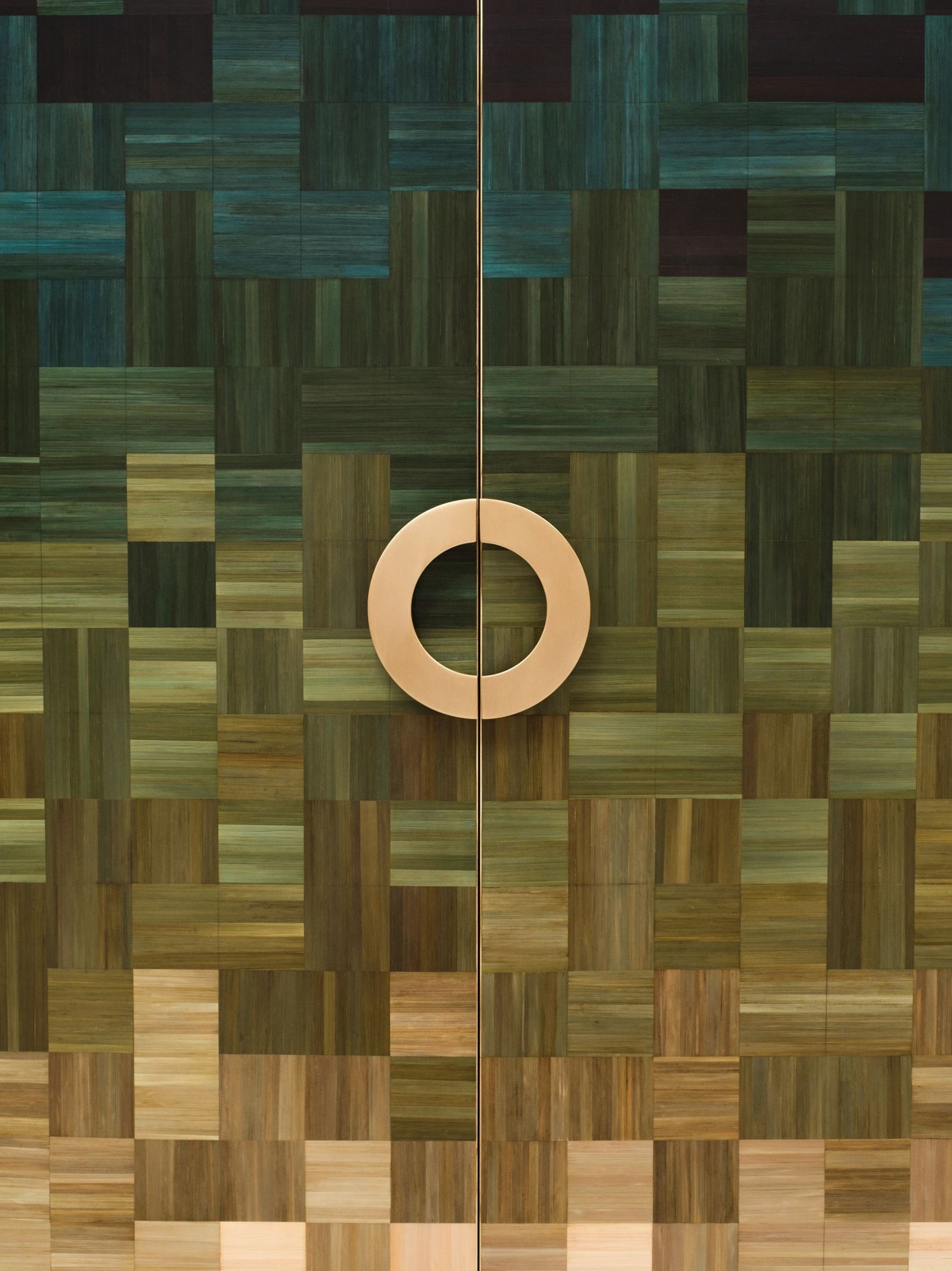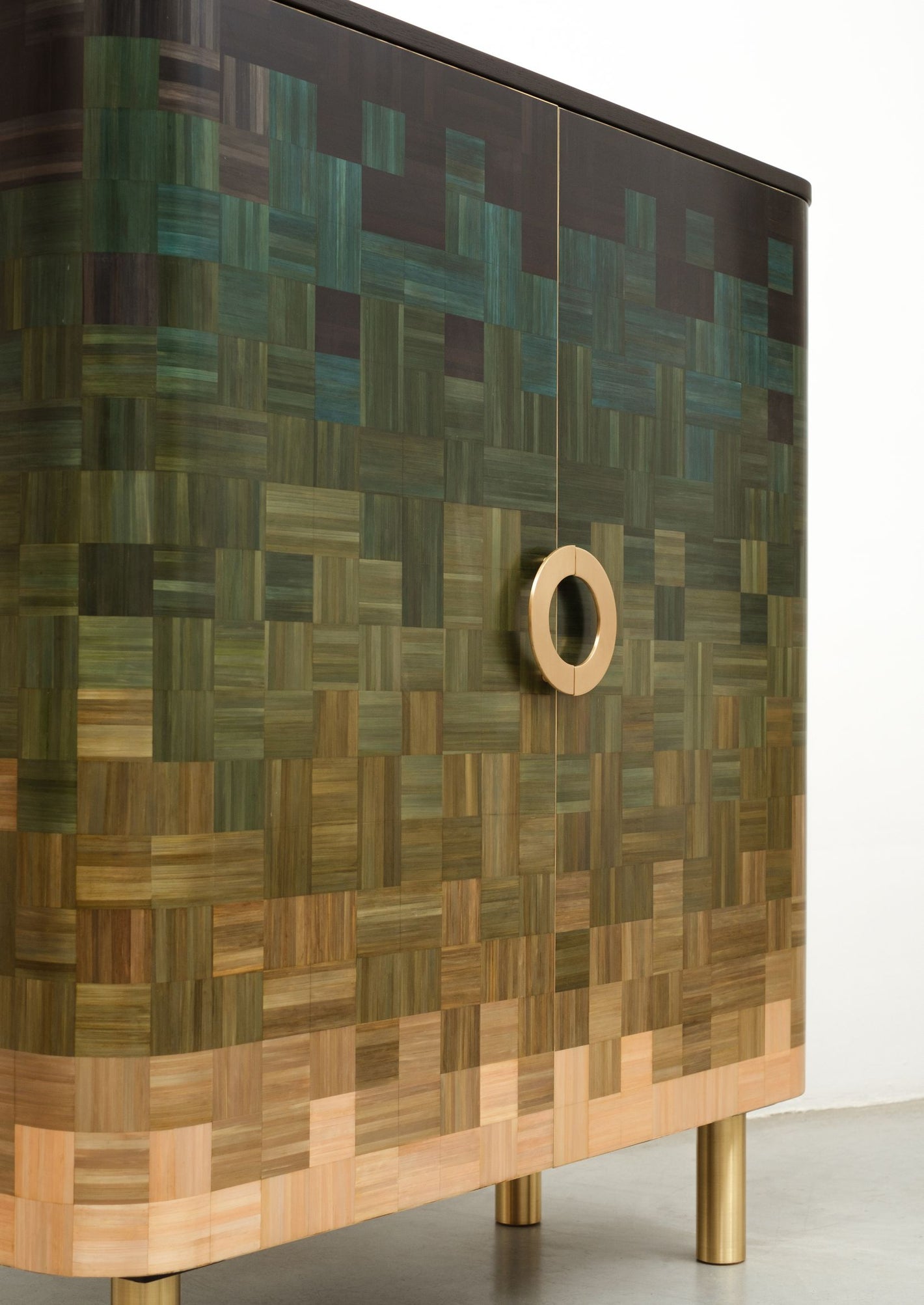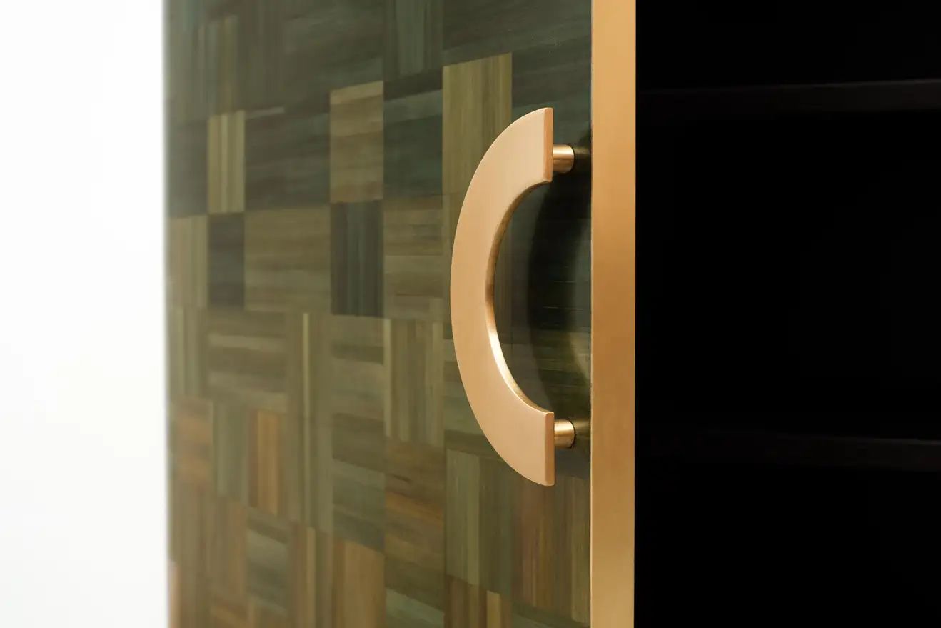 The NATŪRA cabinet takes us back to contemplating nature, as its inlay gently shimmers gradually reflecting from black patina through to forest greens to golden wheat. Polished brass legs and handles complete the piece ensuring that it will accentuate any setting it graces.
