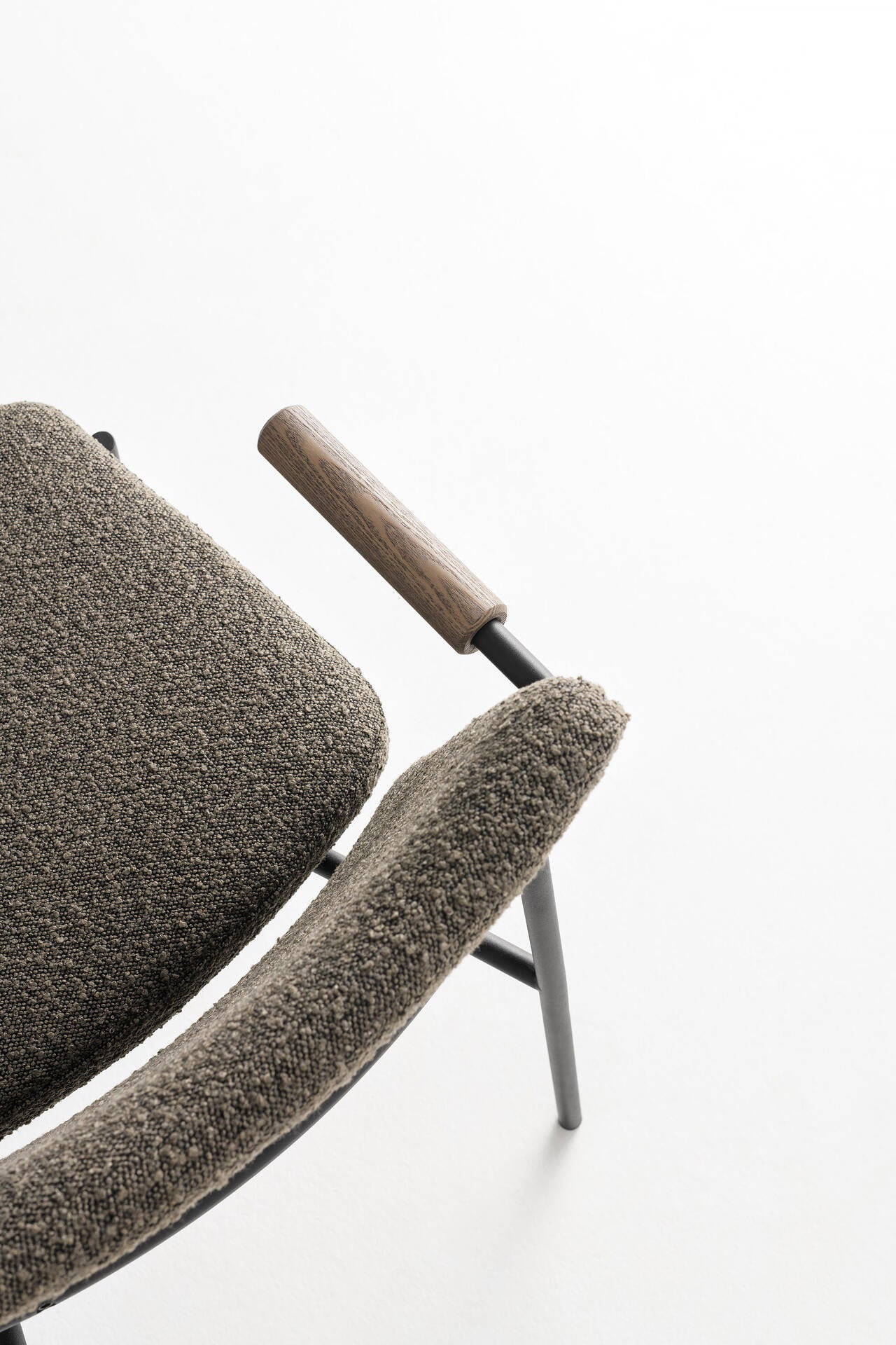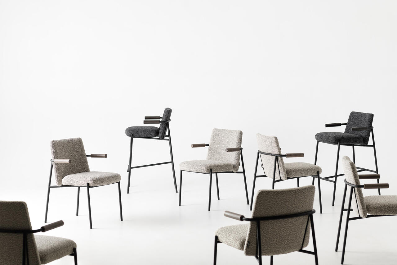 FRIENDLY chair is an addition to the Friendly collection. With its metal frame featuring dynamically sloping back legs and upholstered seat and back, this chair effortlessly combines style with comfort.