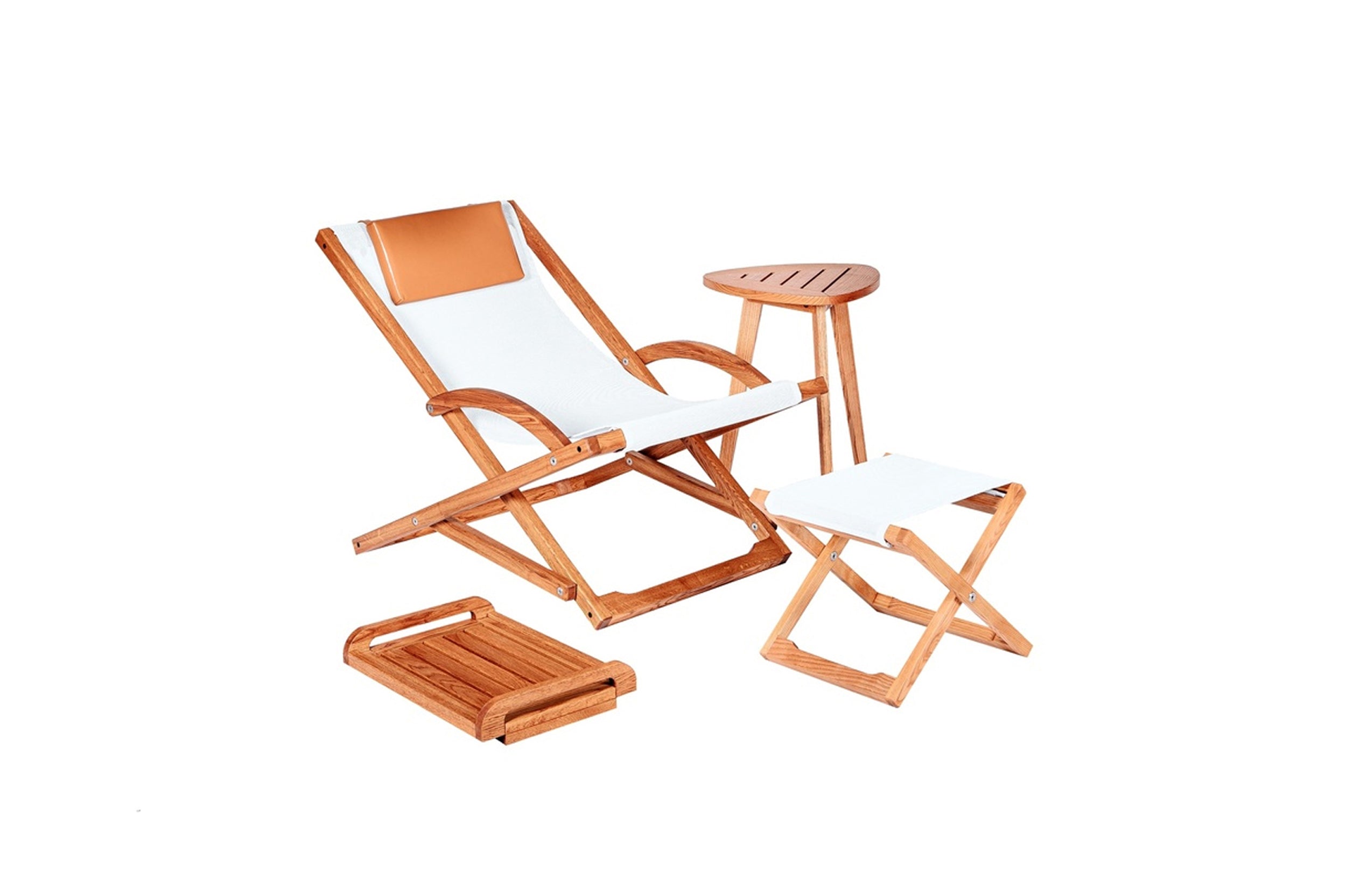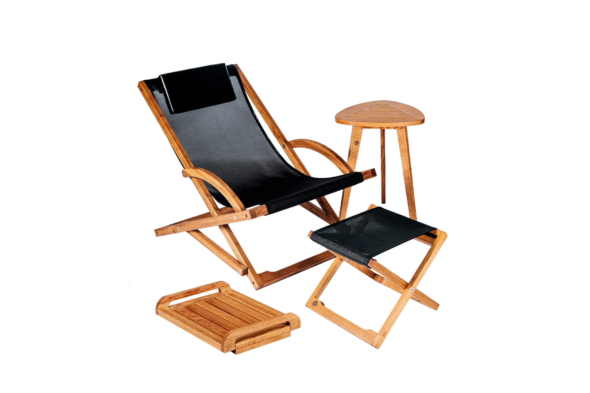 You have the option to order a complete set that includes a chaise lounge chair, a coffee table, a footrest, a tray and a head pillow.