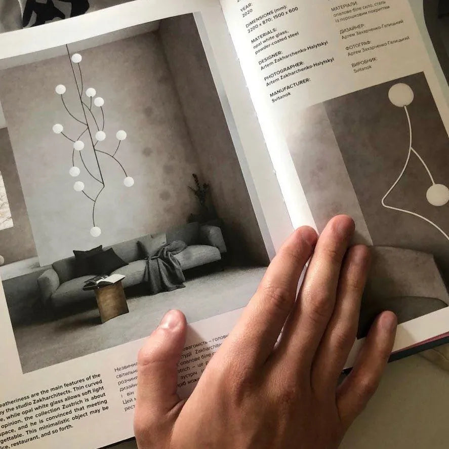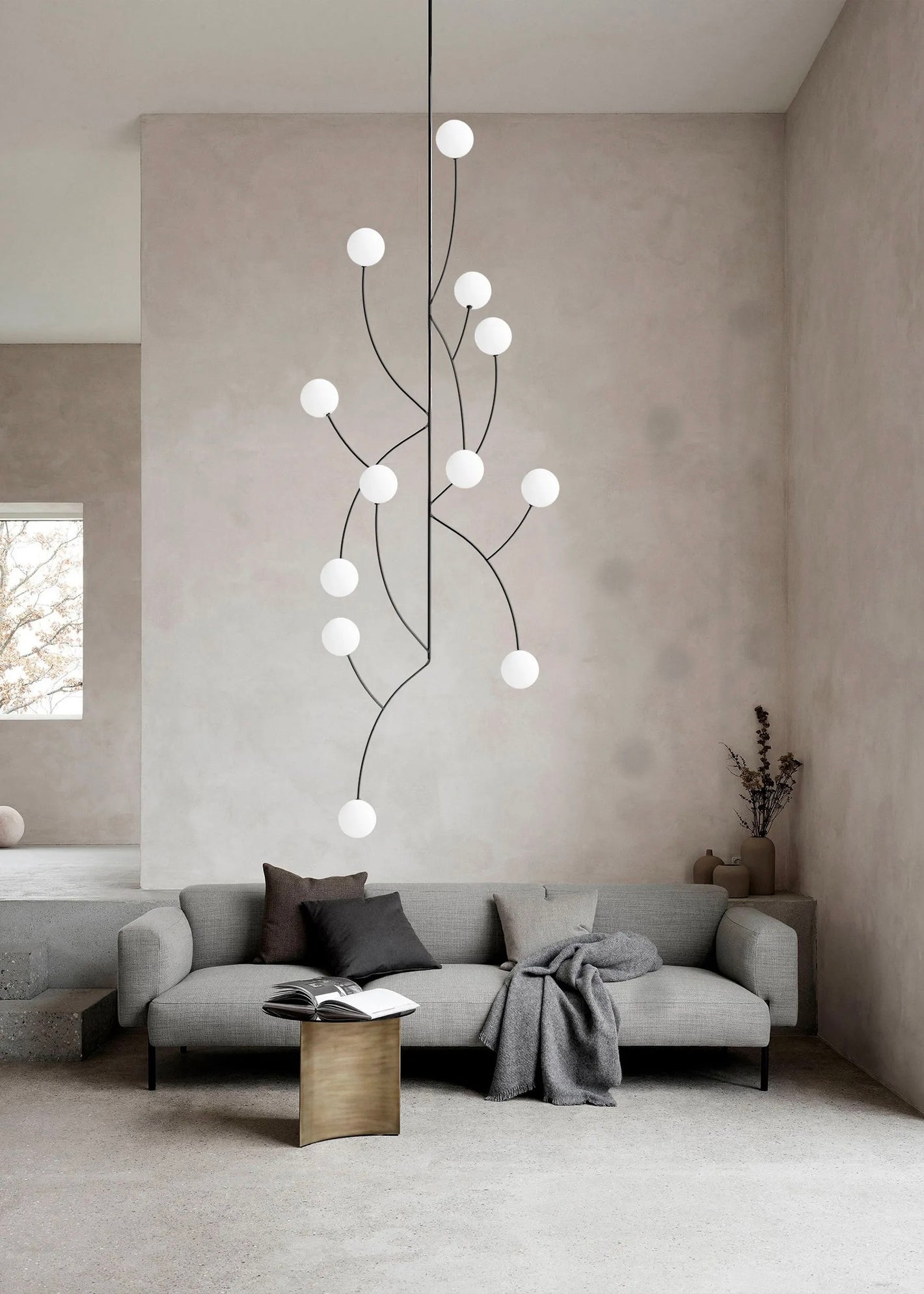 The Chandelier ZUSTRICH by Svitanok is a sculptural statement lighting piece crafted by designer Artem Zakharchenko. Part of the “Na Linii” collection, it features a frame of steel rods paired with frosted glass globes and a textile cable. Its refined structure makes it ideal as a modern chandelier for living rooms and dining spaces.