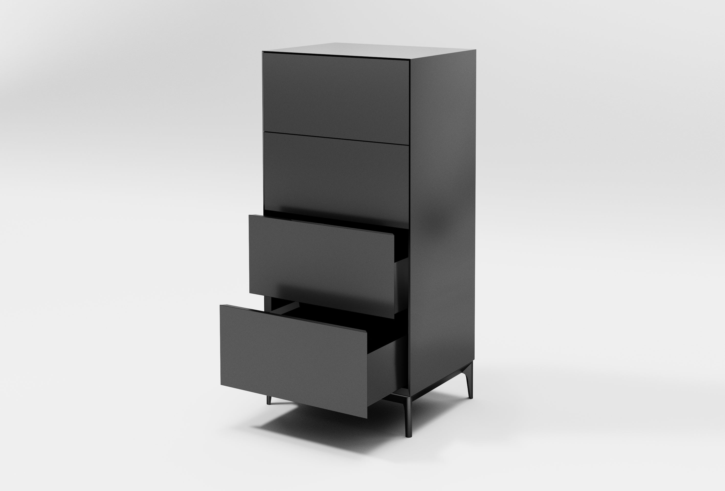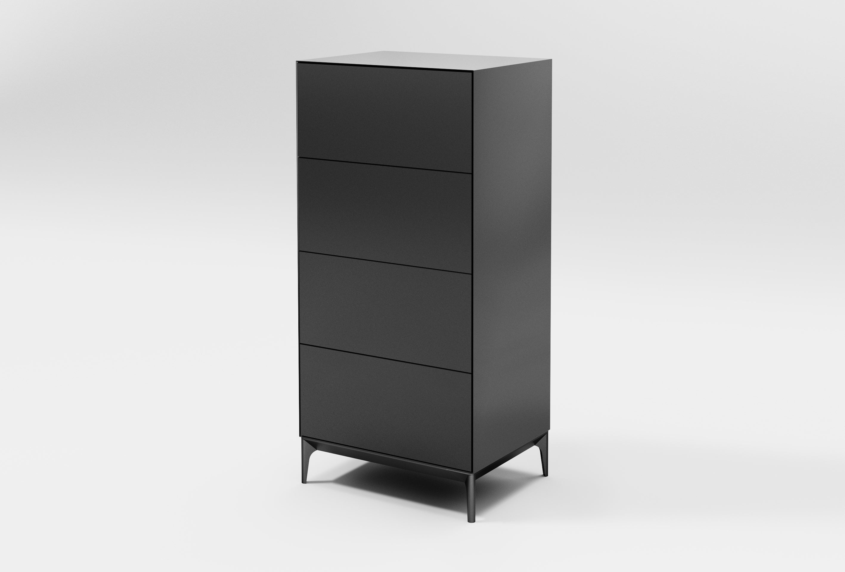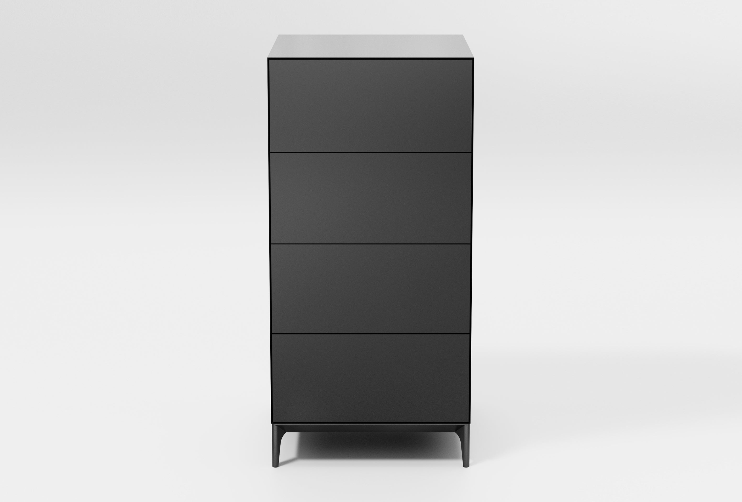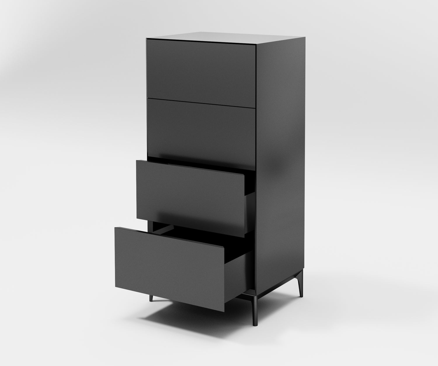 The chest of drawers Alpha 4 is a tall and narrow model from the Alpha collection, designed to maximise storage in a sleek, space-saving form. It features four spacious drawers, providing ample room for organising your belongings. Like all pieces in the collection, it incorporates the signature 45° edge design, adding a touch of innovation.