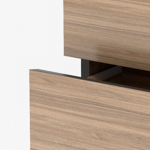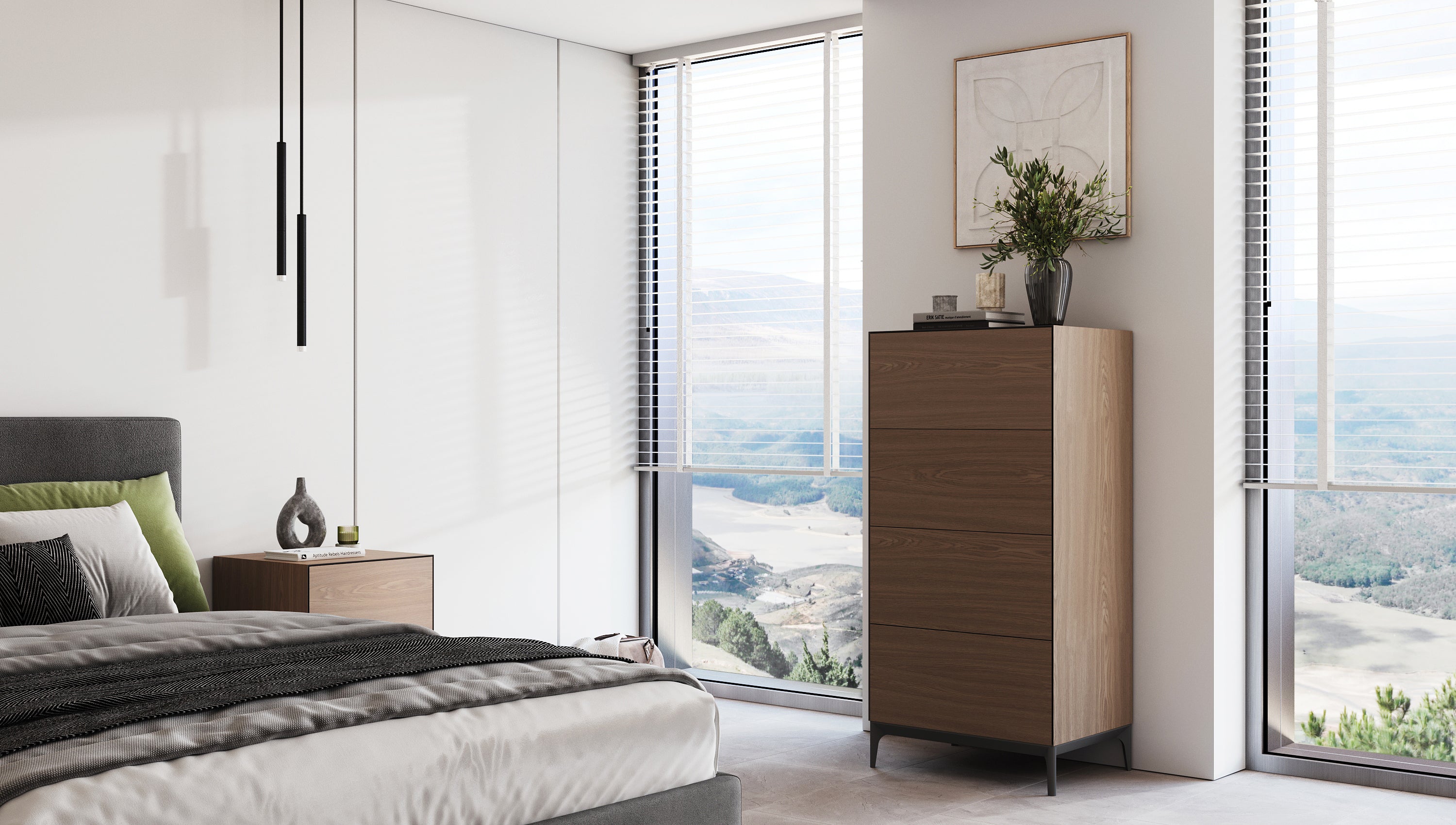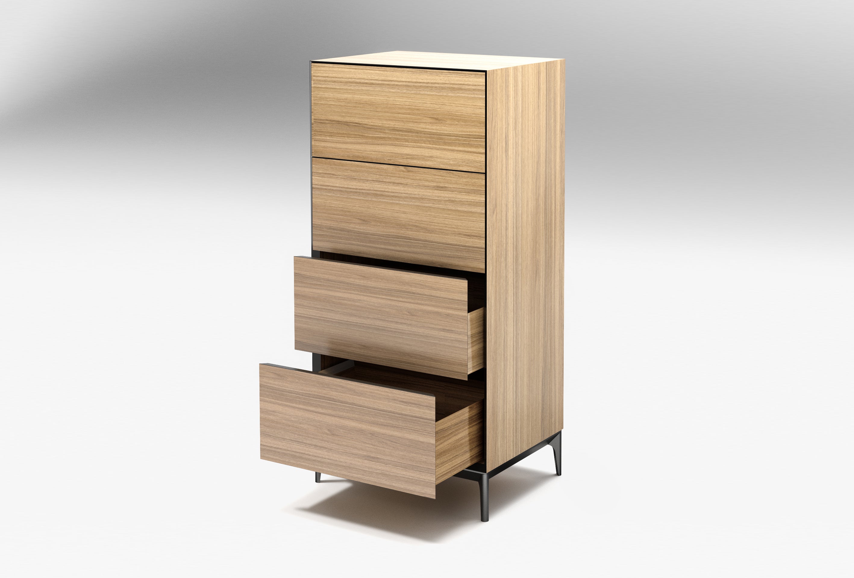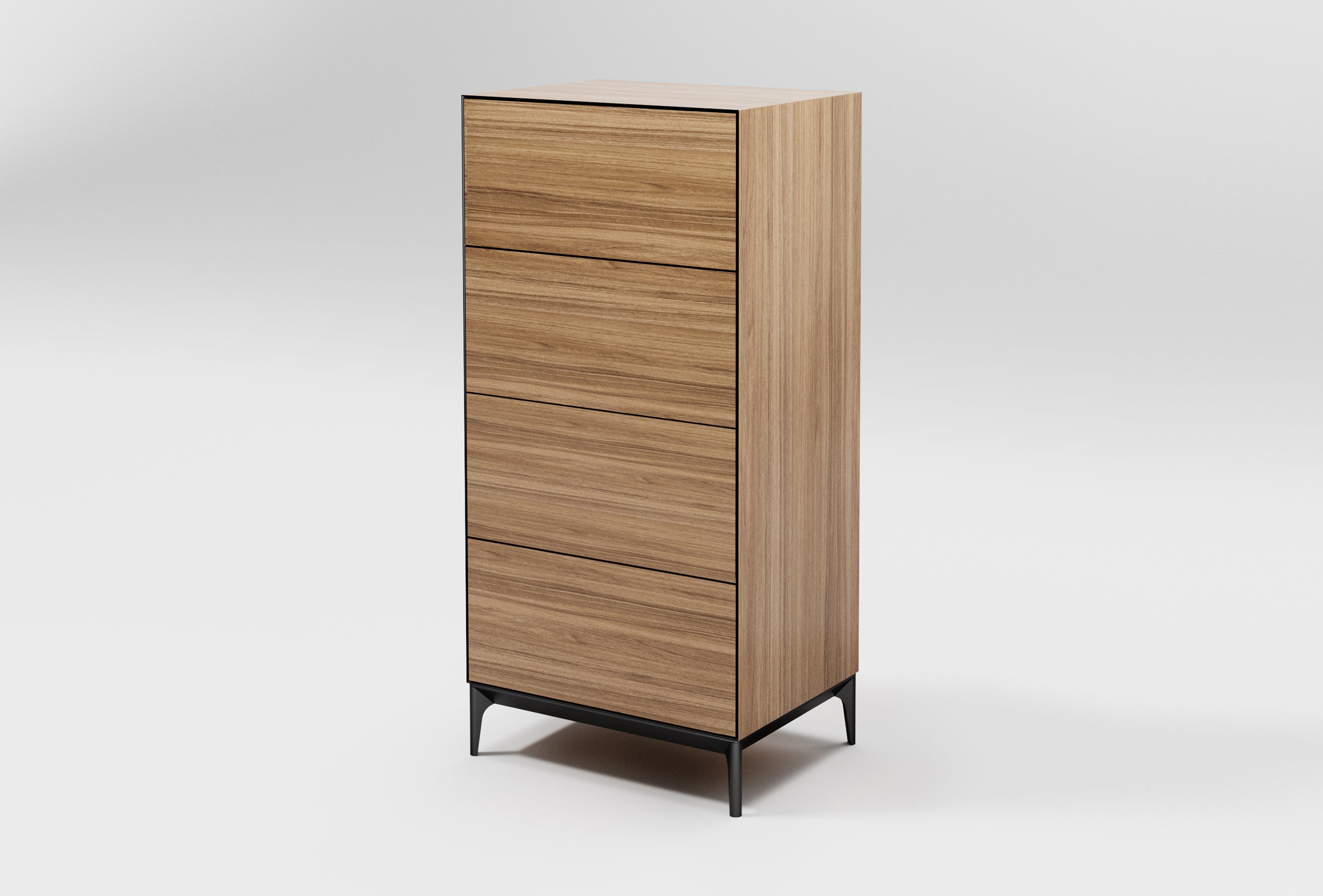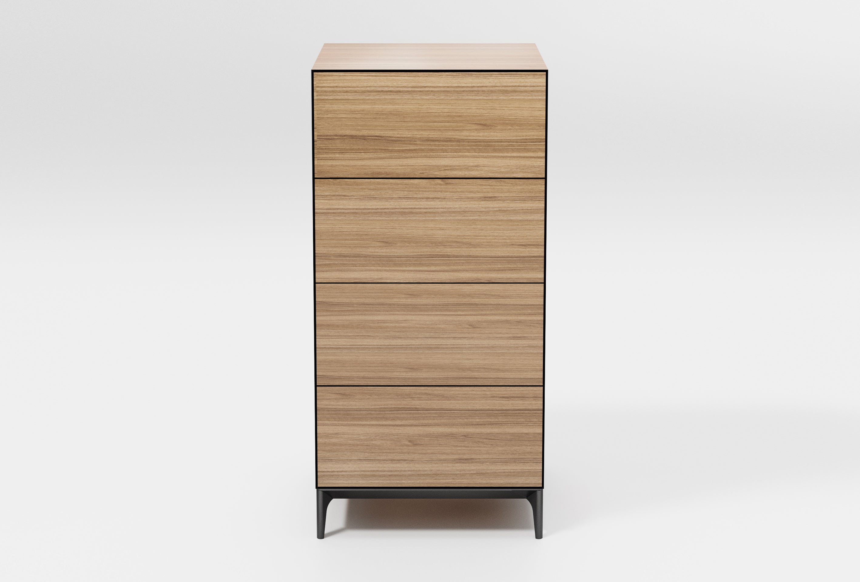 The chest of drawers Alpha 4 is a tall and narrow model from the Alpha collection, designed to maximise storage in a sleek, space-saving form. It features four spacious drawers, providing ample room for organising your belongings. Like all pieces in the collection, it incorporates the signature 45° edge design, adding a touch of innovation.