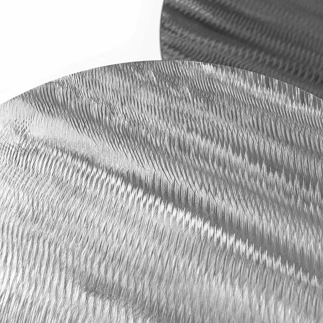 The tabletop is supported by three cylindrical legs of different diameters, lending an interesting asymmetry, without compromising its practicality. The hand-brushed pattern on the metal surface evokes ripples on water.