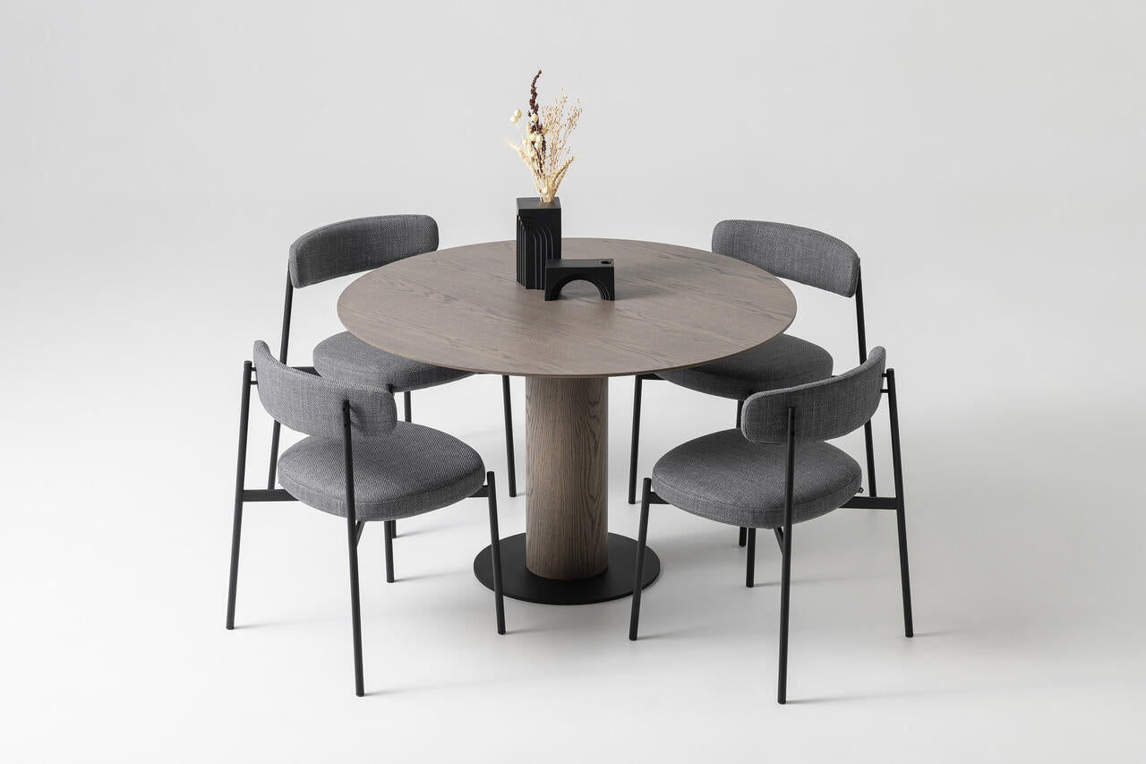Crafted with meticulous attention to detail, FLEXI round dining table features a perfectly round tabletop, composed of a thin, double-sided veneer plate measuring 10 mm in thickness. Reinforced from below with an additional 18 mm massive plate, the table boasts both style and durability.