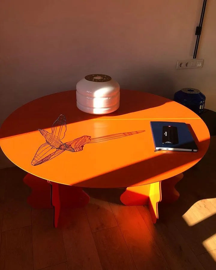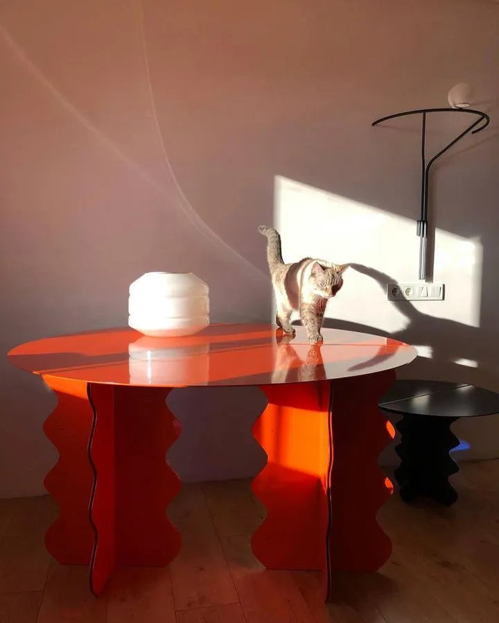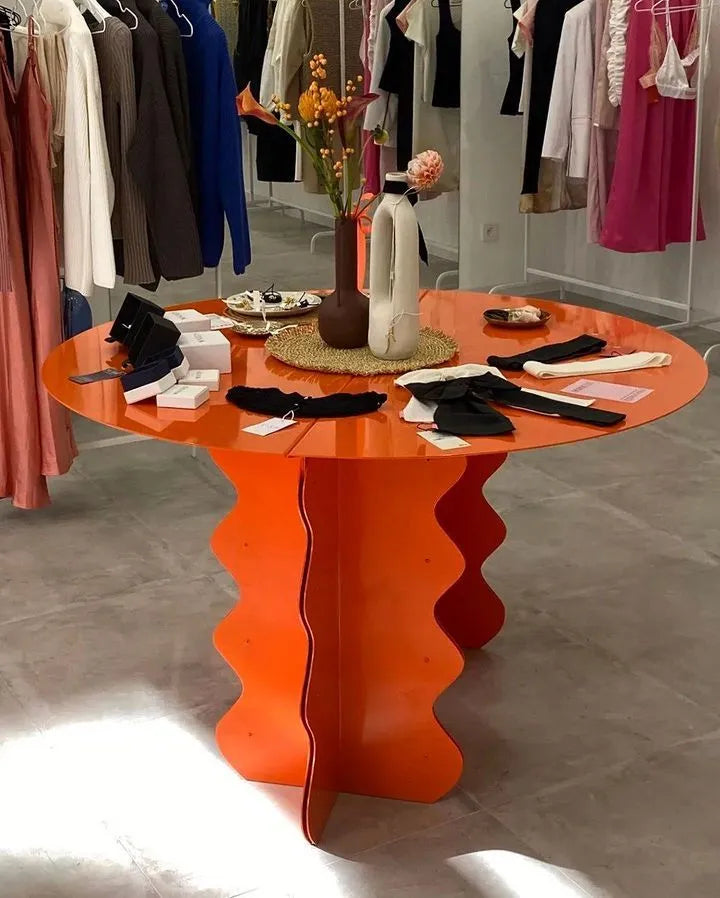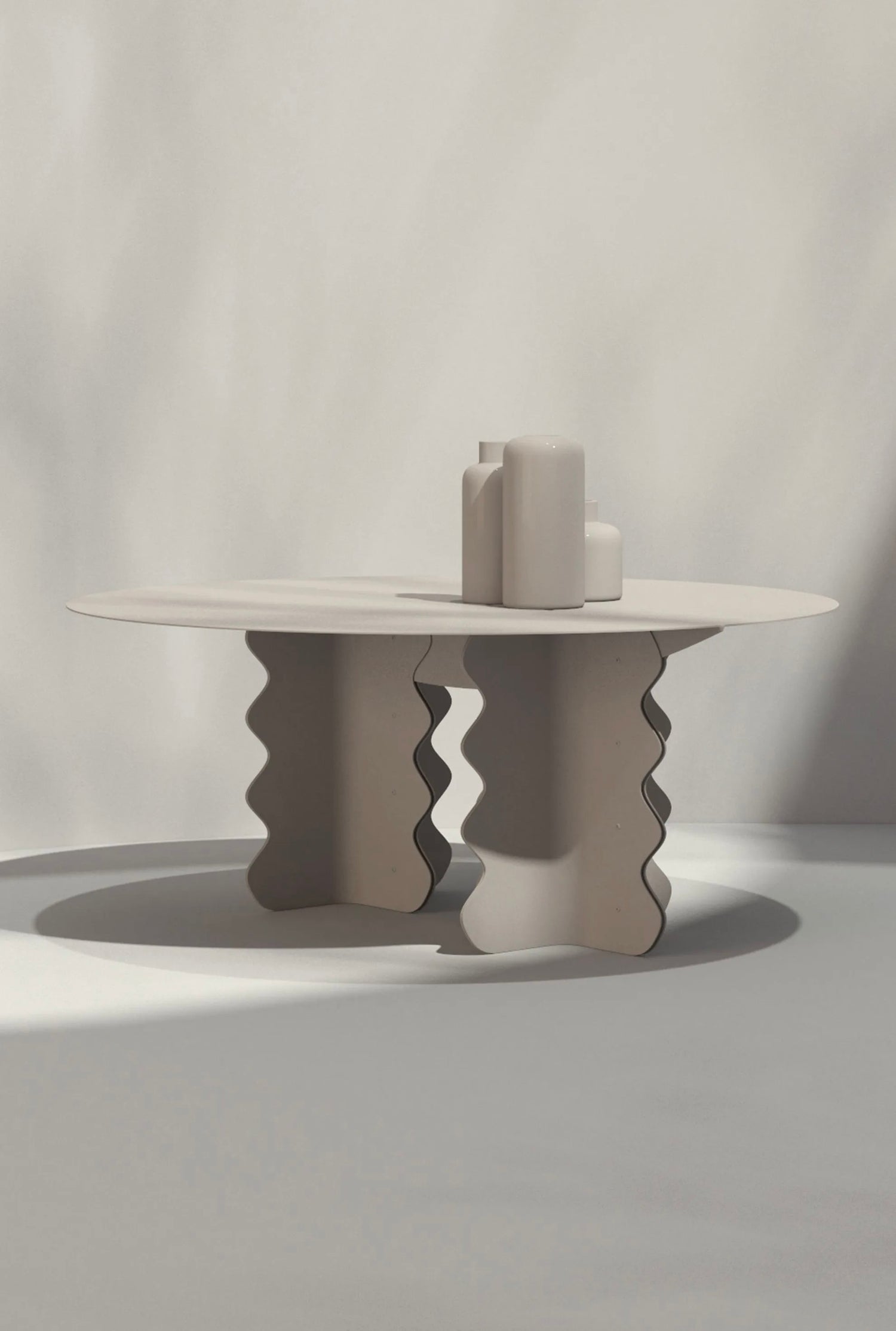The Hvylya dining table from Svitanok is a round dining table crafted from powder‑coated steel. Its fluid, wave-like form creates a striking statement dining table that enriches any large dining area while remaining grounded and practical.