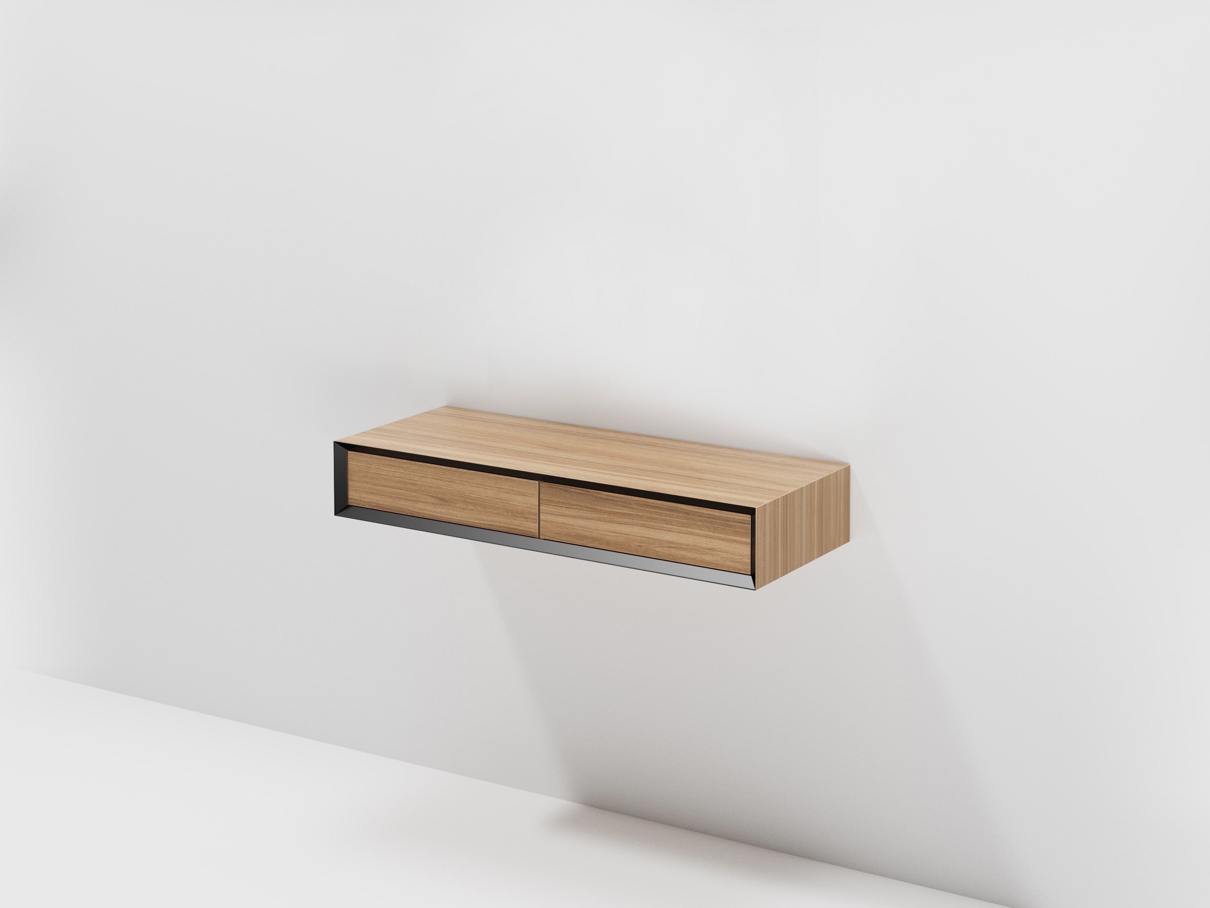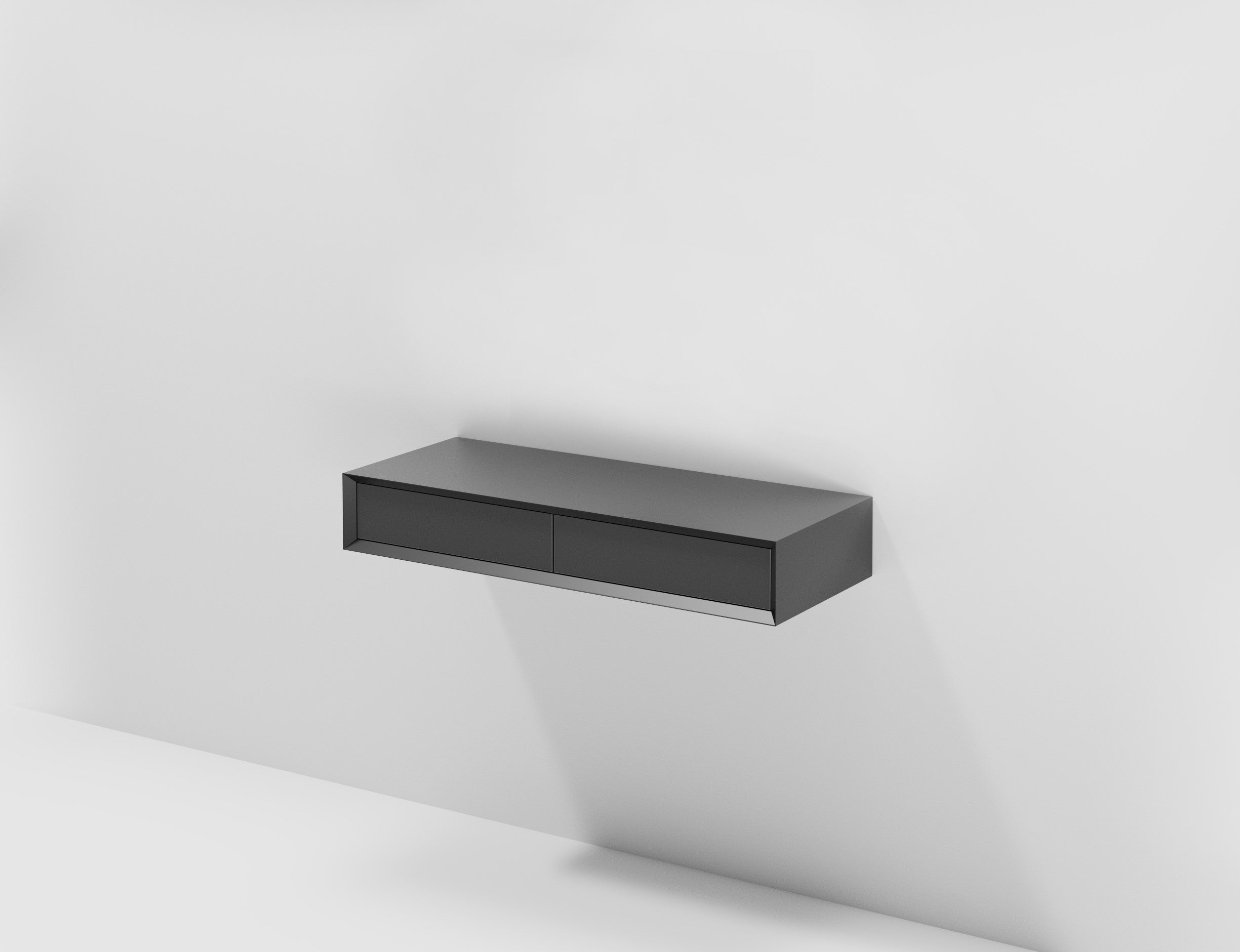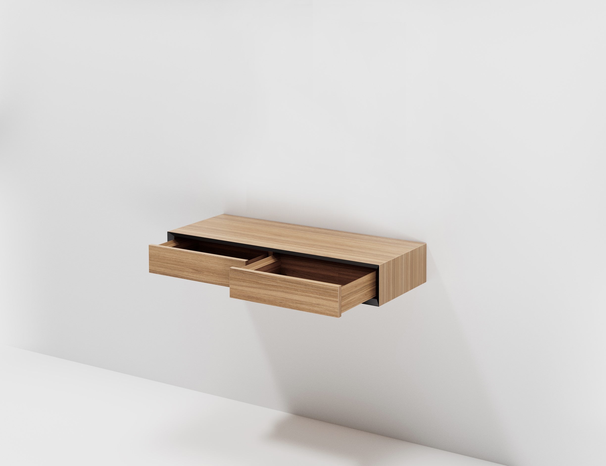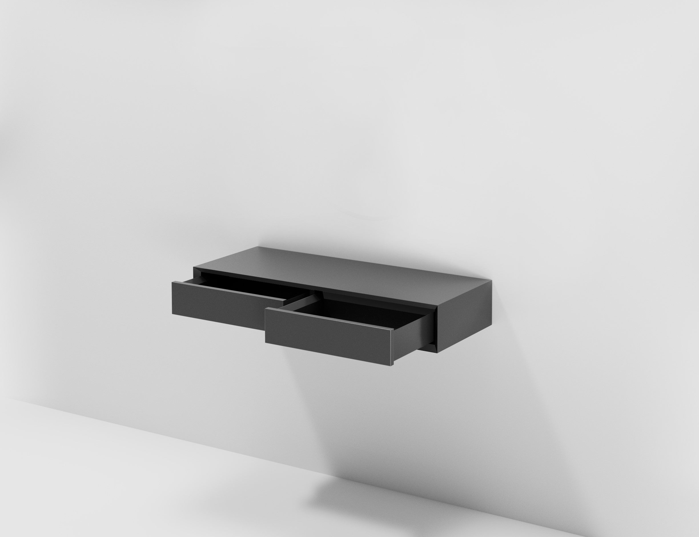 The hanging dressing table Delta 5 features two spacious drawers with high-quality fittings, ensuring long-lasting durability. Its modern, minimalist design offers both functionality and style. A standout feature of this piece is its black front edge, a signature detail of the Delta collection.
