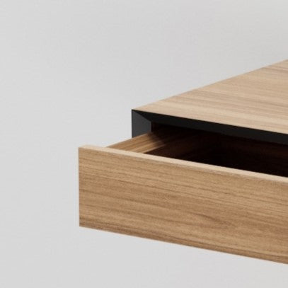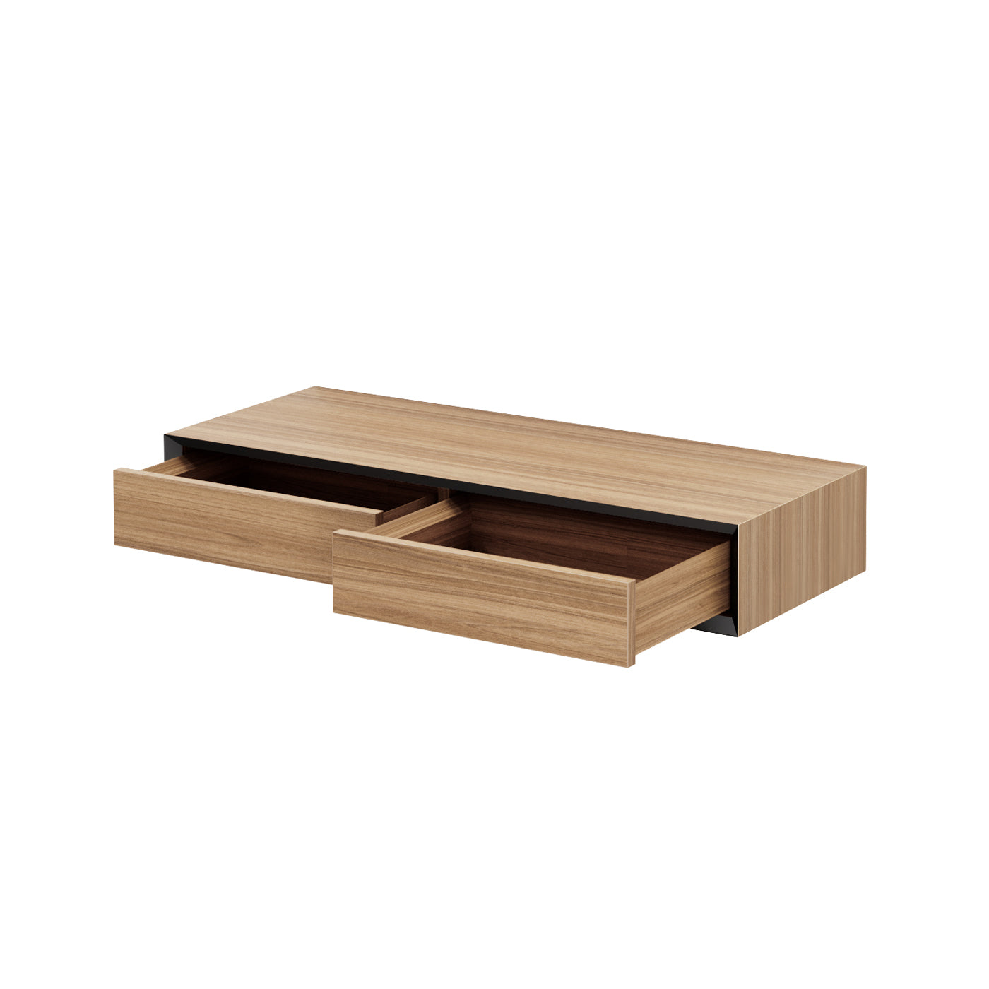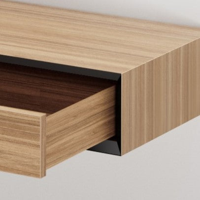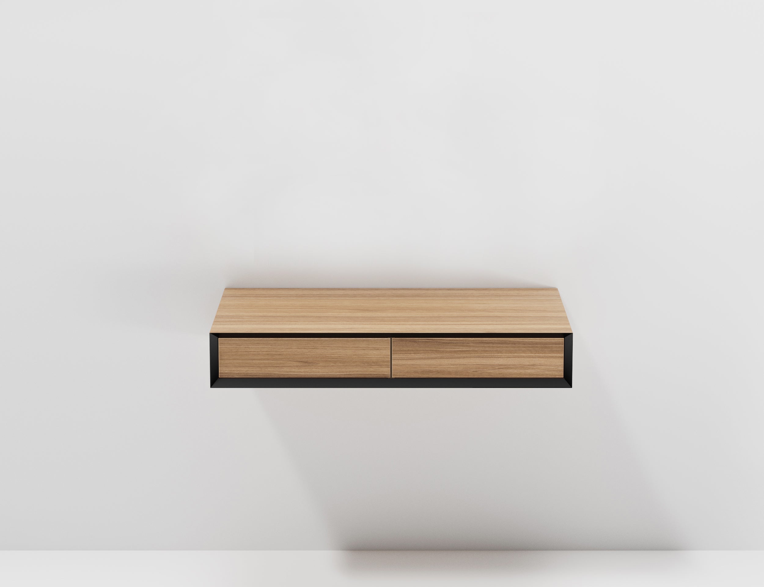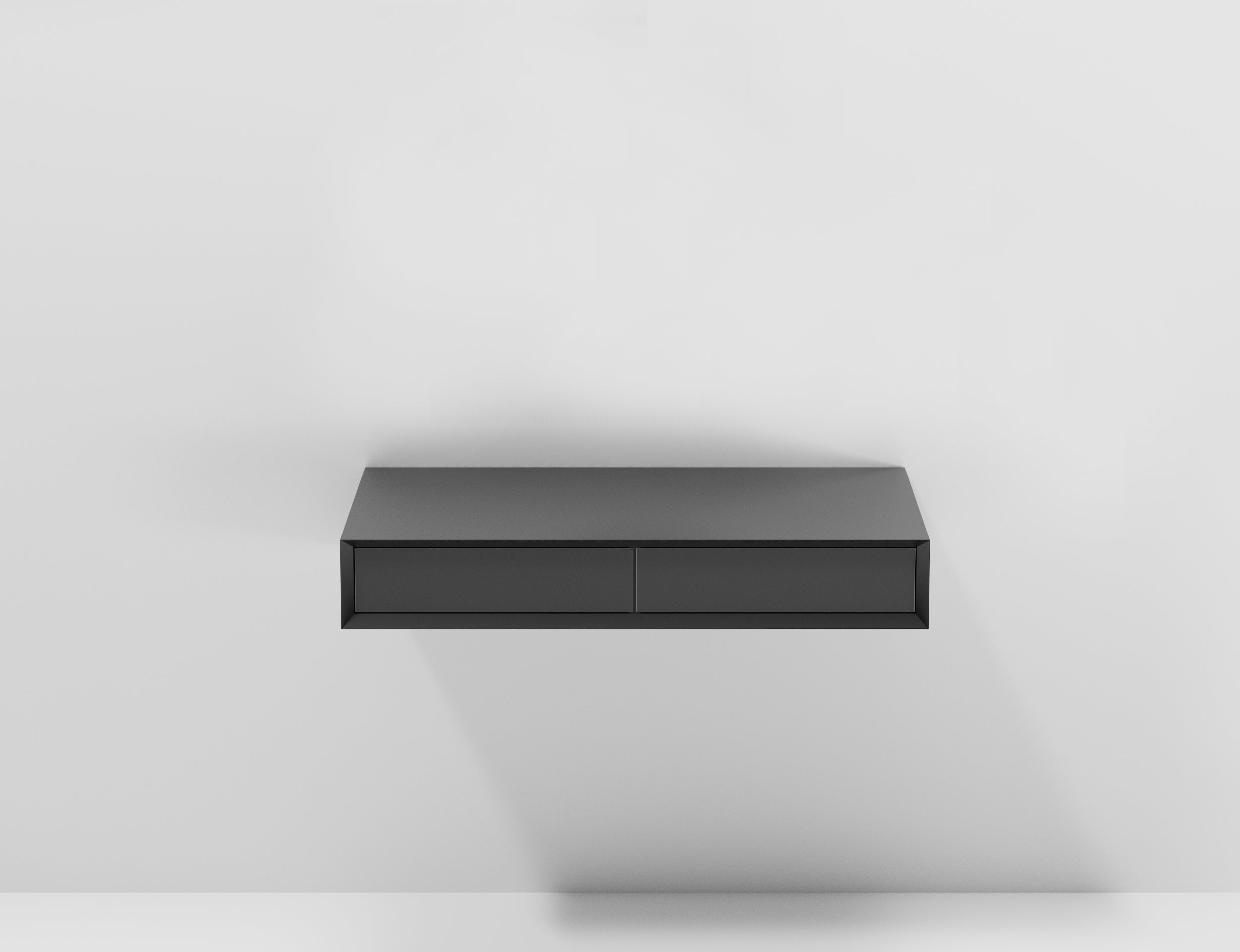 The hanging dressing table Delta 5 features two spacious drawers with high-quality fittings, ensuring long-lasting durability. Its modern, minimalist design offers both functionality and style. A standout feature of this piece is its black front edge, a signature detail of the Delta collection.