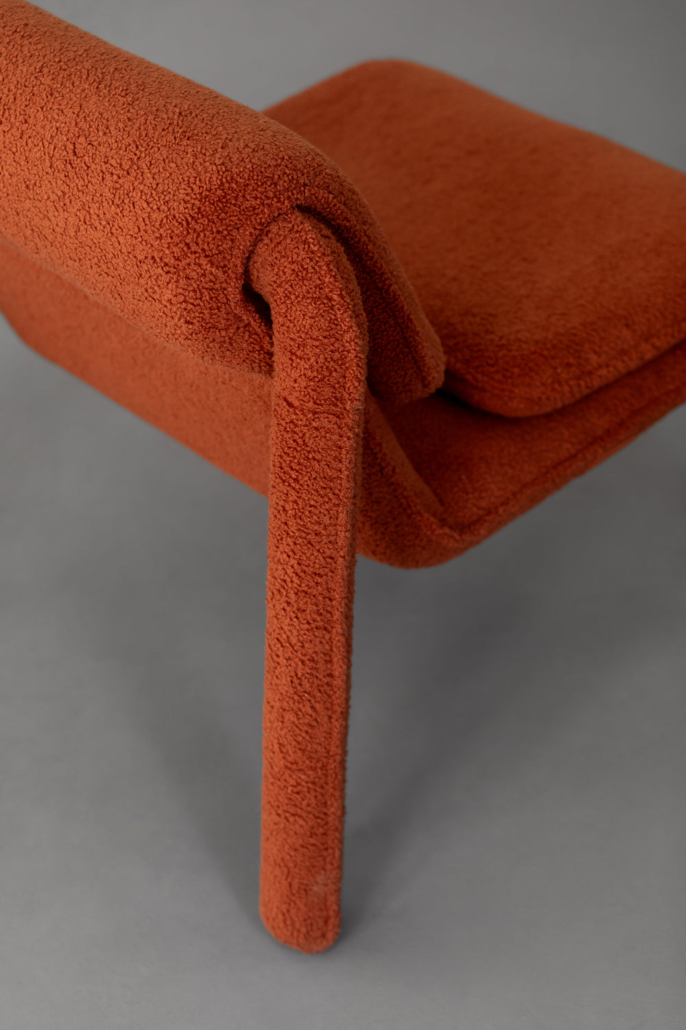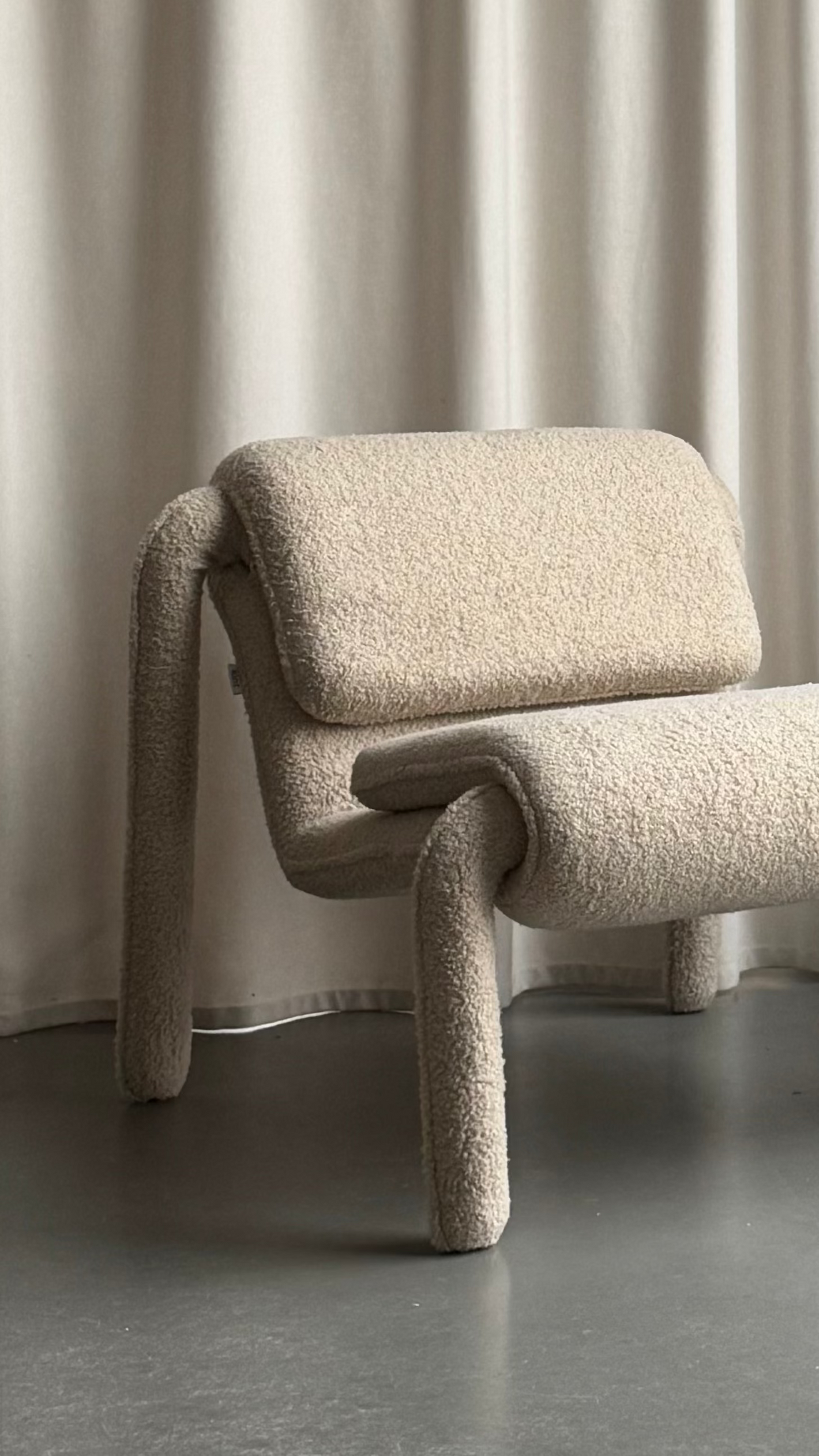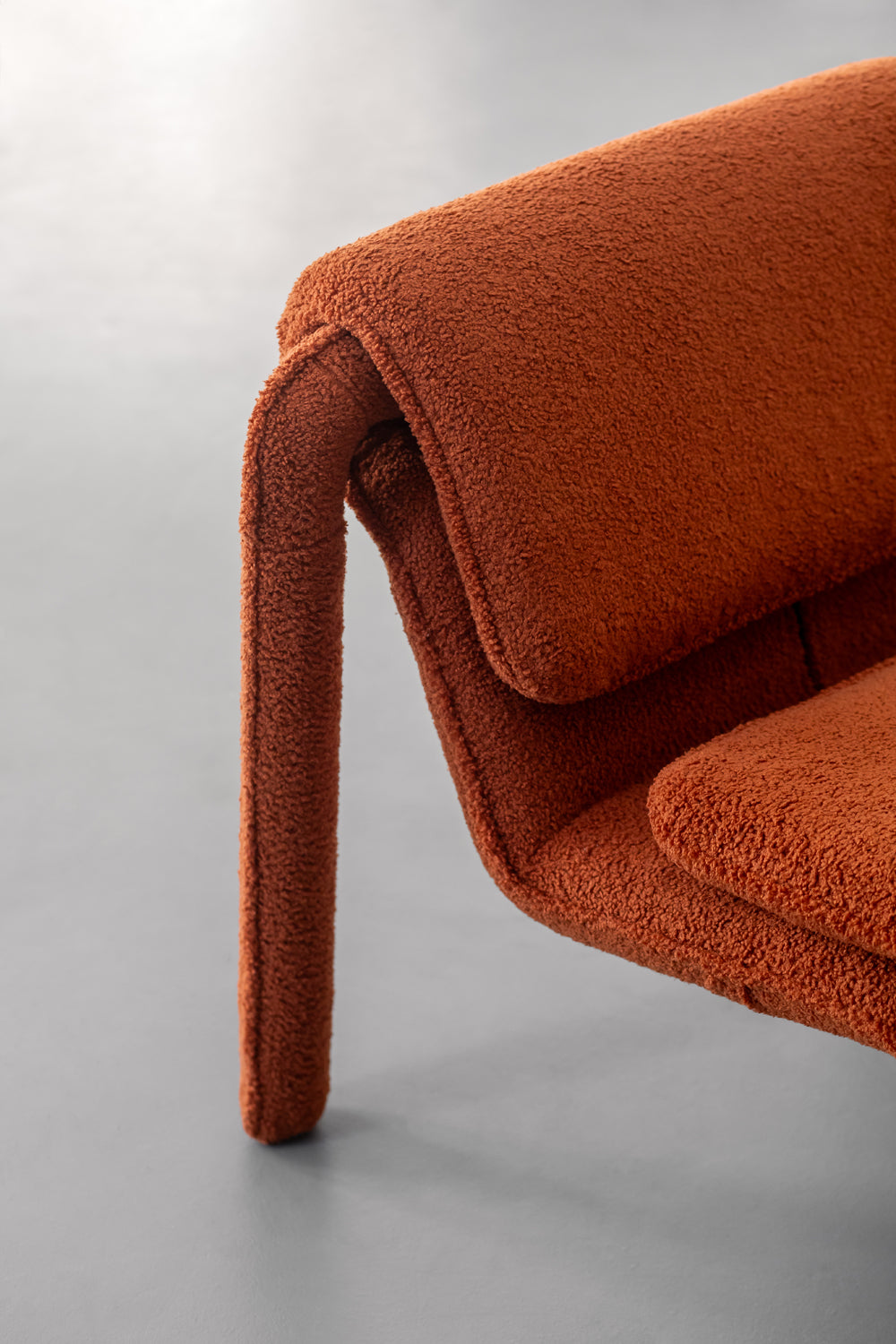 The construction combines a metal frame with polyurethane foam padding, fully upholstered in fabric, including the legs, which visually extend the softness of the seat to the floor. Falda can optionally be equipped with one or two integrated metal armrests, precisely embedded into the fold of the seat. Thanks to its soft geometry and carefully considered ergonomics, the FALDA Lounge Chair provides a comfortable and inviting seating experience. It is well suited for modern living rooms, creative studios, hotel lounges, reception areas and relaxation zones in public interiors.