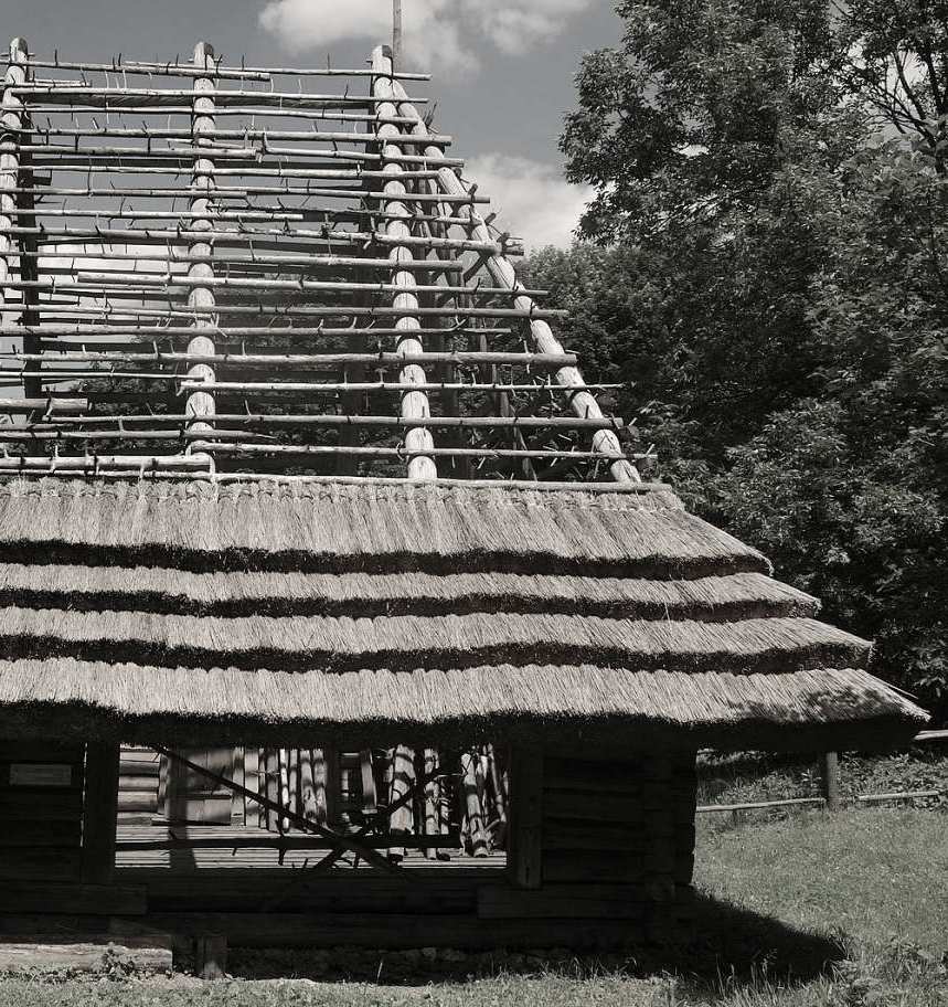 Thatched roofs were a prominent feature of Ukrainian traditional architecture. Dried straw, usually from grains like wheat, rye, or oats, was tightly bundled and layered onto the roof frame. The straw was arranged in a way that allowed rainwater to shed easily, preventing water penetration. This type of roof provided insulation against both cold and heat, and it was an economical choice given the abundance of straw in agricultural societies.