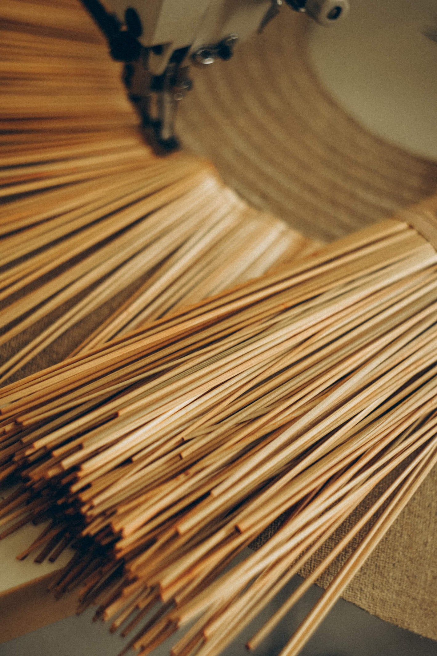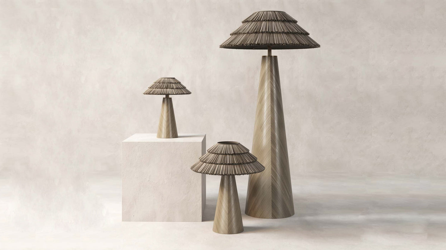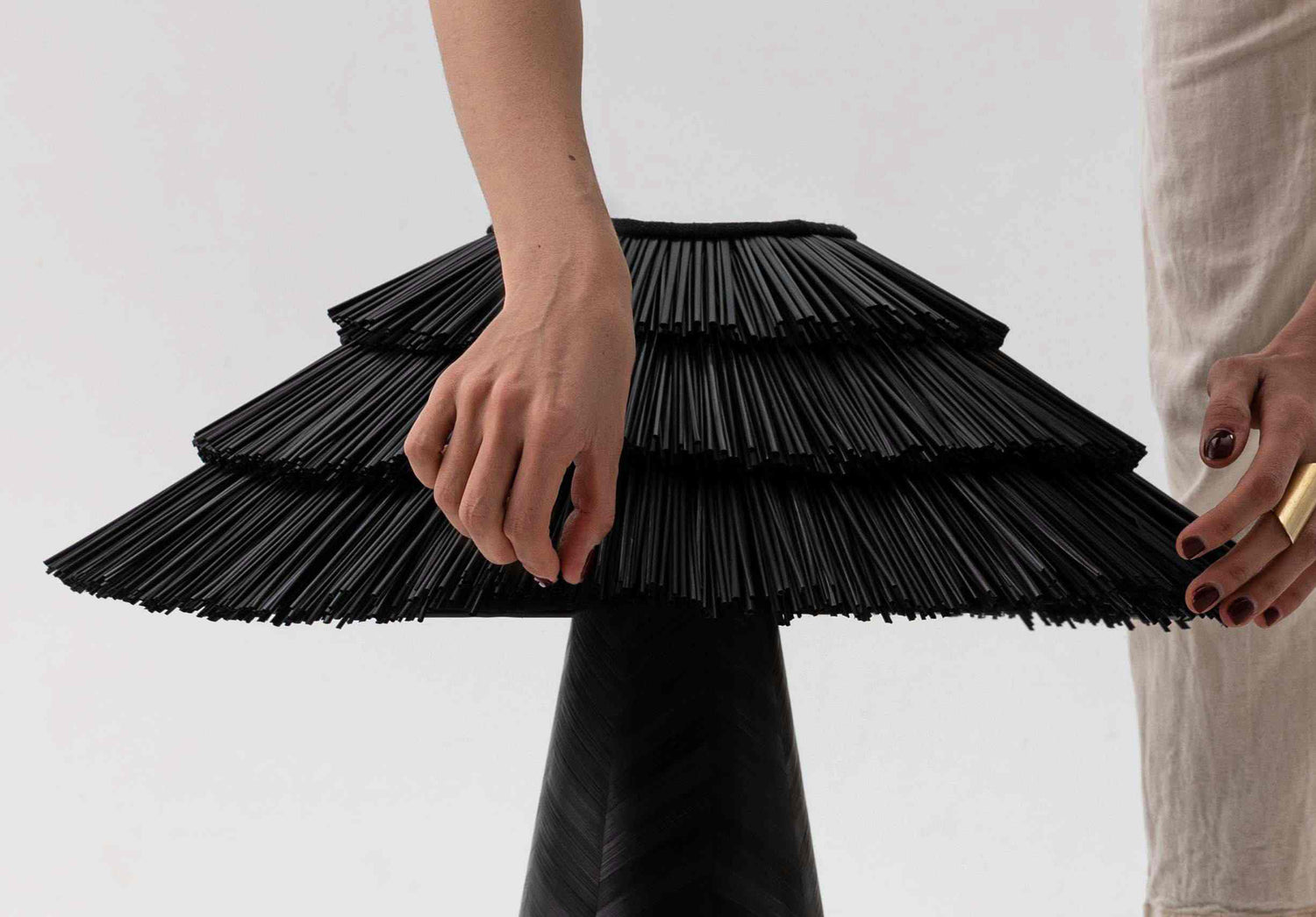 - Materials: recycled plastic base, straw inlay, metal lampshade, homespun canvas, straw.