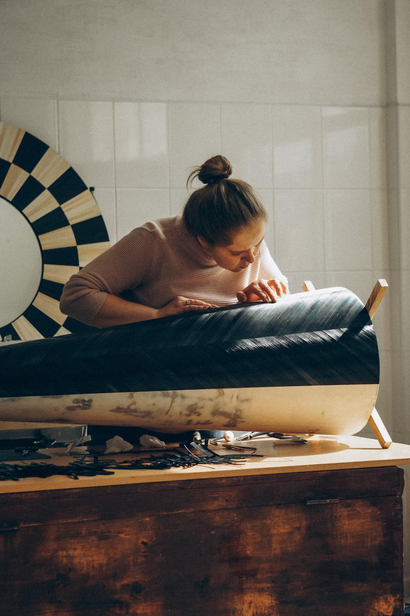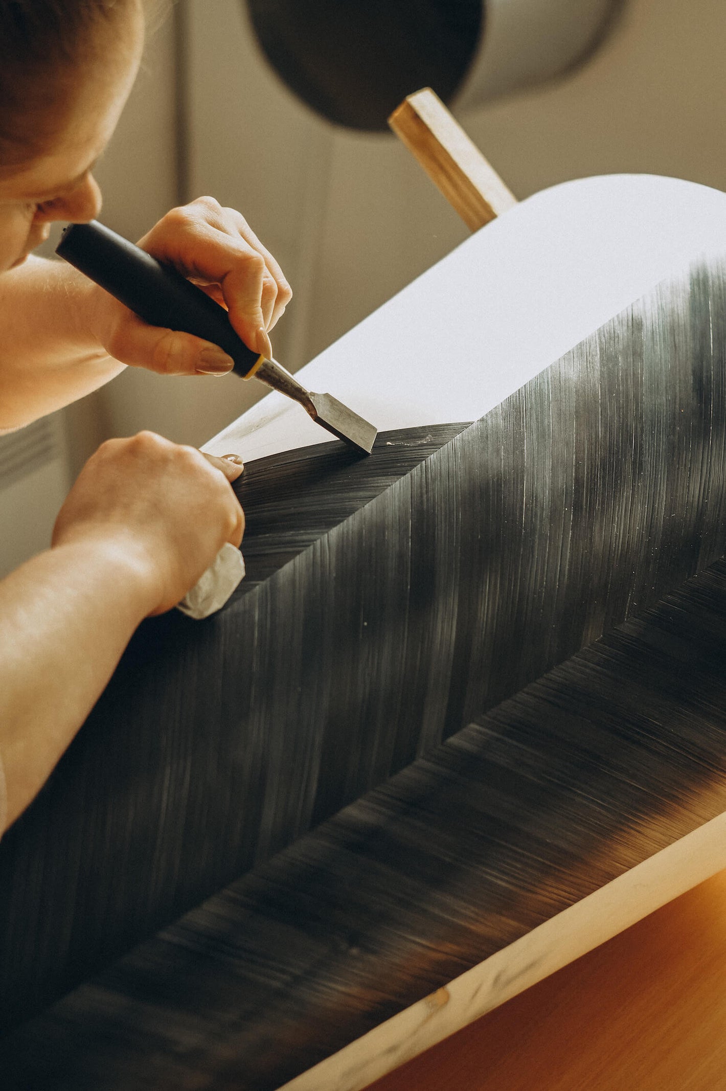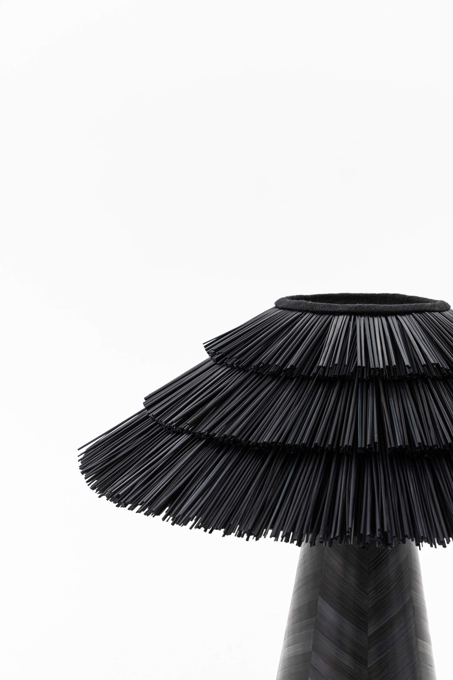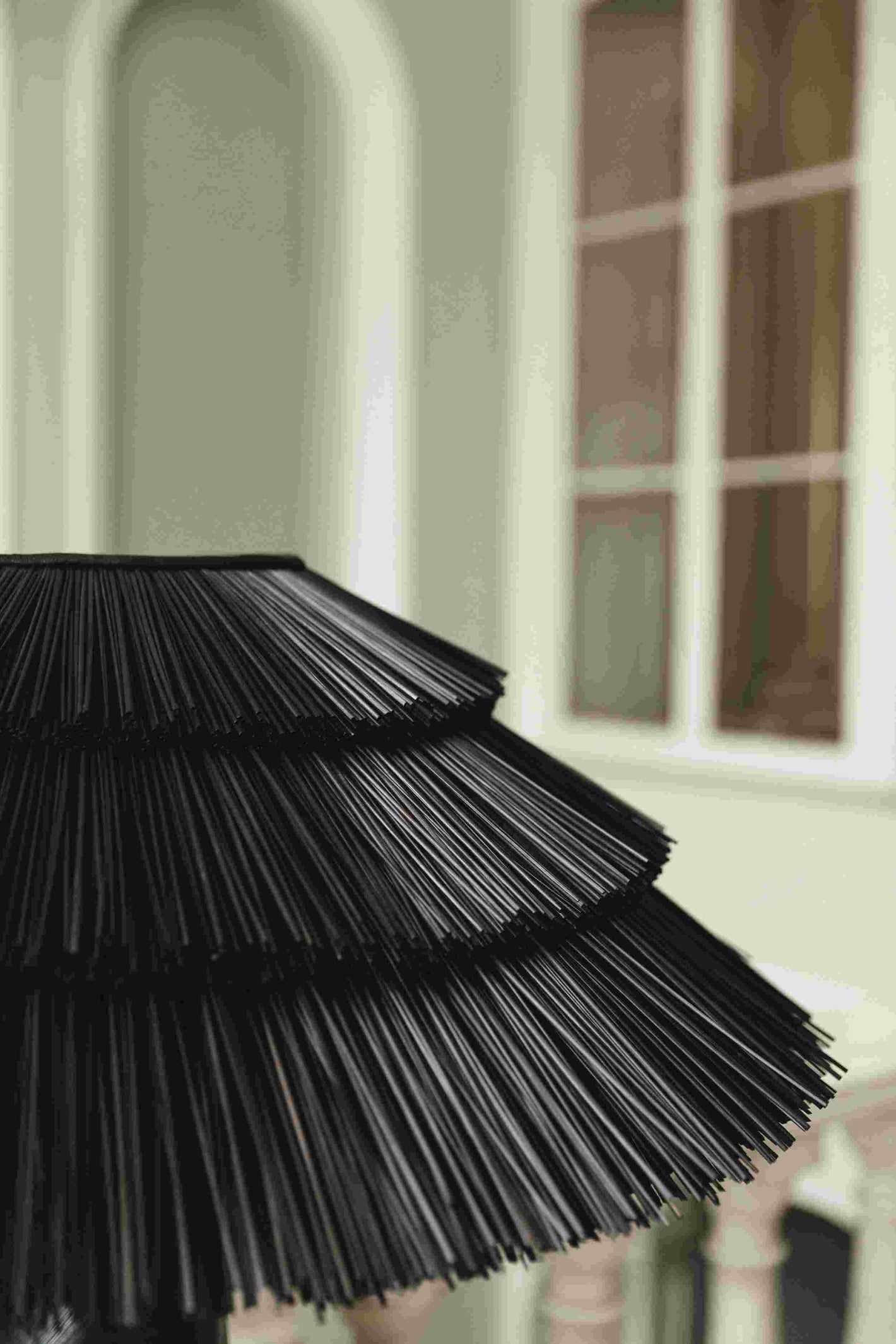This modern floor lamp from the ROOTS OF HOME collection was inspired by the architectural beauty of ancient Ukrainian homes. The lampshade gracefully mirrors the appearance of a traditional roof, adorned with its terracing of straw or shingles, meticulously created using a centuries old intricate technique.