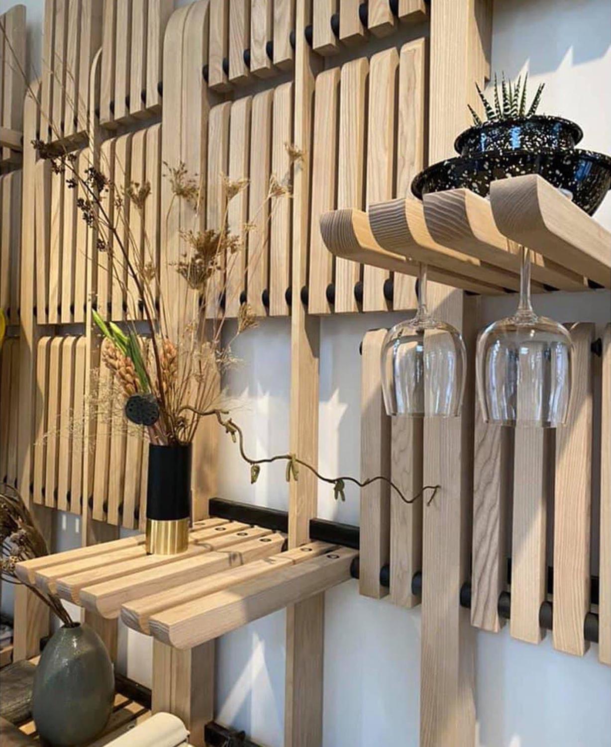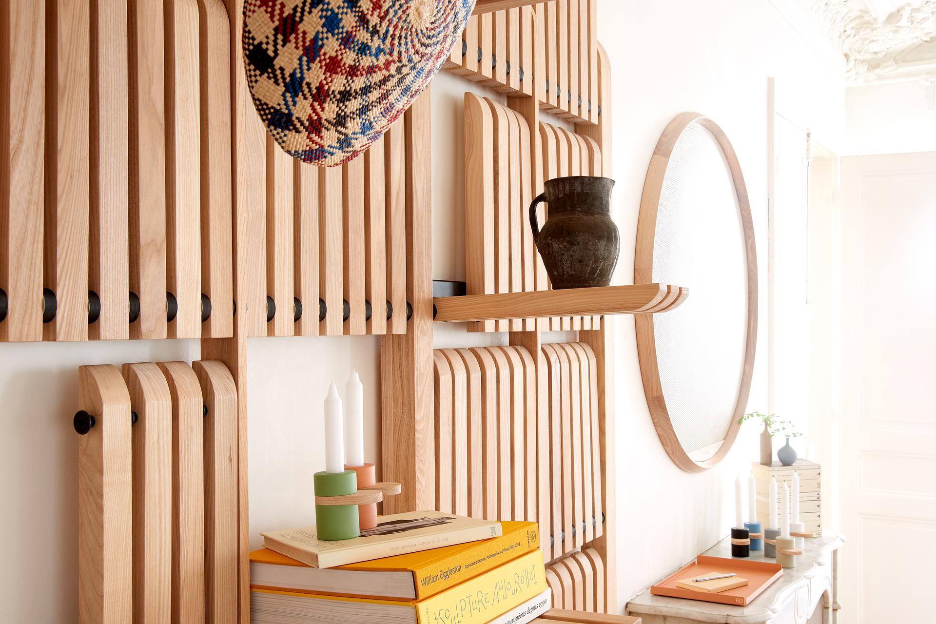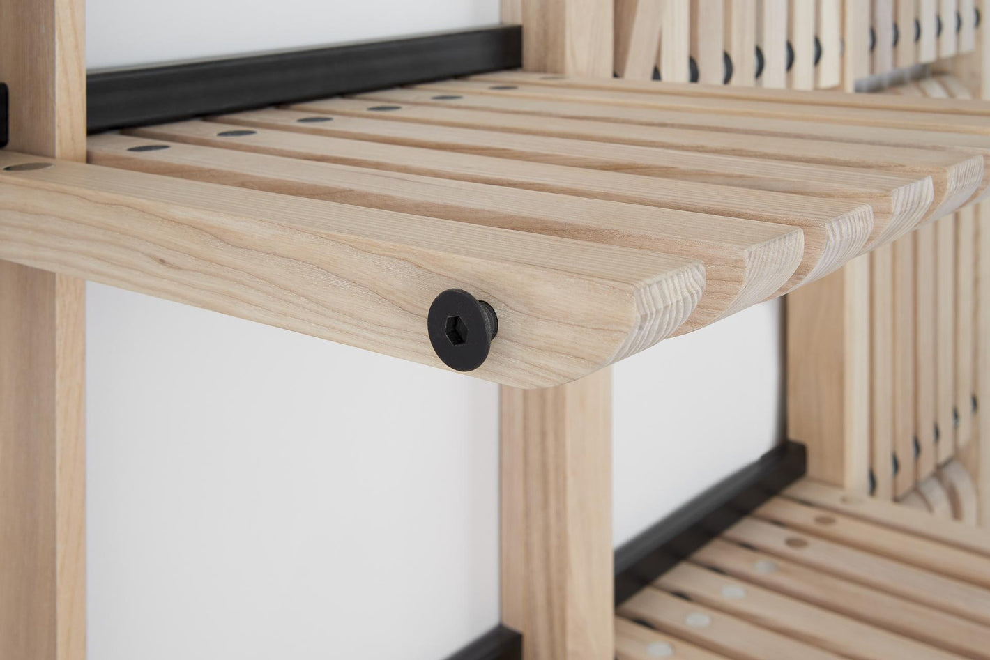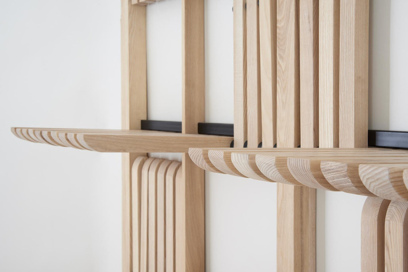 Crafted from solid ash blades, the GATE Shelves showcase the natural beauty of the wood. The shelves are ingeniously designed with a system of magnets, allowing them to effortlessly stay in a vertical position with just a single touch. This unique feature provides you with the flexibility to lower or fold the shelves as required, offering endless possibilities for storage and display.