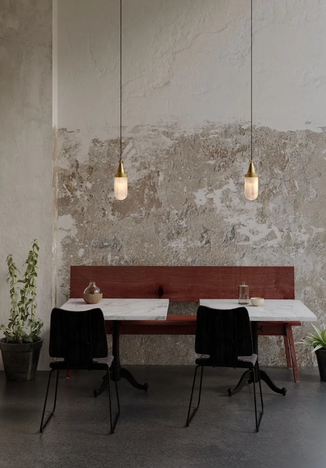 The Subway Stone pendant light is an exclusive designer piece that beautifully combines hand-blown glass and brass. The airy shade, with its marble-like texture, adds subtle Baroque influences to any interior.