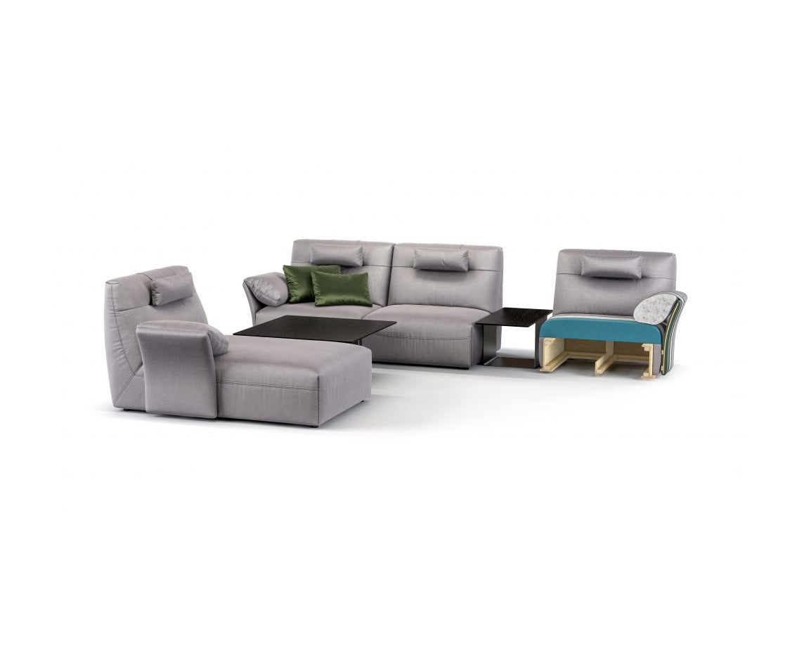 This sofa features intriguing modular design elements, allowing you to create unique and visually interesting configurations. Designed with relaxation in mind, it includes chaise modules and complementary tables from the same collection, offering both comfort and functionality.