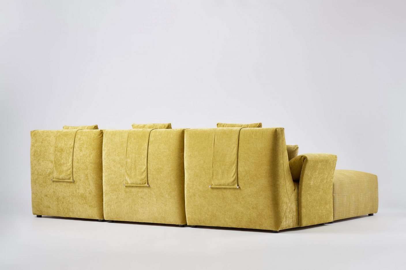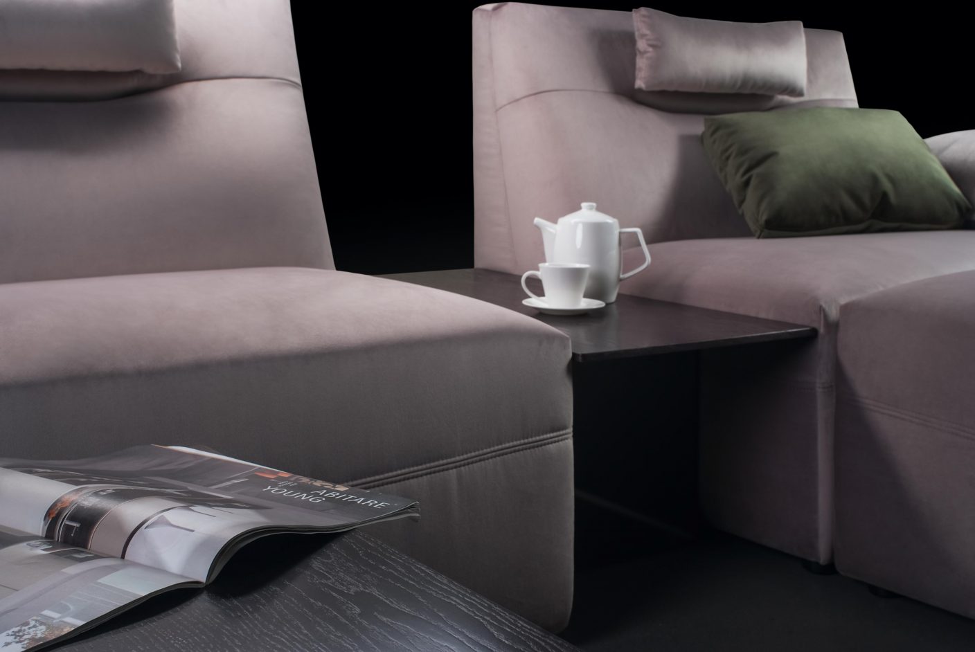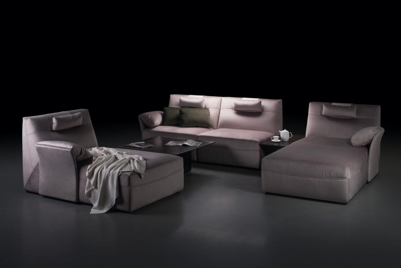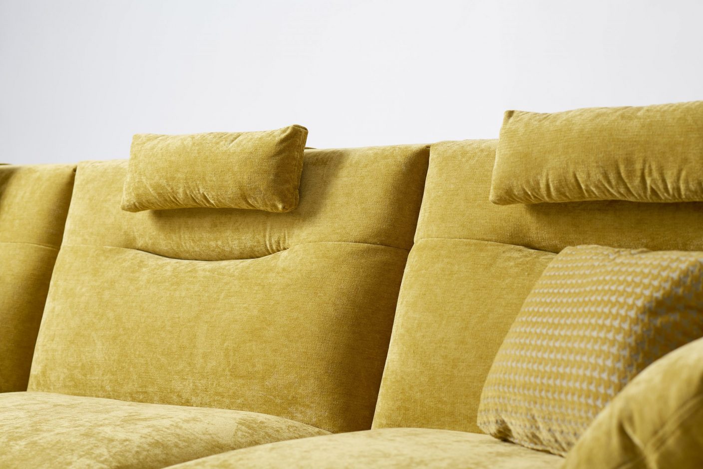 This sofa is available in two configurations: with side chaise moduls or as a straight sofa paired with a pouffe. For enhanced comfort, the Fio model is also equipped with adjustable head pillows, ensuring a relaxing and personalised seating experience.