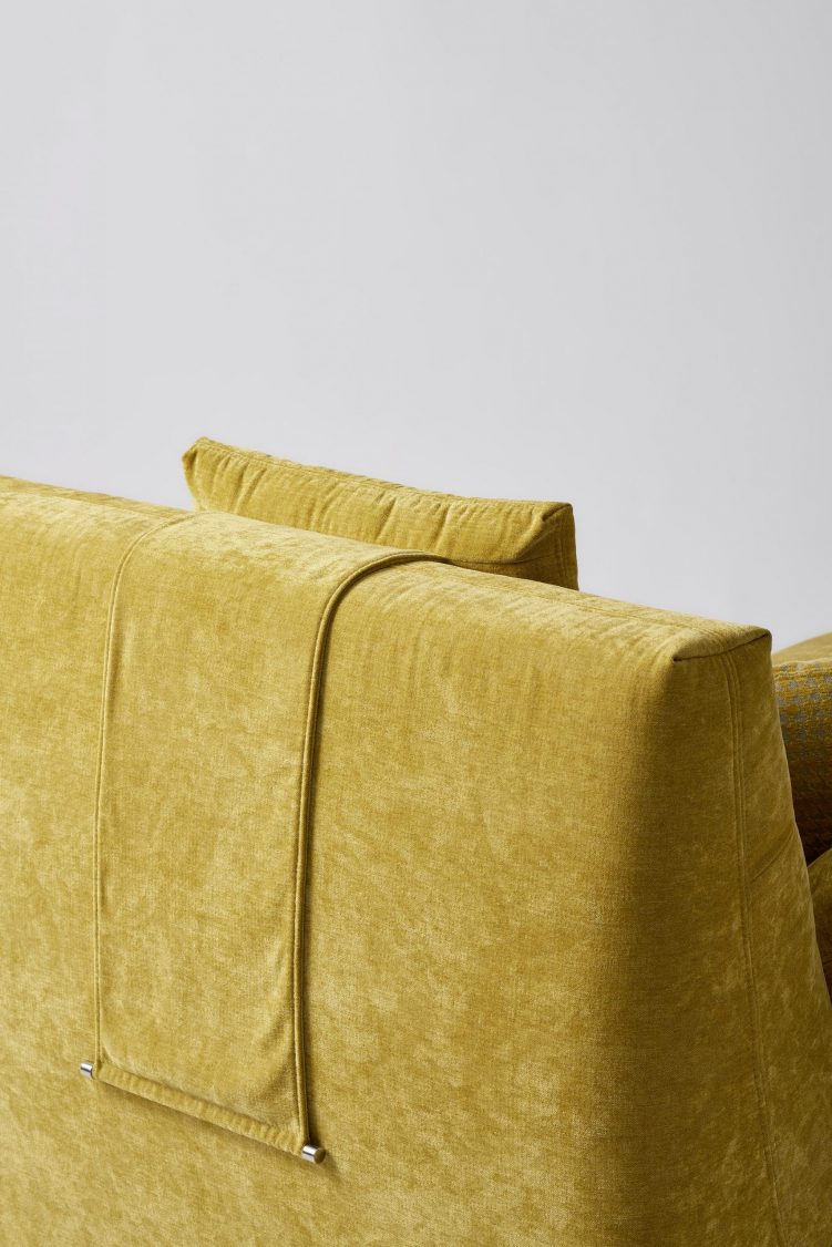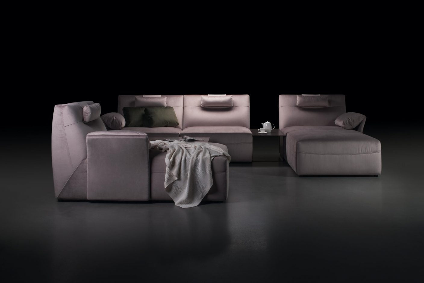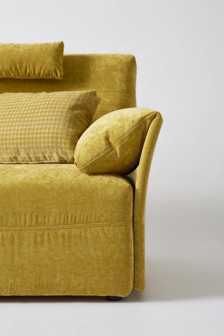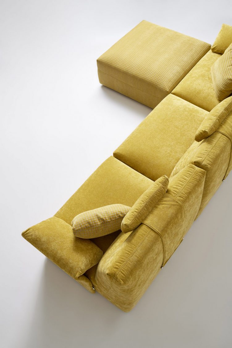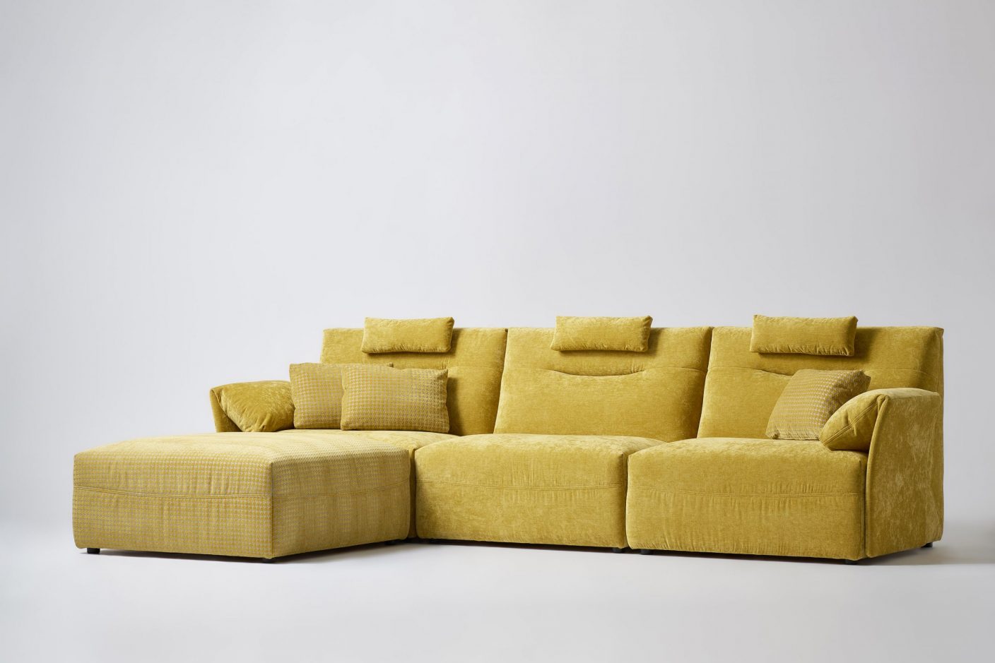 This sofa is available in two configurations: with side chaise moduls or as a straight sofa paired with a pouffe. For enhanced comfort, the Fio model is also equipped with adjustable head pillows, ensuring a relaxing and personalised seating experience.