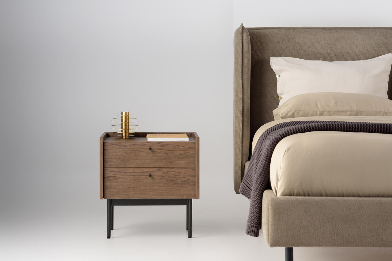 Crafted in a minimalist style, CANELLI bedside table features a combination of veneered plates and slender metal supports, striking a perfect balance between sophistication and simplicity. With two spacious drawers, it offers ample storage for your essentials, keeping gadgets and small items within easy reach.