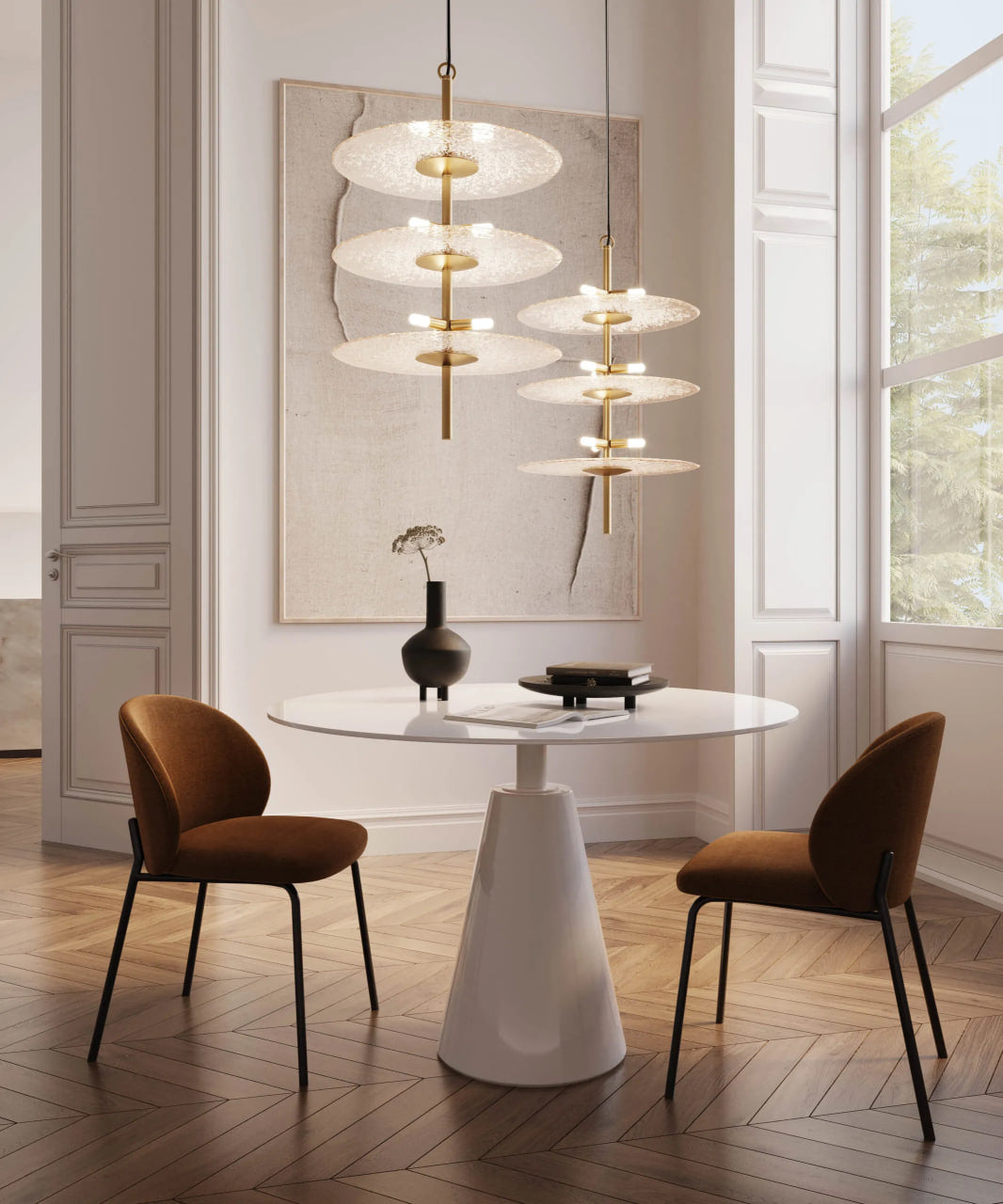 An arrangement of pendants at varying heights, as shown in our visualization, adds an enchanting atmosphere to your space, creating a magical ambiance every day.