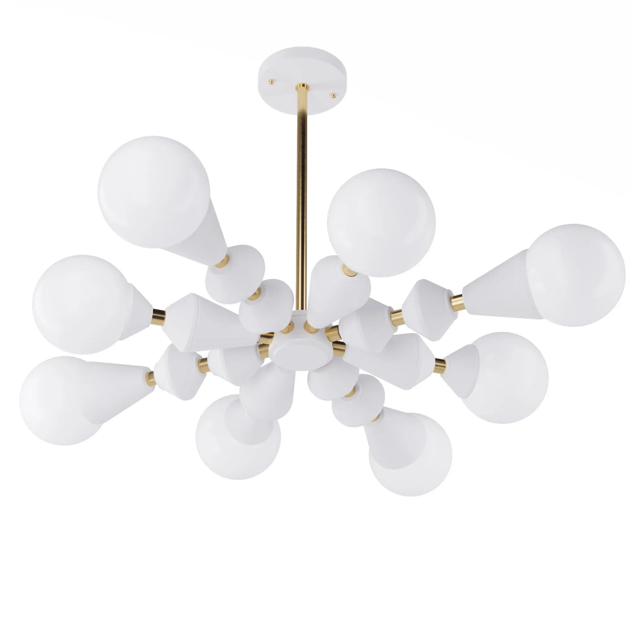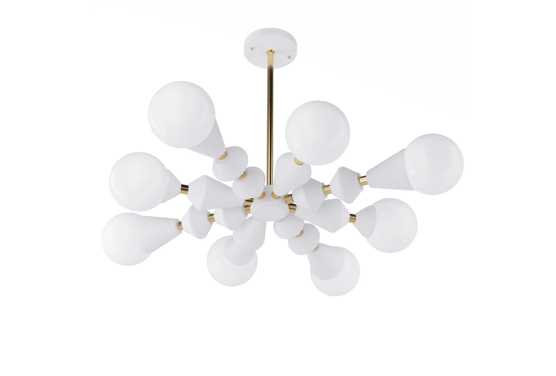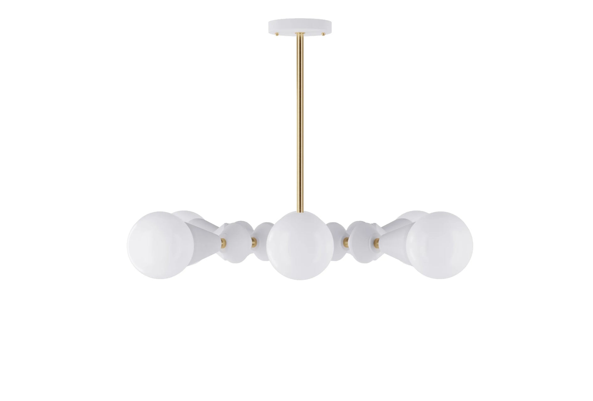 The horizontal structure makes it perfect even for spaces with lower ceilings, and the white glass shades gently diffuse light, creating a warm and inviting atmosphere.