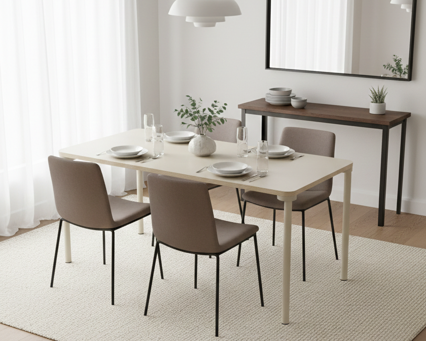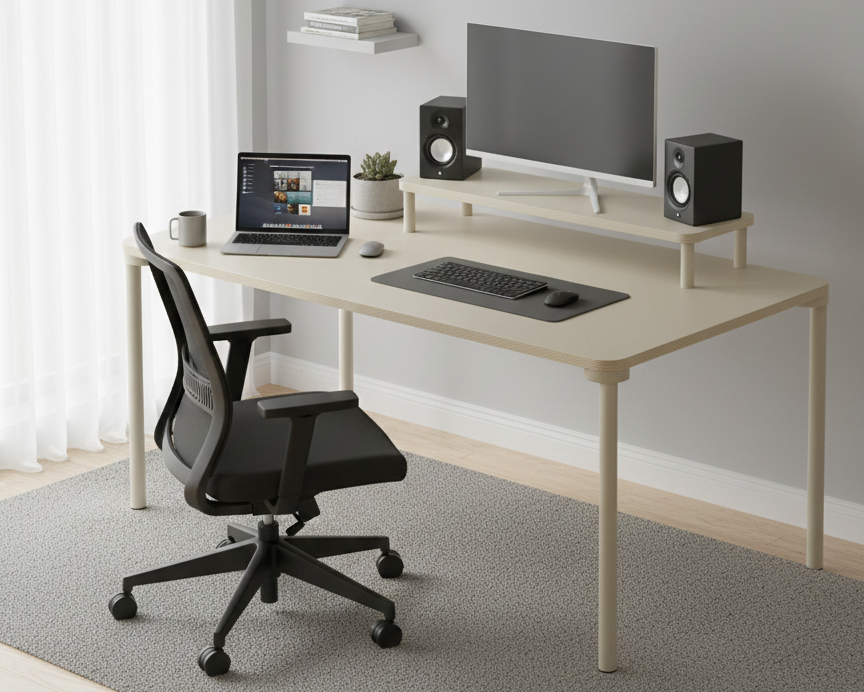 The Pip Office Table is a minimalist office table designed by a Ukrainian designer at Kint, created to serve both functional and aesthetic needs in contemporary work environments. It features a rectangular plywood tabletop with gently rounded corners.