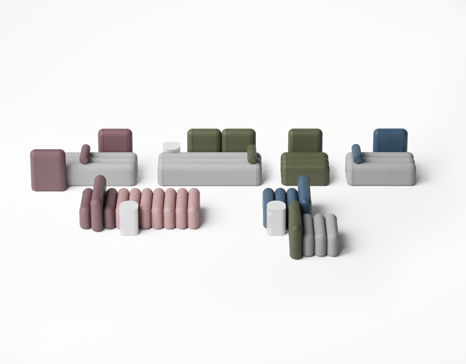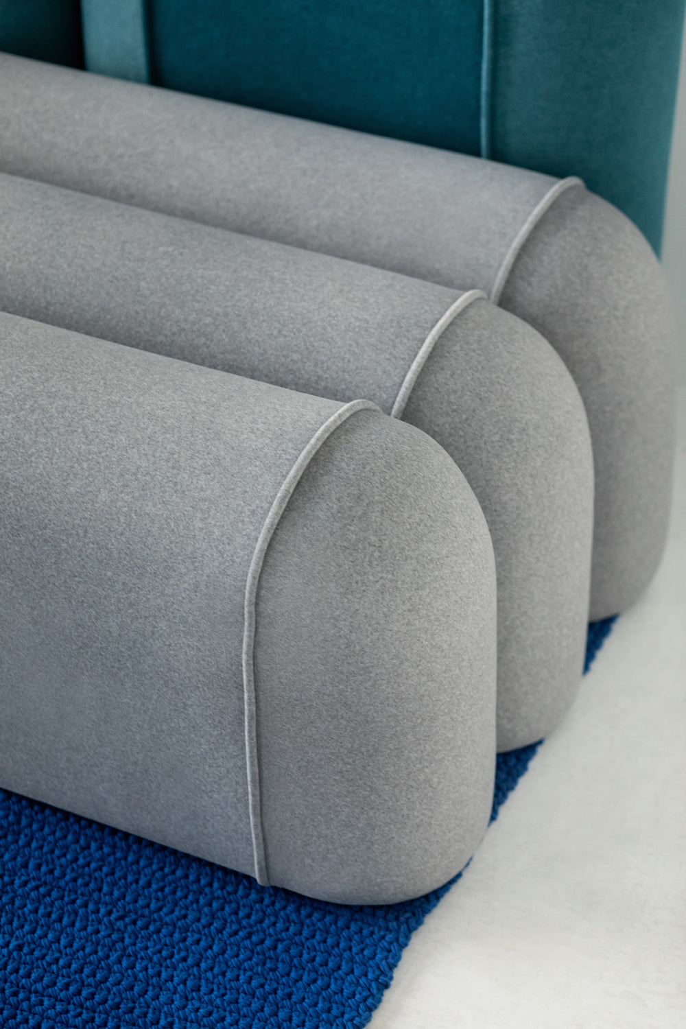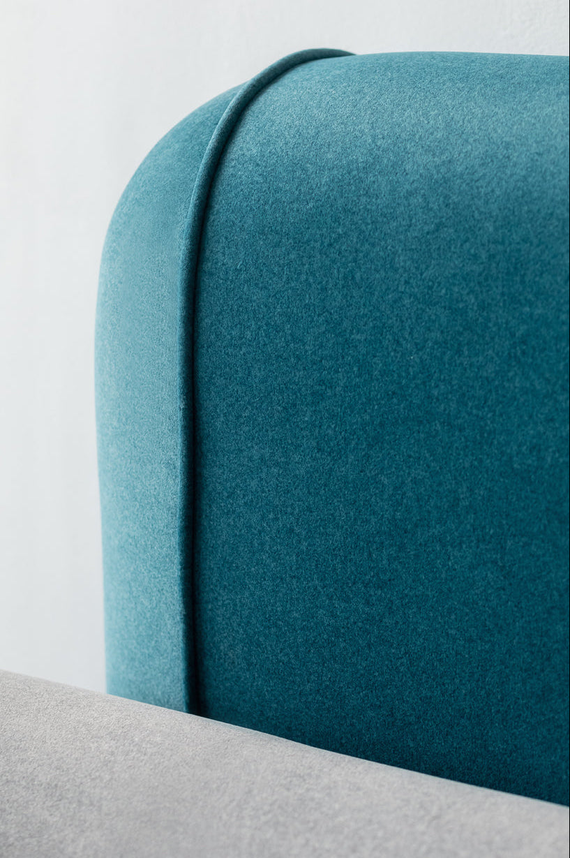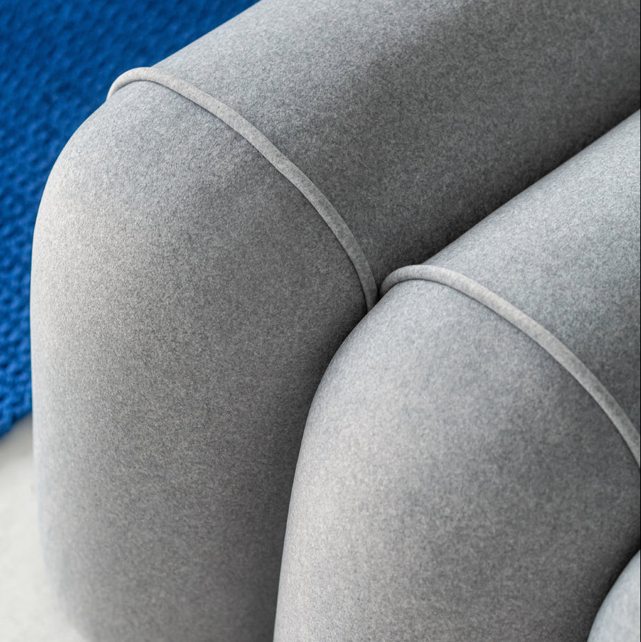 This sofa comprises three horizontal seating segments and two vertical back segments, forming a balanced and proportioned silhouette that supports clear spatial arrangements. The product is customisable by segment count, choice of fabric and colour scheme, allowing precise alignment with project palettes and material briefs.