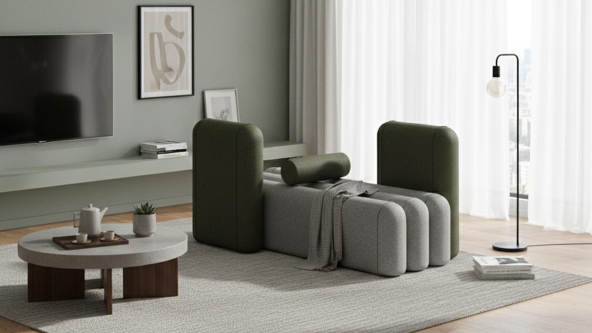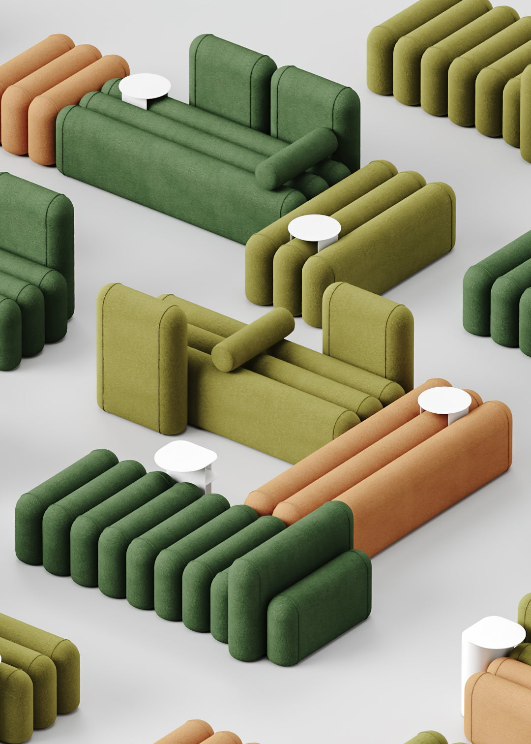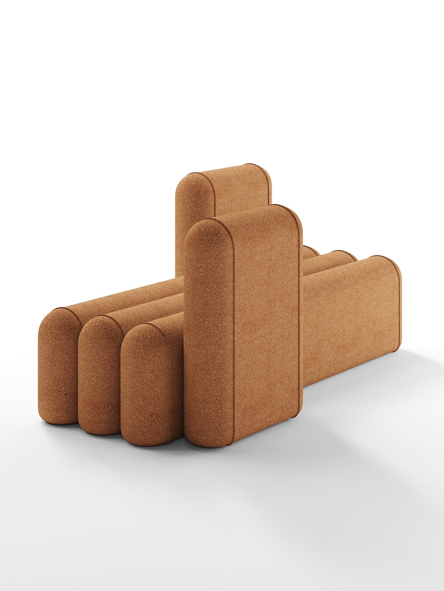 The sofa is fully customisable in premium upholstery fabrics and colour combinations, allowing designers to specify tactile materials that complement bespoke palettes. Options for single‑tone or multi‑colour segment arrangements provide flexibility in material expression as part of interior design, furniture specification and architectural detailing.