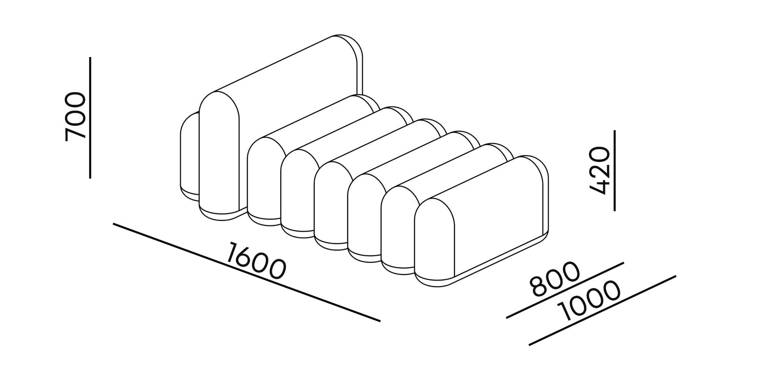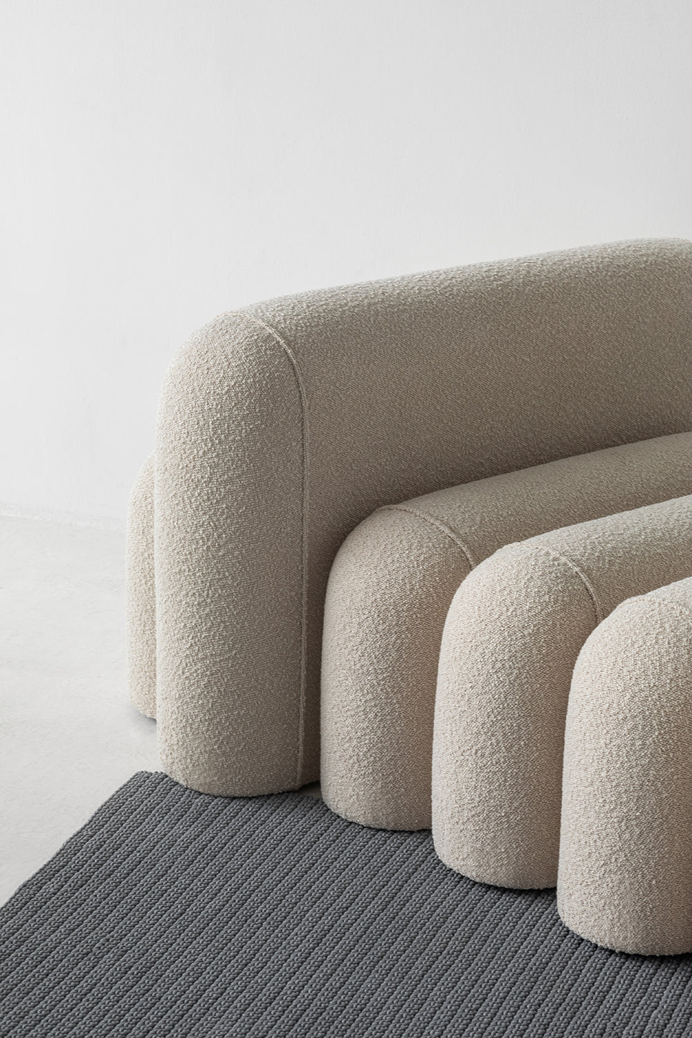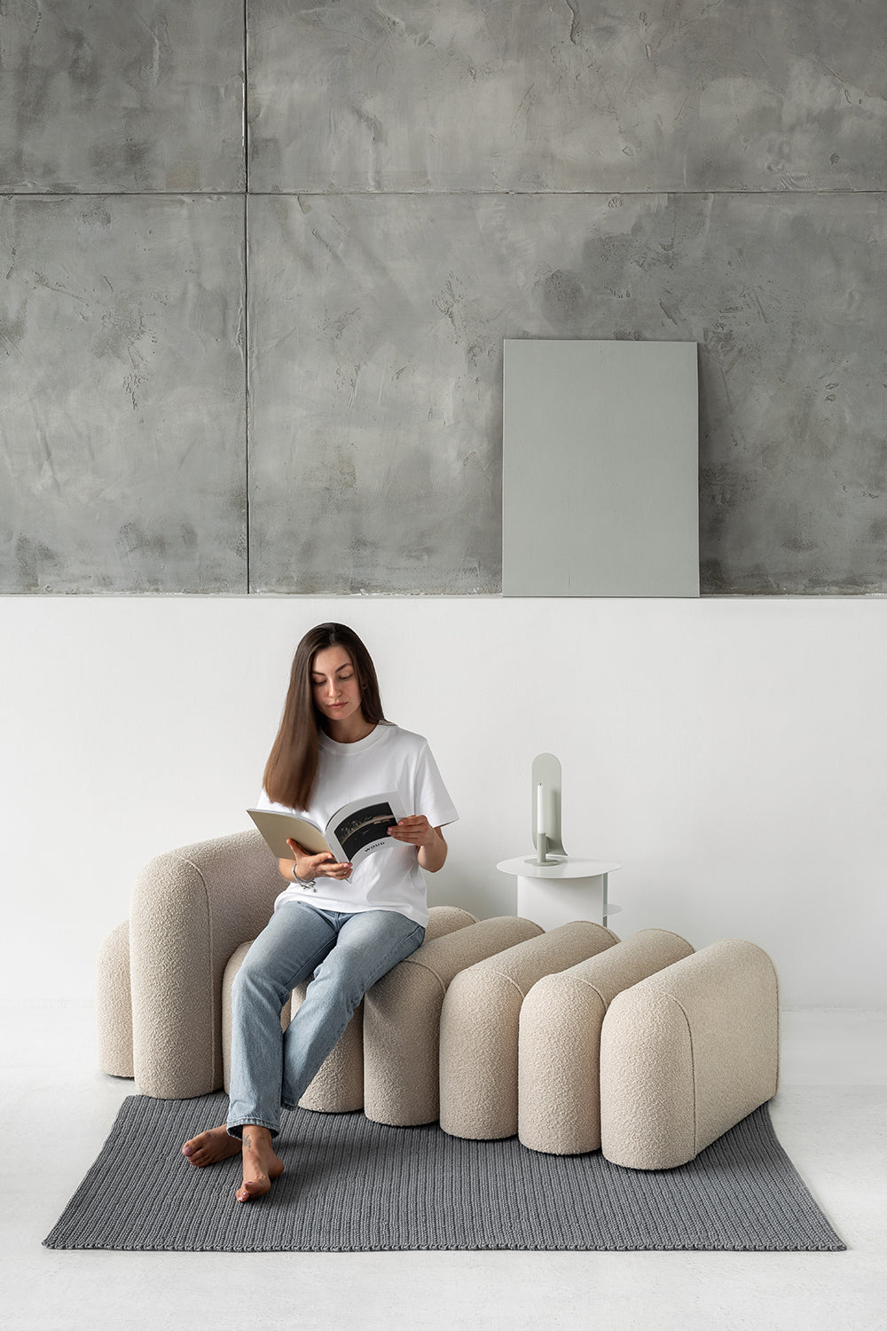 Comprises seven seating segments and one larger back segment, forming a streamlined, minimalist silhouette.