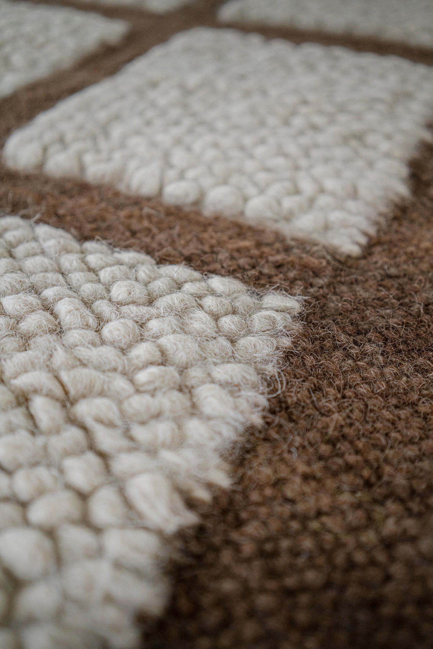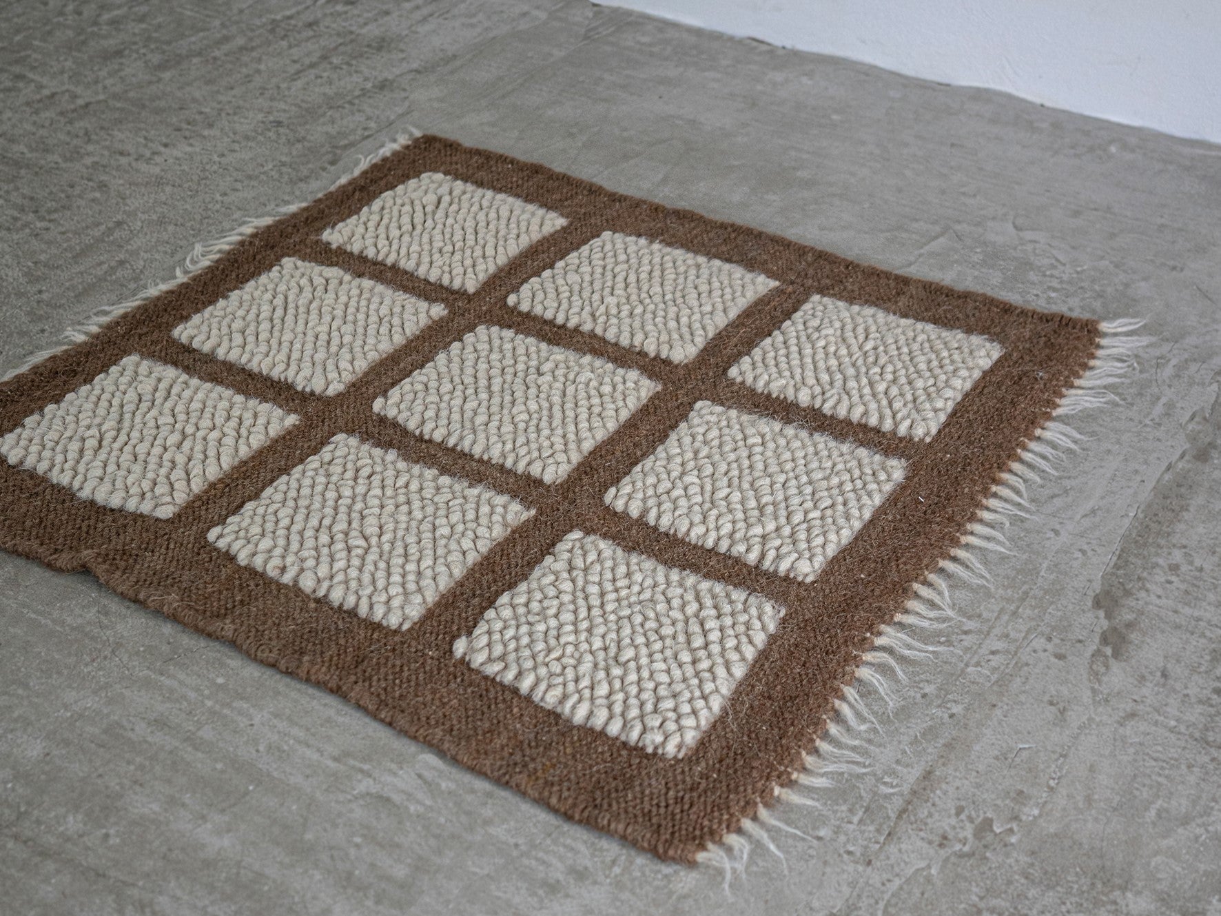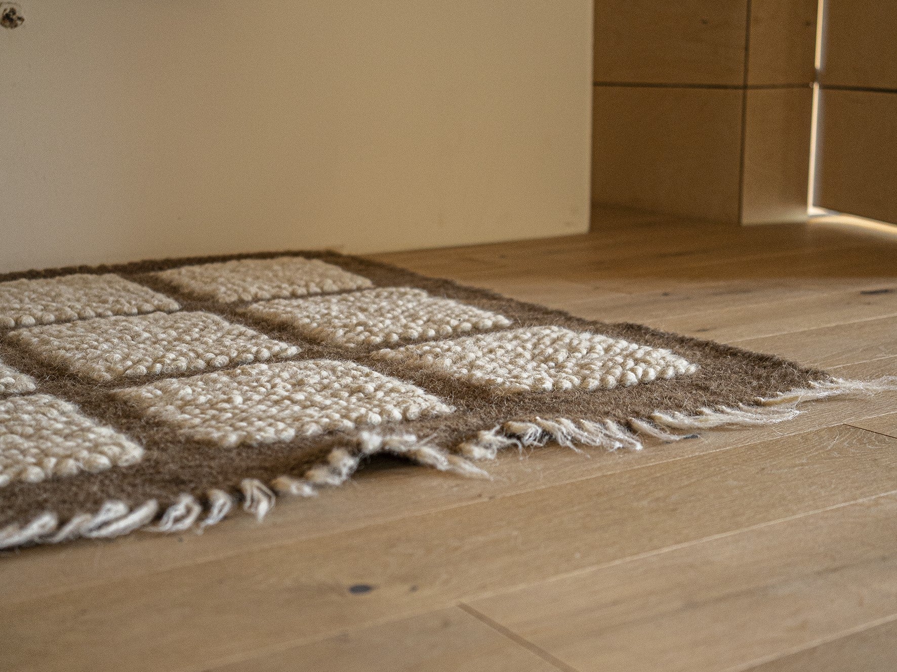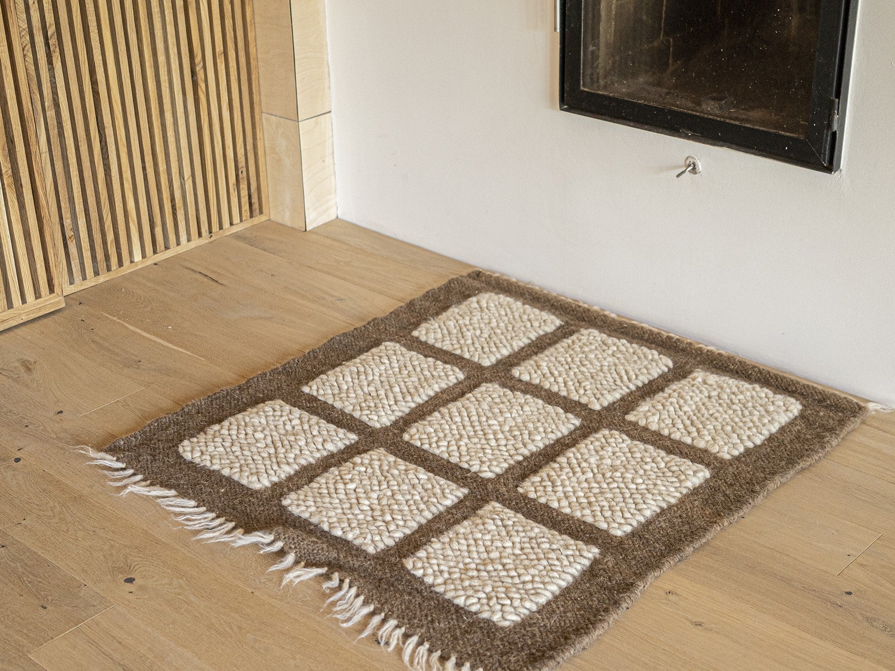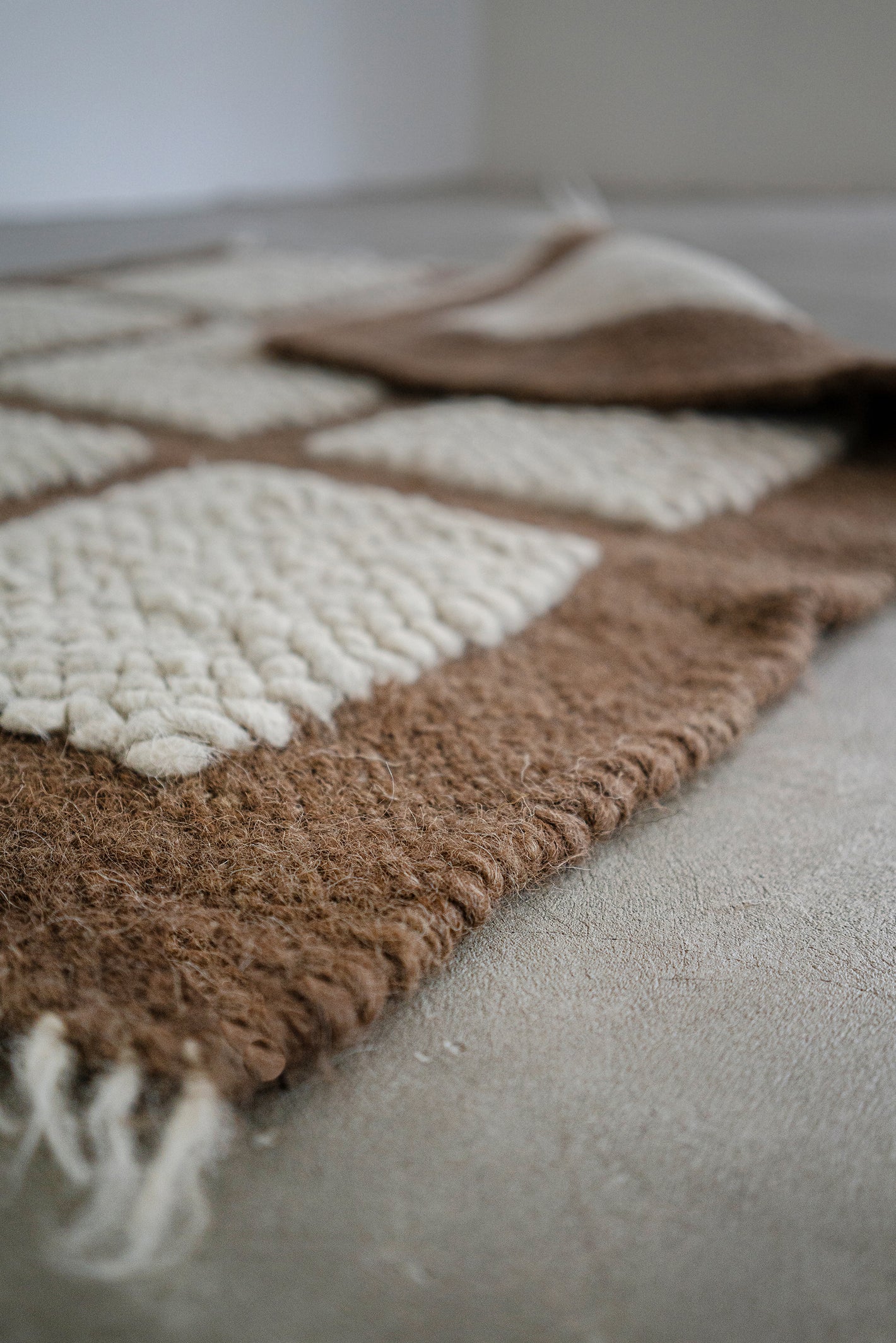 This square-shaped rug, featuring a pattern of squares in brown and beige tones, is more than just a beautiful addition to your space. Crafted from the wool of Carpathian sheep in Ukraine, it offers a luxurious softness underfoot, bringing warmth and comfort to any room. The natural wool provides durability and a cosy texture.