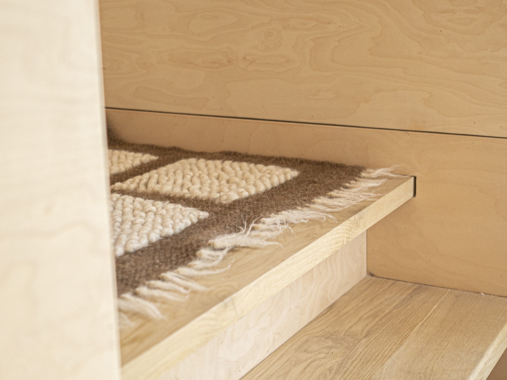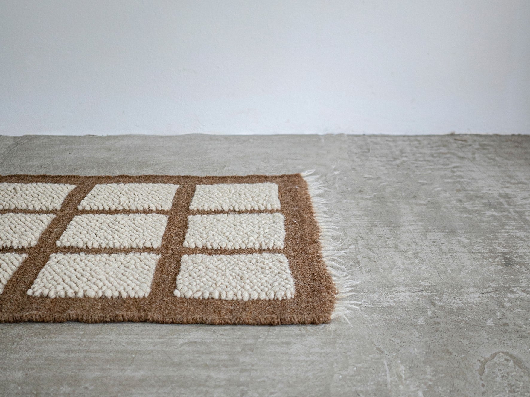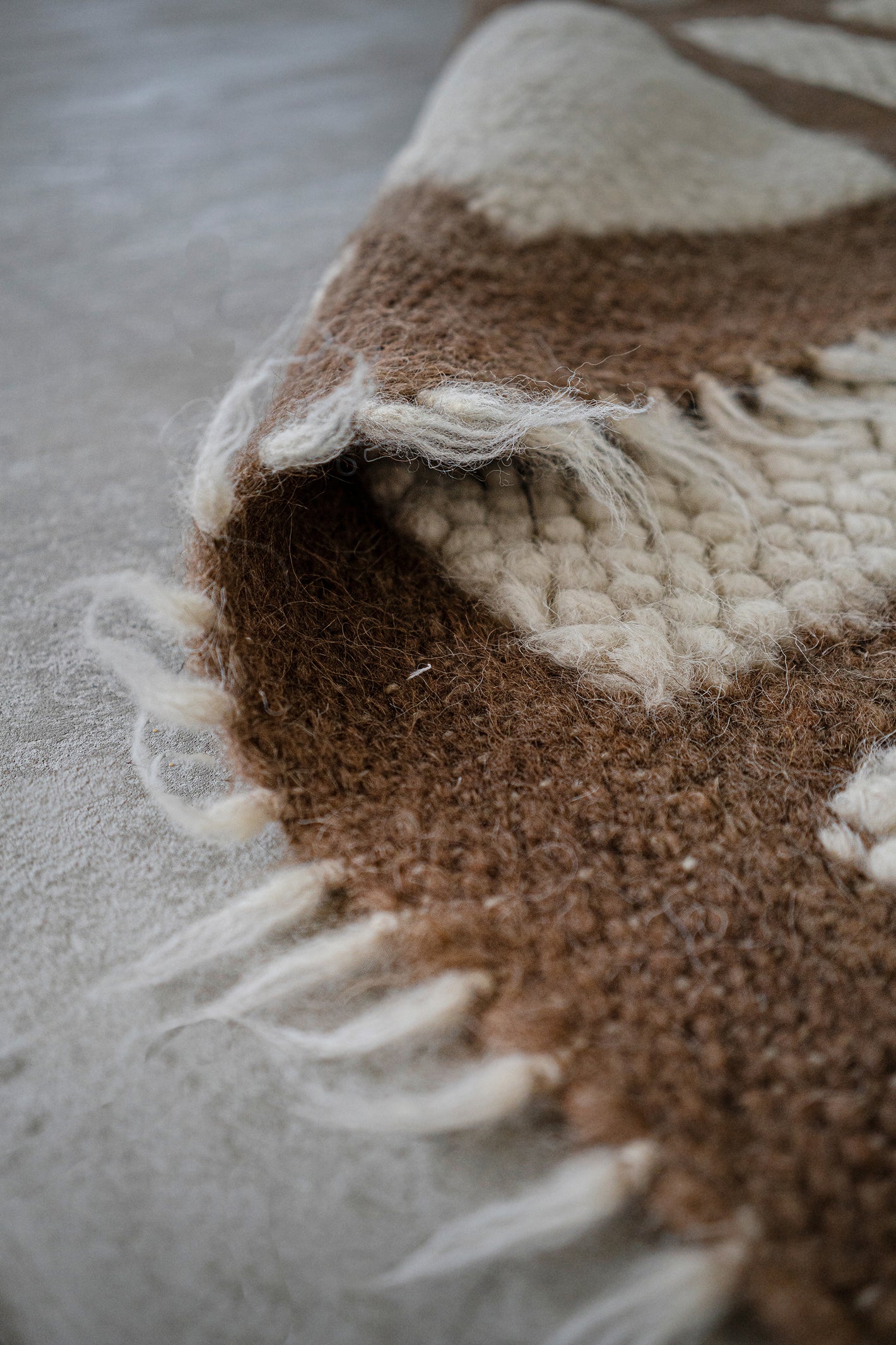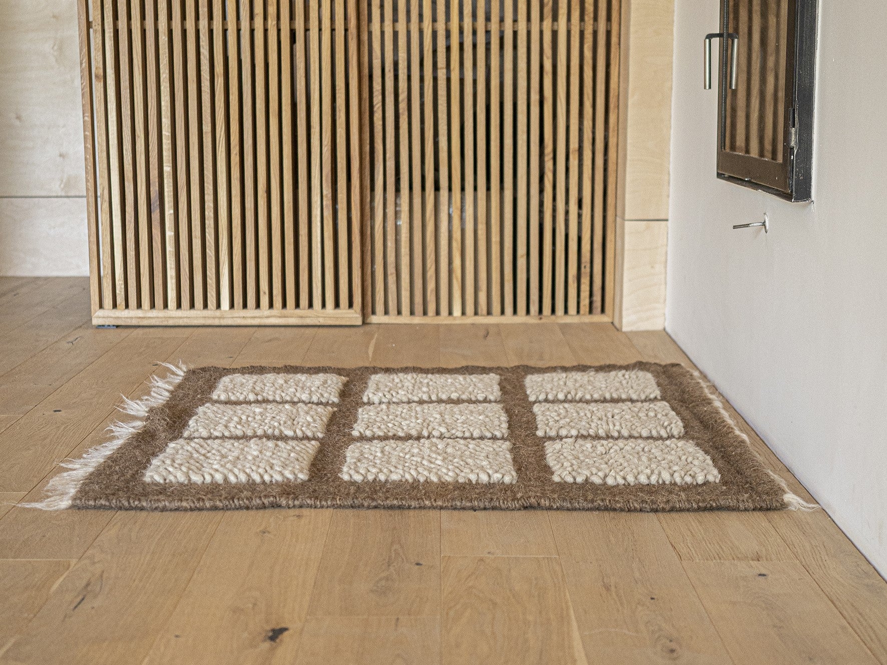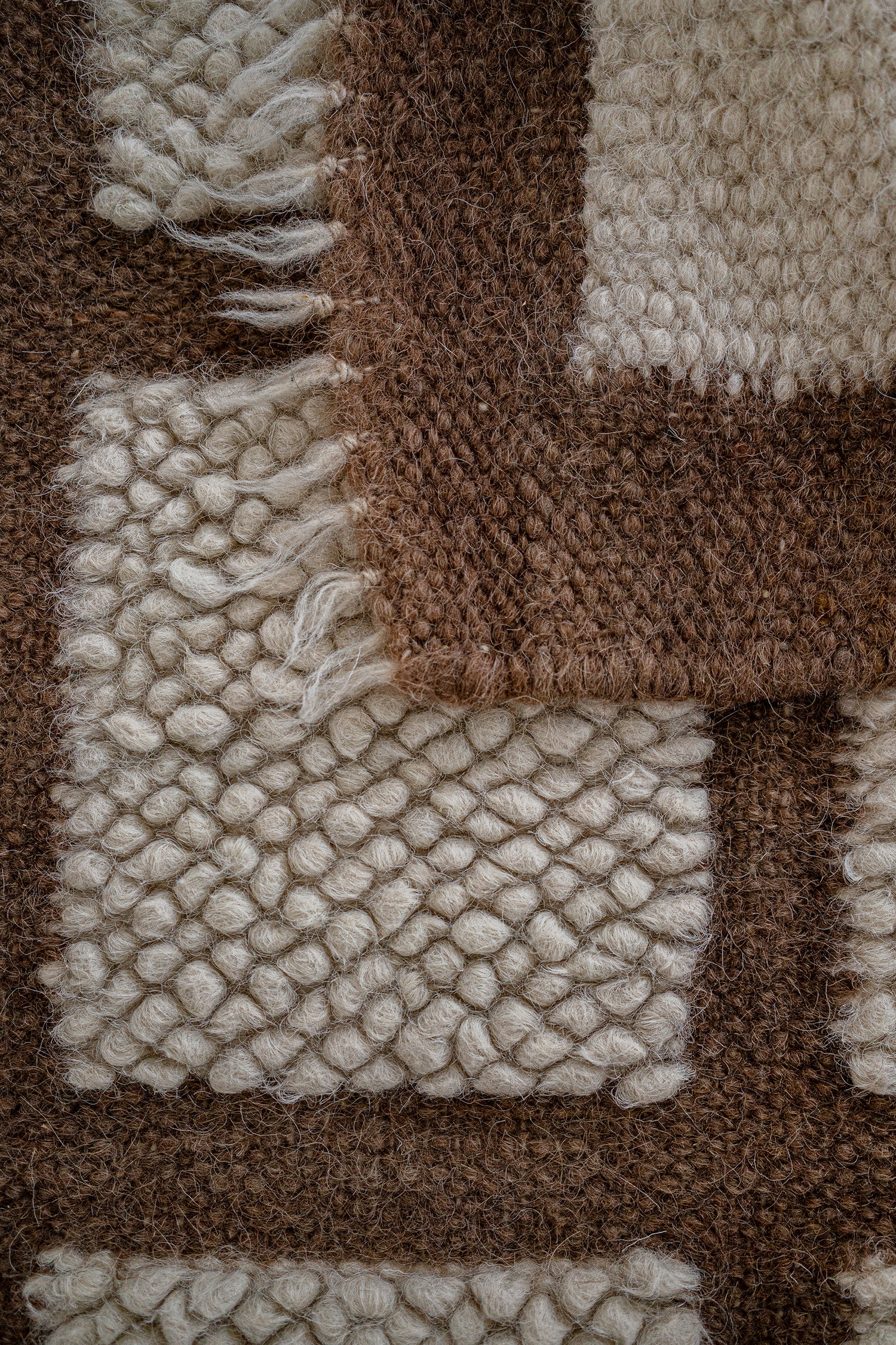 This square-shaped rug, featuring a pattern of squares in brown and beige tones, is more than just a beautiful addition to your space. Crafted from the wool of Carpathian sheep in Ukraine, it offers a luxurious softness underfoot, bringing warmth and comfort to any room. The natural wool provides durability and a cosy texture.