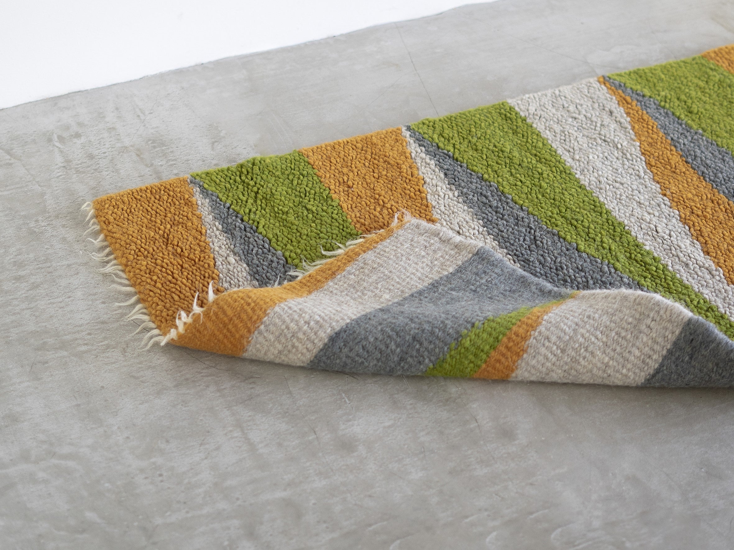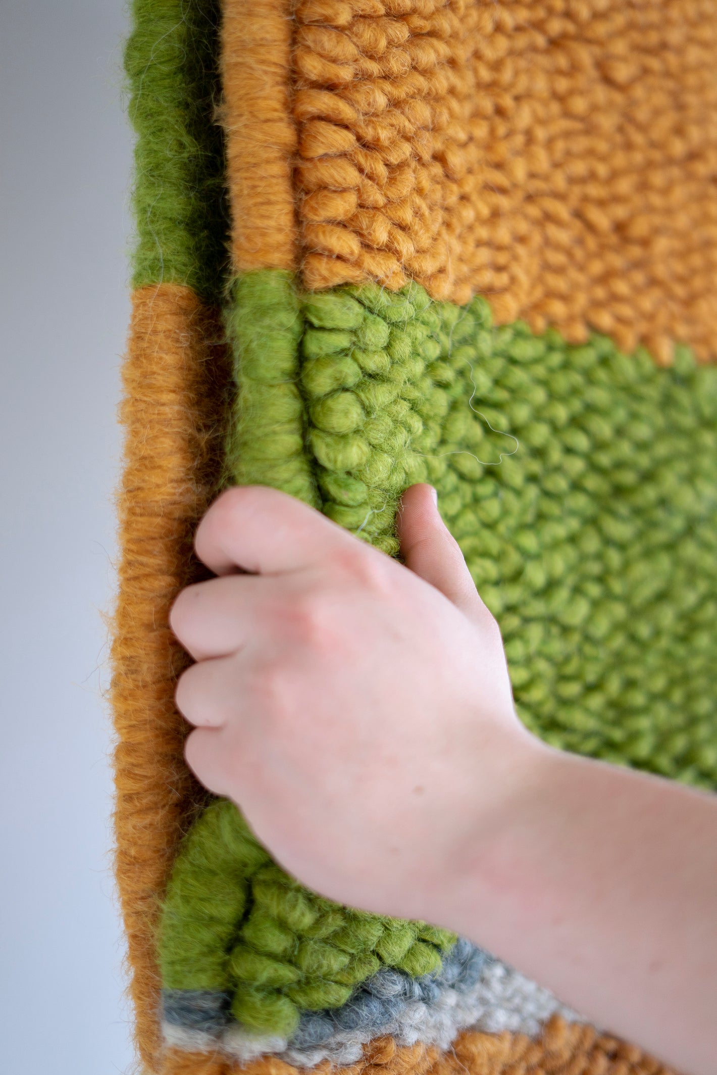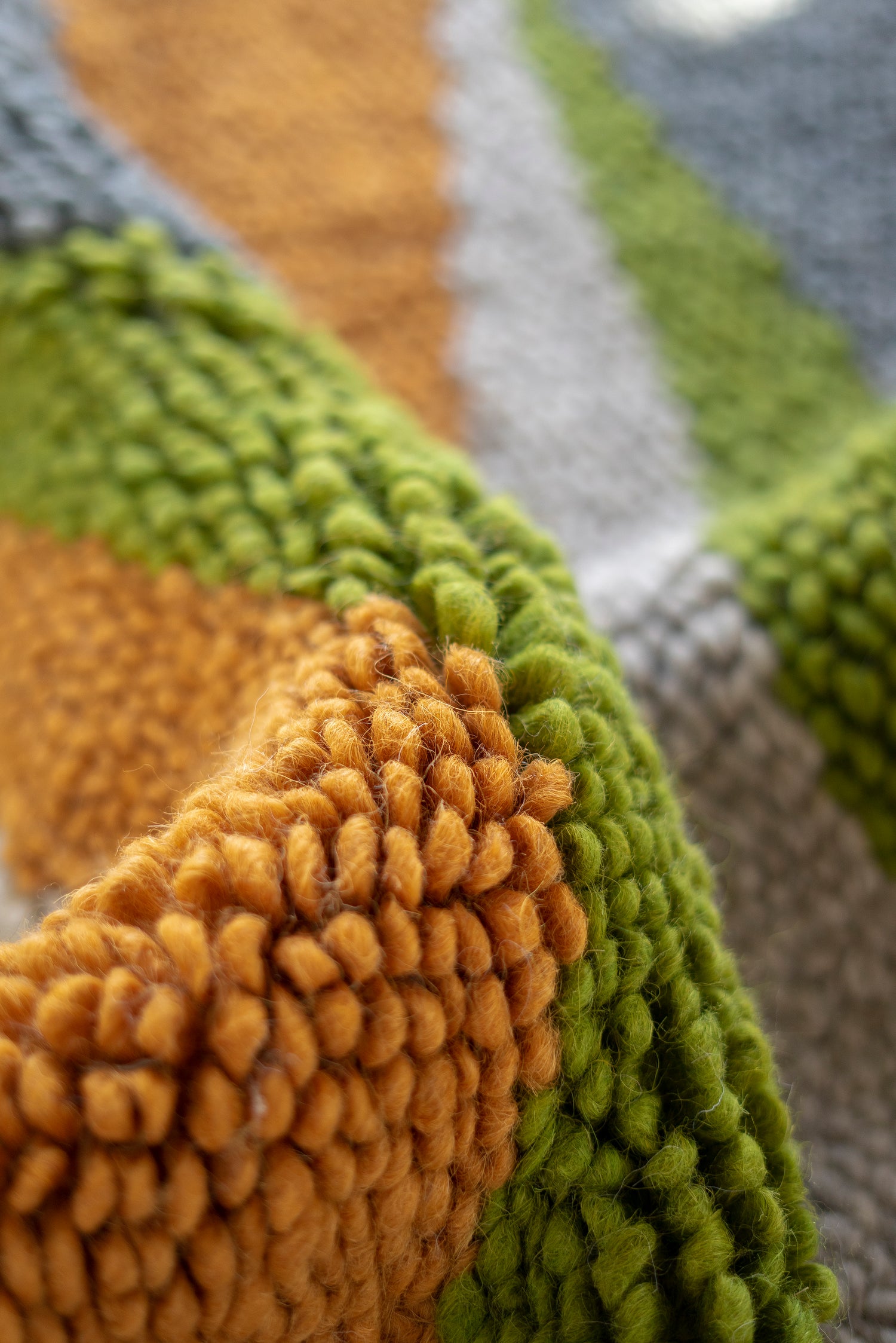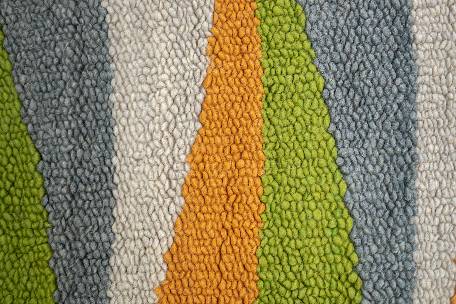 This bright rug, featuring colours like orange, light green, white, and grey, brings liveliness and colour to any room. Crafted from 100% Ukrainian sheep's wool, it offers both quality and warmth, making it a standout piece that not only enlivens your space but also adds a touch of authenticity and natural comfort.