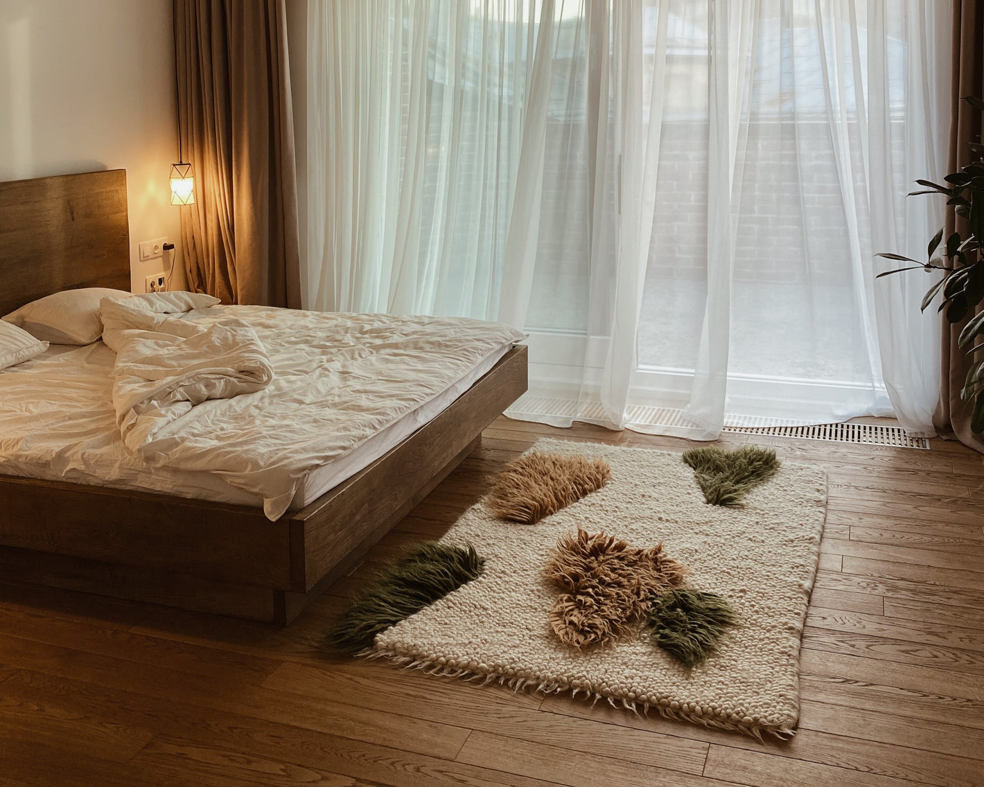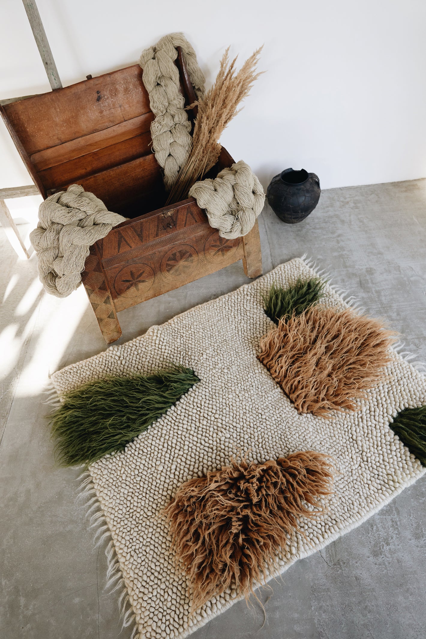 This rug brings a touch of mountain meadows into your home, evoking the essence of autumn with its colours inspired by needles and dry grass. Its design offers a unique blend of serene mountain ambiance and artistic flair, making it an ideal choice for creating a tranquil retreat. As a perfect island of nature in your living space, this rug infuses your home with a calming, earthy atmosphere.