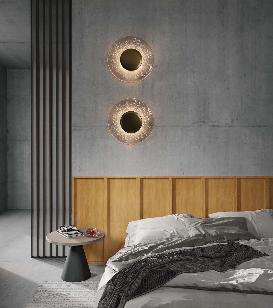 The handcrafted brass disc at the sconce’s centre is cast in a mould by skilled artisans, with a choice between smooth or textured finishes. The glass, also handmade by master glassblowers, gives each disc its unique texture.