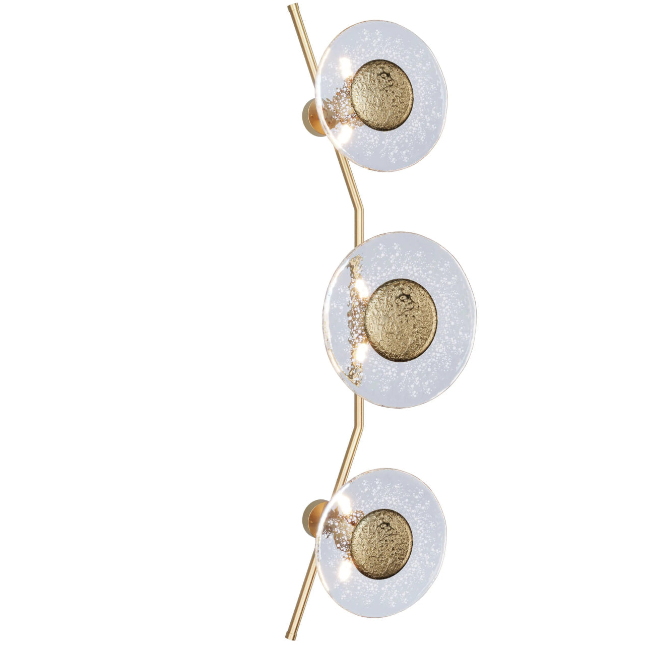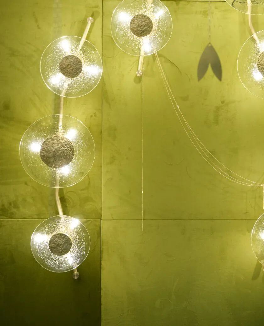 This sconce includes three glass discs and measures a total of 105 cm in height. For a larger statement piece, the series also includes the Sprinkled Glass 5, featuring five glass discs. It looks best on walls with minimal surrounding decor to allow its unique beauty to shine.