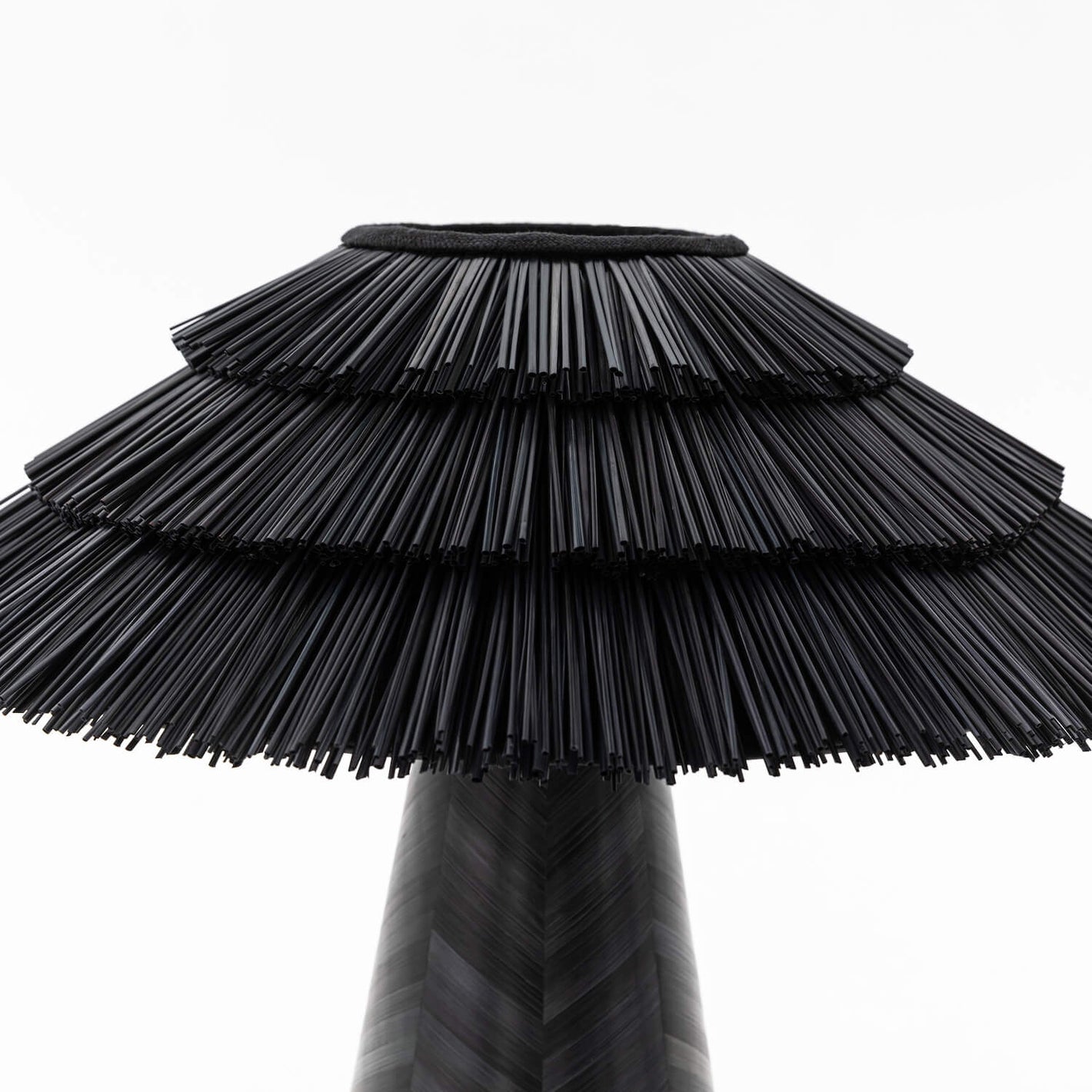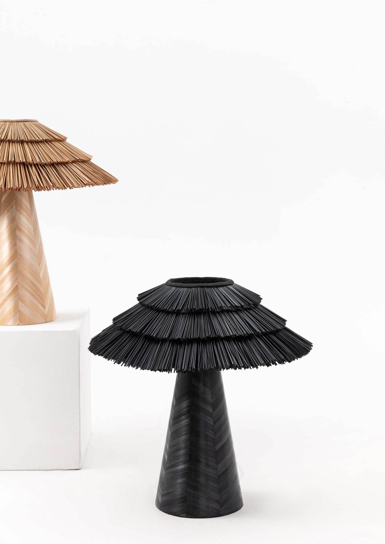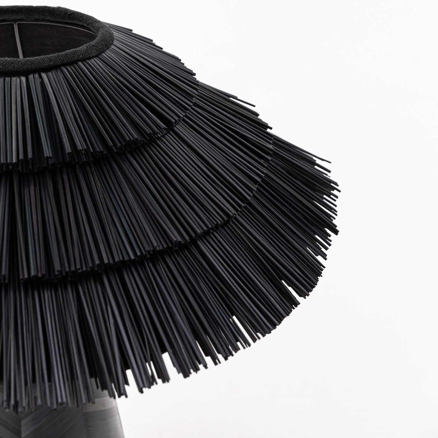 Available in two colours: Beige or Black soil, these table lamps boast dimensions of 45x45 cm. The materials used are of the highest quality, with a wooden base, metal lampshade frame, and intricate inlay of dyed rye straw and homespun canvas.