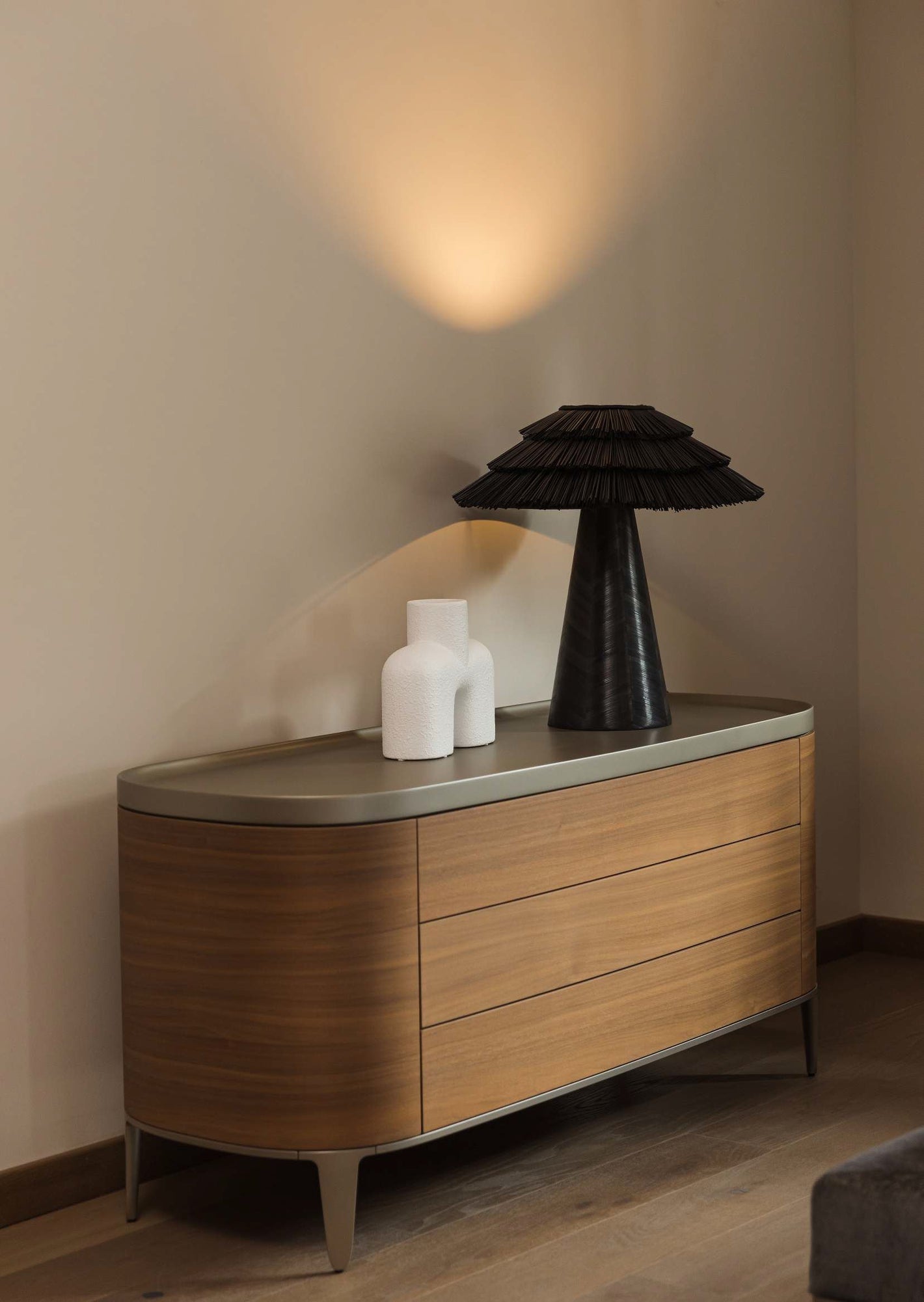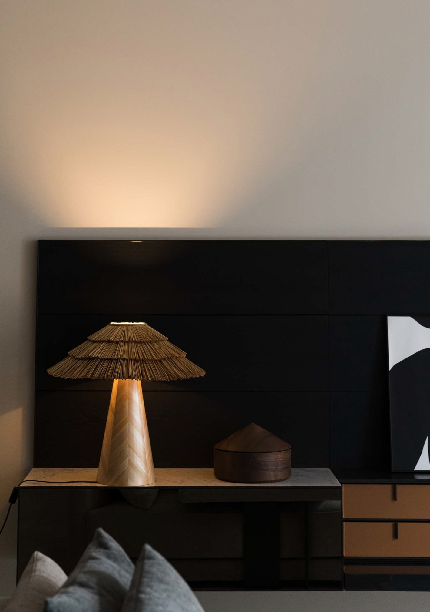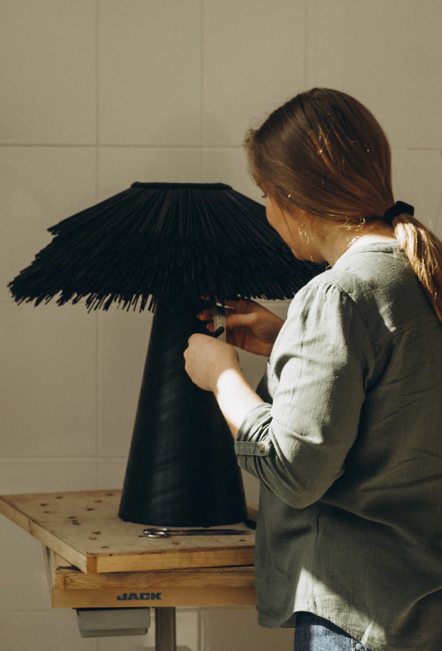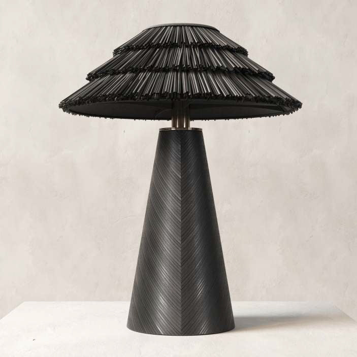 Available in two colours: Beige or Black soil, these table lamps boast dimensions of 45x45 cm. The materials used are of the highest quality, with a wooden base, metal lampshade frame, and intricate inlay of dyed rye straw and homespun canvas.