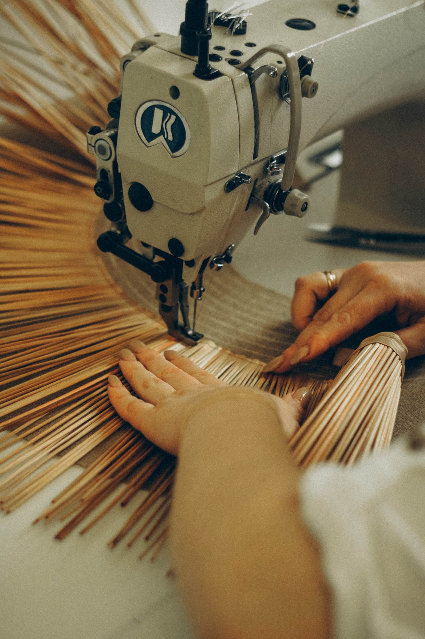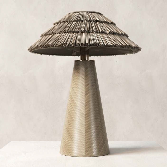 The ROOTS OF HOME lamp showcases an artistic blend of metal, homespun canvas, and dyed rye straw, evoking the essence of our ancient heritage.