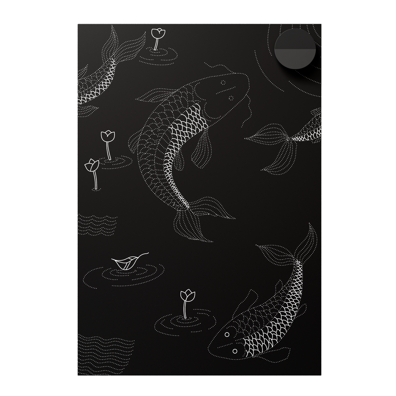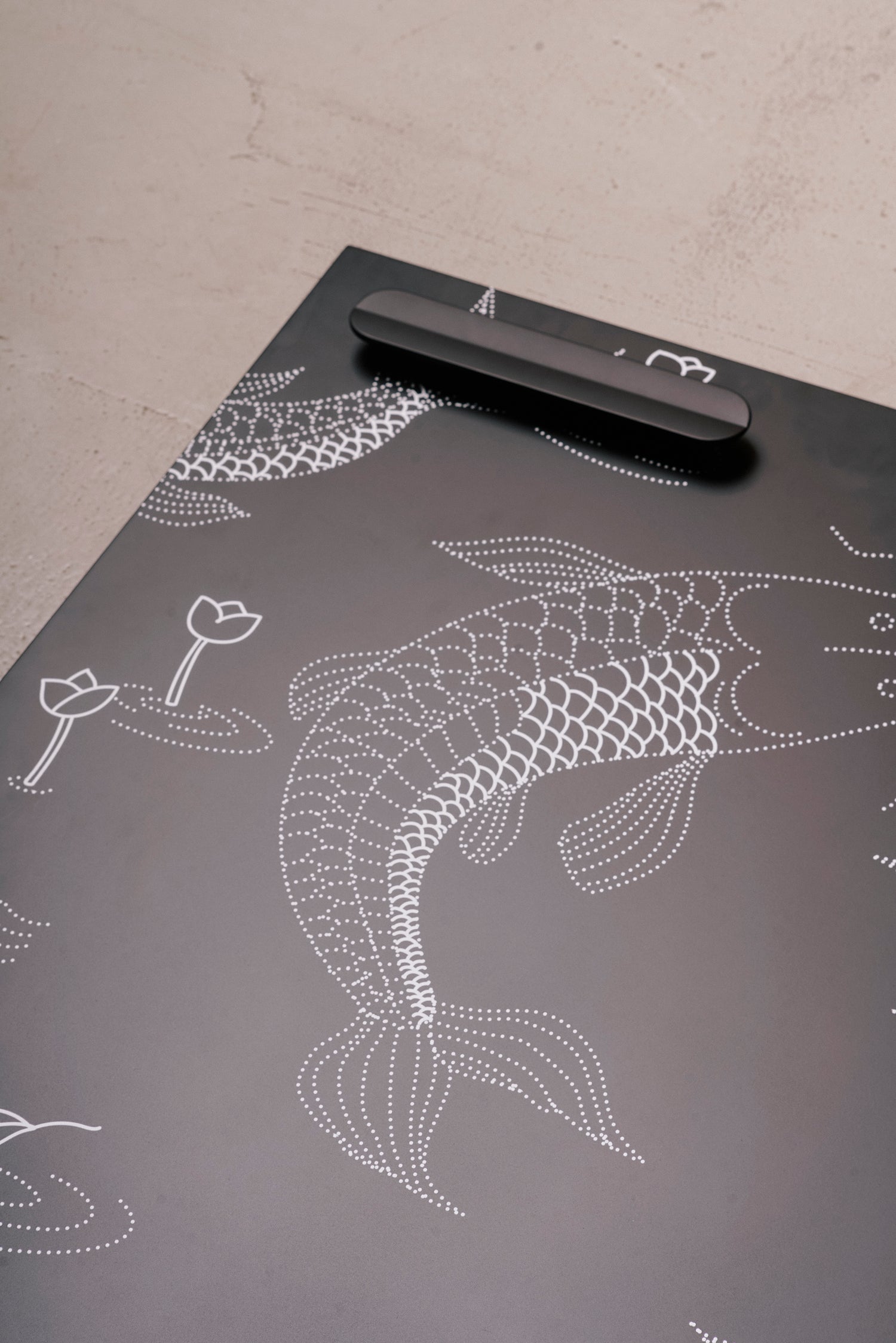 The facade design on this kitchen uses a tattoo-like technique, where solid lines transition into dotted ones, creating a distinctive and intriguing pattern that's uncommon in kitchen designs. This unique look is sure to catch the eye. All exterior surfaces are made from durable materials that resist fingerprints, ensuring a long-lasting and low-maintenance finish.